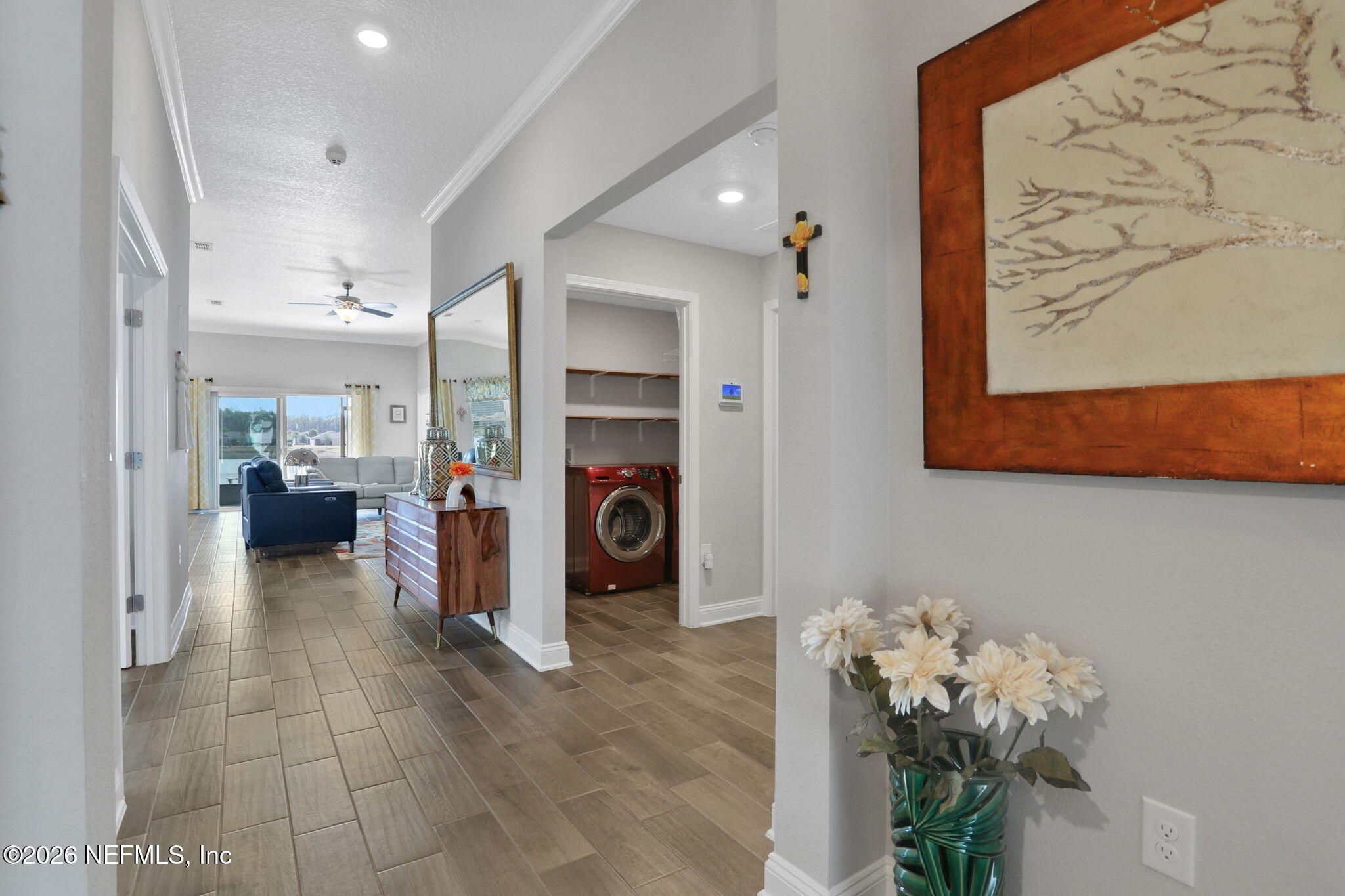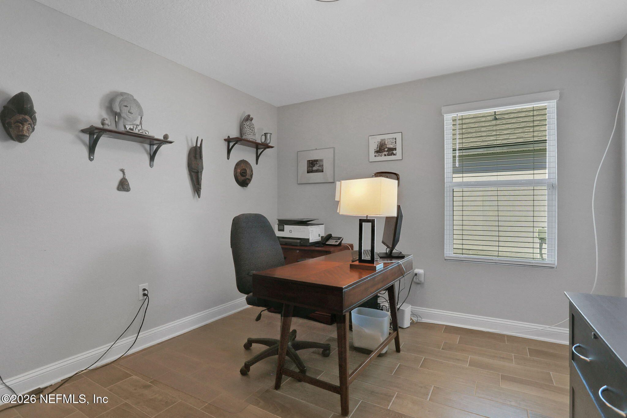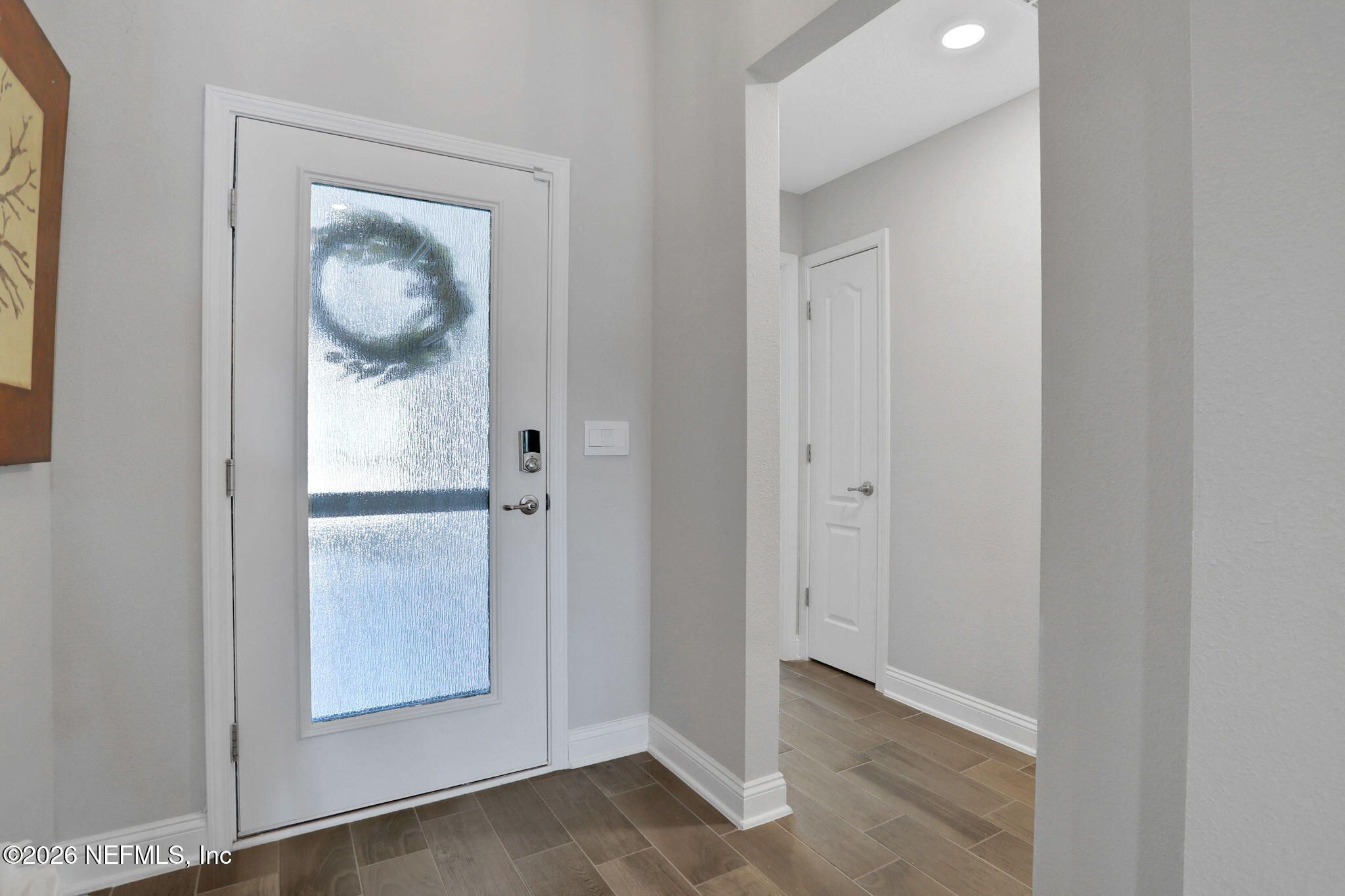 STUNNING BETTER THAN NEW DALTON FLOORPLAN ON A GRAND & EXPANSIVE POND W/ PLENTY OF DUCKS TO KEEP YOU COMPANY! Inside you will find three bedrooms & a lovely office/fourth bedroom with owner's suite in the back corner tucked privately. Wood grain plank tile flooring extends thru most every space in the home. Kitchen is open w/ prep island & bartop seating, light style quartz, 42in shaker cabinetry & ample recessed LED lighting. The lanai has been extended w/ screen & open space for entertaining & room for a summer kitchen. Large laundry room with wraparound shelving & multiple linen closets/walk-in closets provide for storage space. The community is gated with all the preferred amenities - fitness, pool, pickleball & more! I-95 is easily accessible within minutes.
