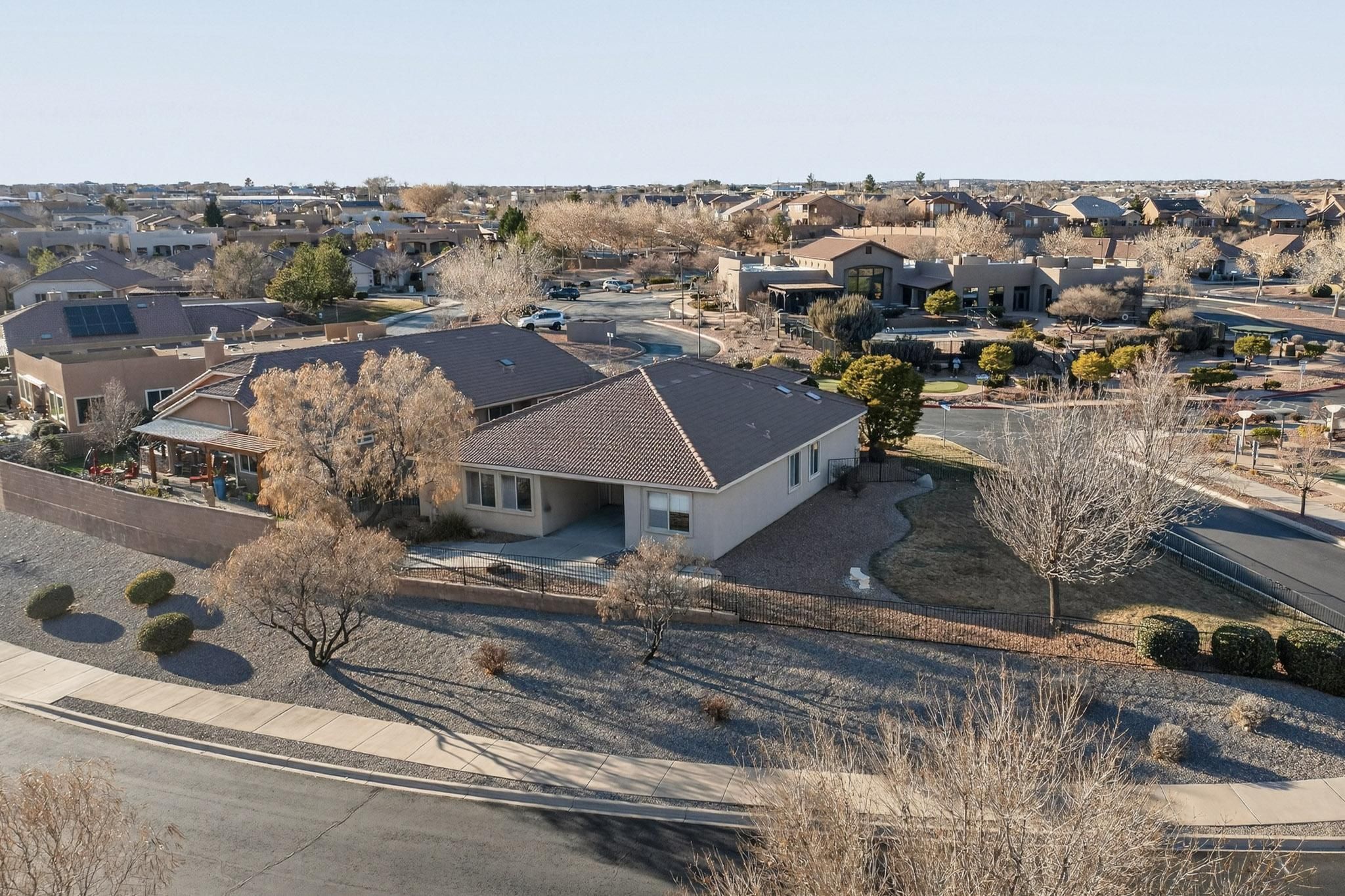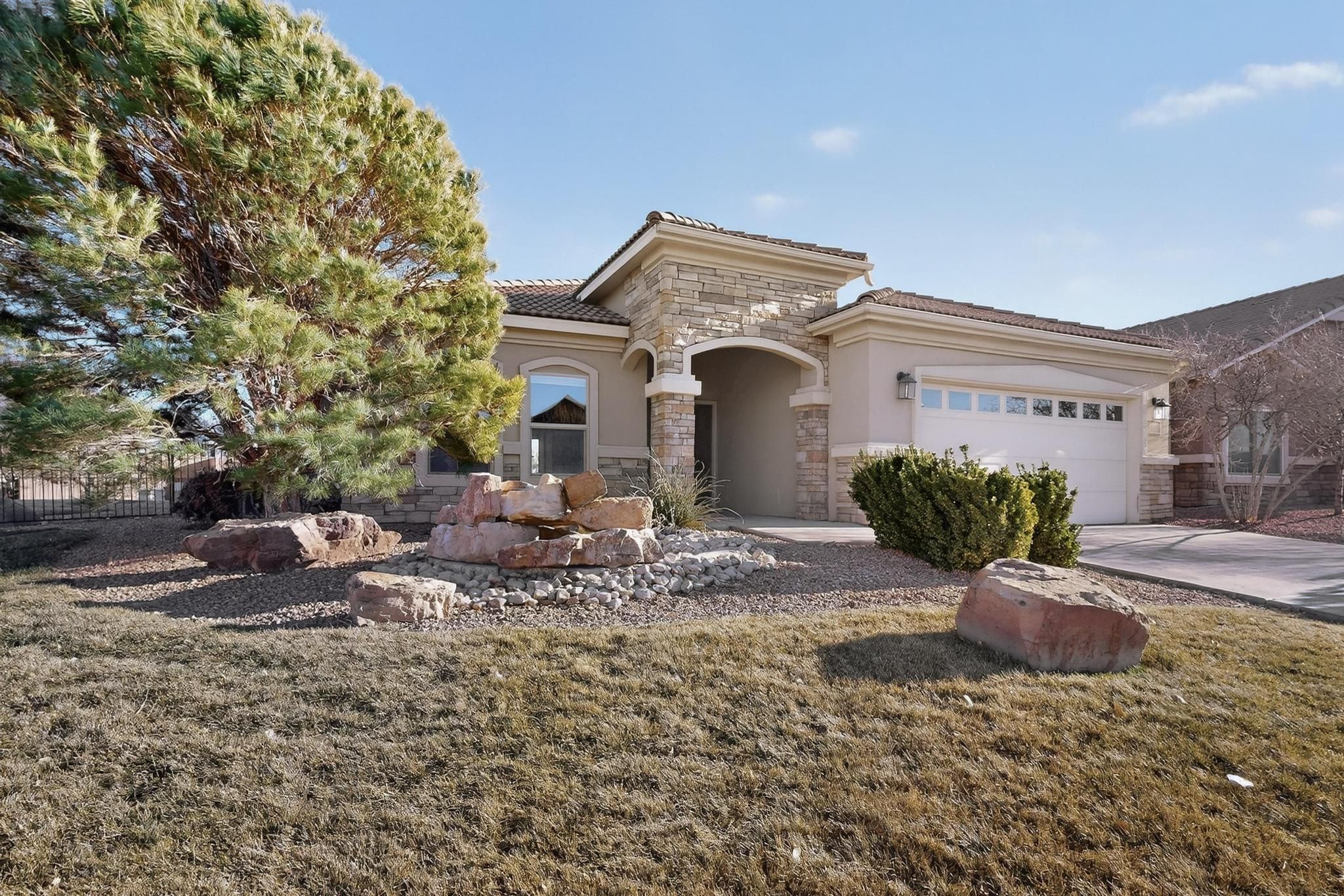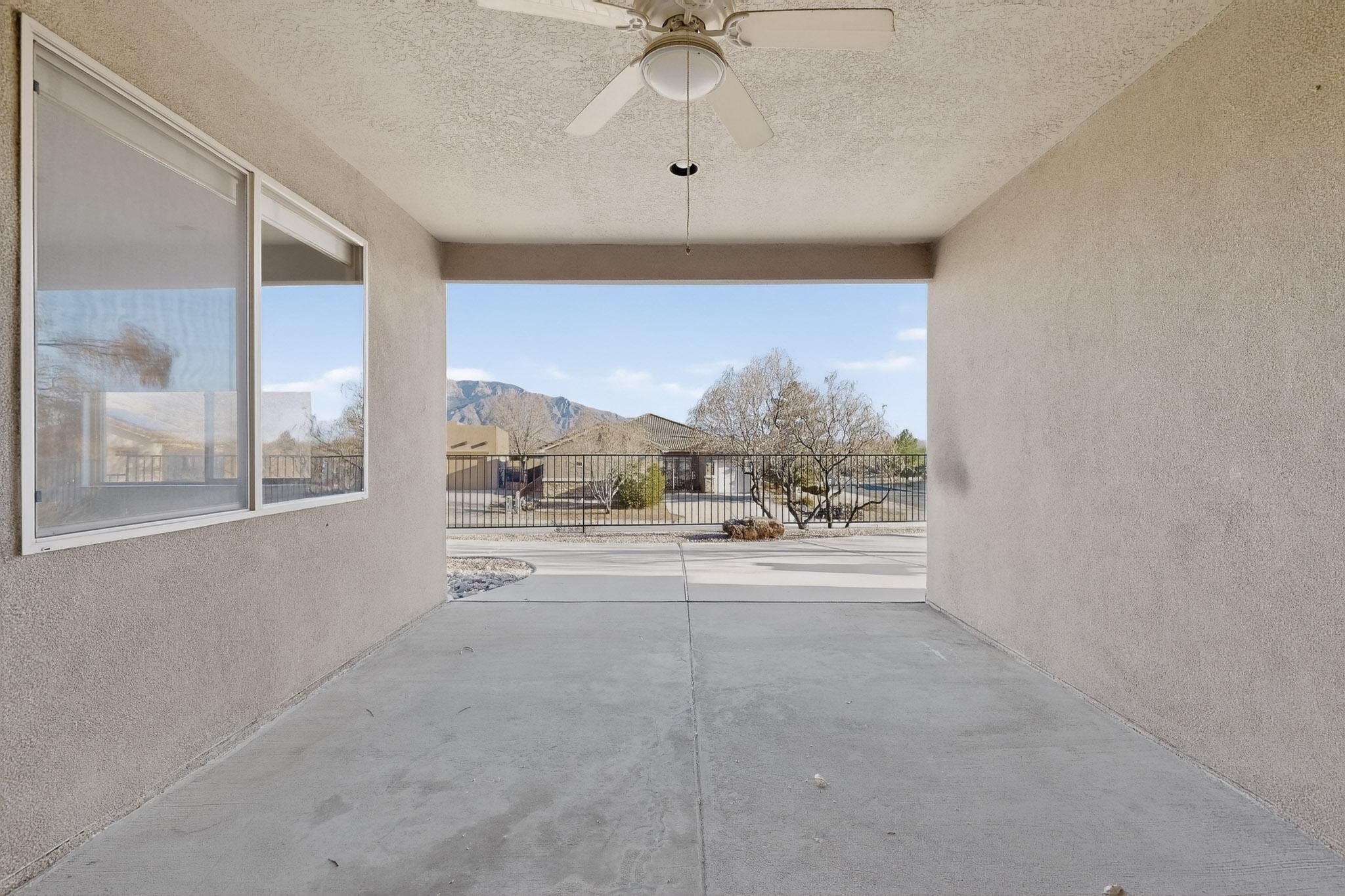 Rare oversized & elevated corner lot in Alegria with breathtaking Sandia Mountain views! Just steps from the clubhouse, this home offers refined details throughout! The gourmet kitchen features expansive granite counters, center island, tiled backsplash, walk-in pantry, and a gas stub option at the cooktop. The luxurious primary suite includes an atrium door to the patio, corner jetted tub, oversized walk-in shower with bench and a spacious walk-in closet. Recent improvements include fresh paint, new carpet and a NUVO(r) water filtration and softener system. The fully fenced backyard is a true showpiece, complete with extended patio, grass, fountain, auto sprinklers, drip irrigation, gas loop and a large covered patio designed for effortless outdoor living and entertaining. Welcome home!