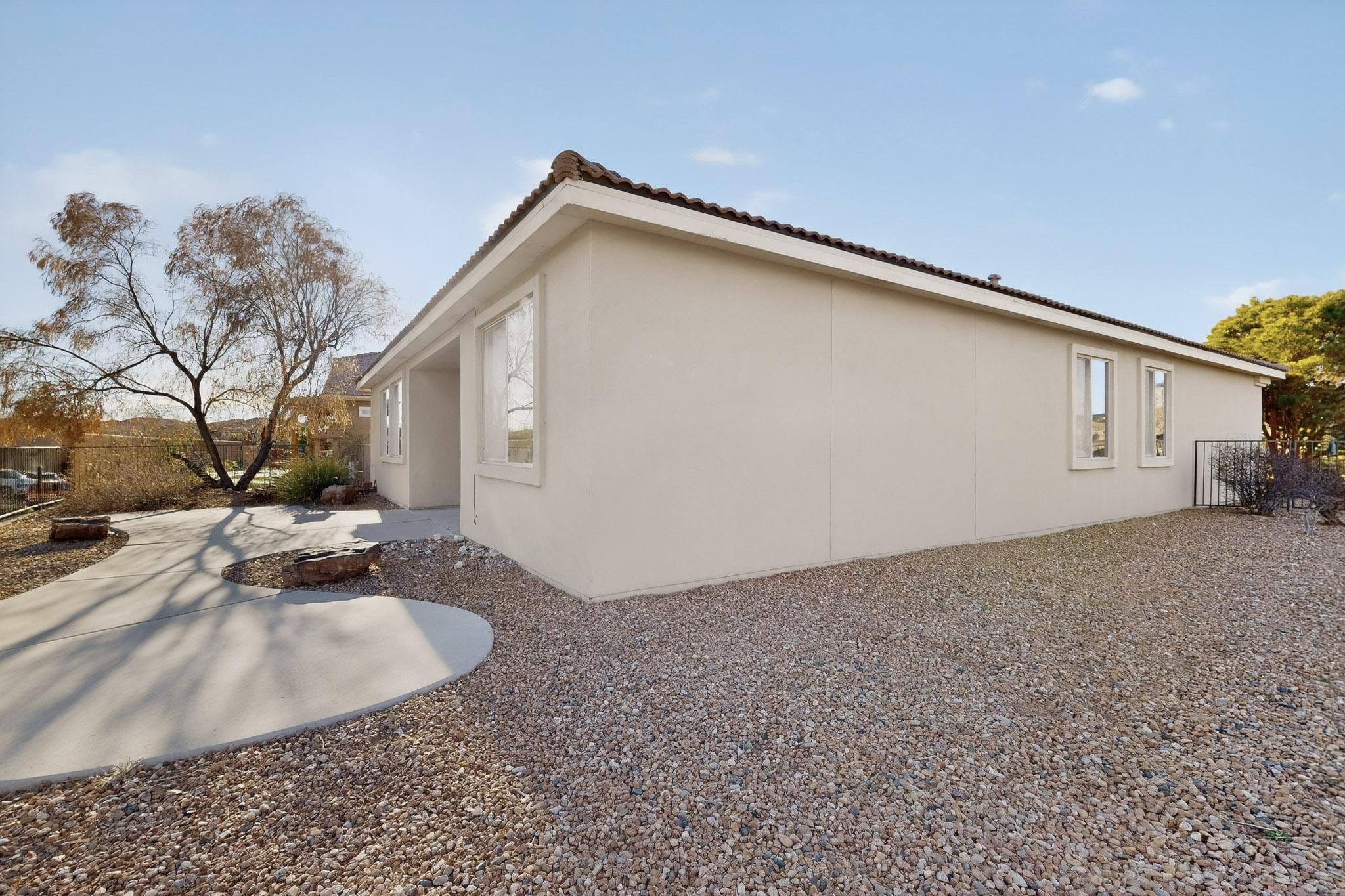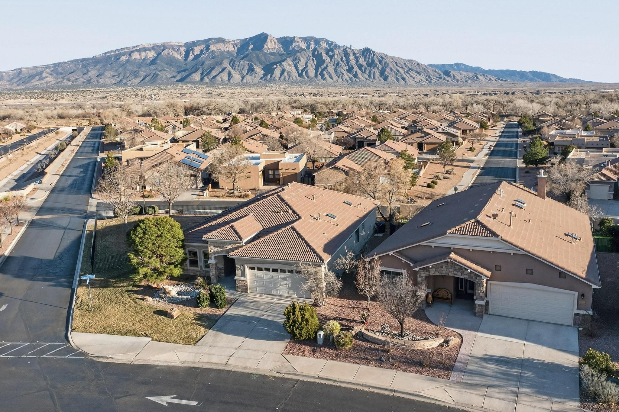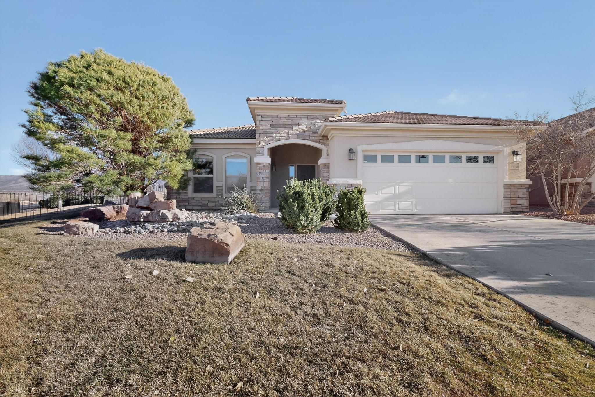 Rare oversized & elevated corner lot in Alegria with breathtaking Sandia Mountain views! Just steps from the clubhouse, this home offers refined details throughout! The gourmet kitchen features expansive granite counters, center island, tiled backsplash, walk-in pantry, and a gas stub option at the cooktop. The luxurious primary suite includes an atrium door to the patio, corner jetted tub, oversized walk-in shower with bench and a spacious walk-in closet. Recent improvements include fresh paint, new carpet and a NUVO(r) water filtration and softener system. The fully fenced backyard is a true showpiece, complete with extended patio, grass, fountain, auto sprinklers, drip irrigation, gas loop and a large covered patio designed for effortless outdoor living and entertaining. Welcome home!