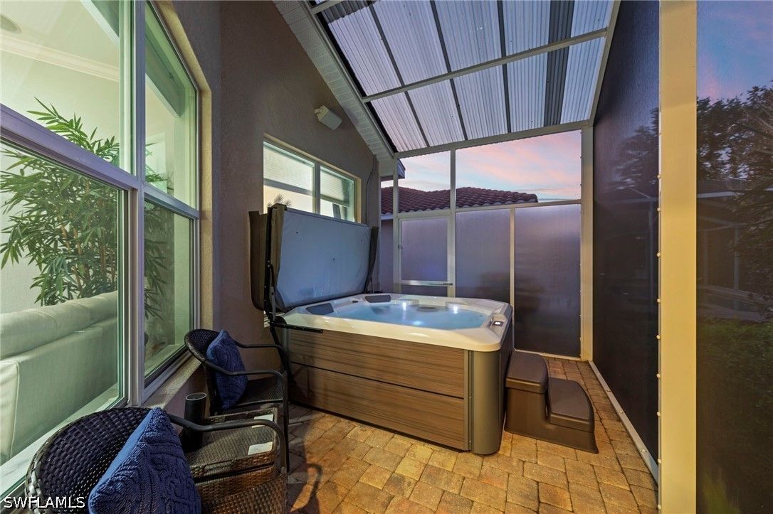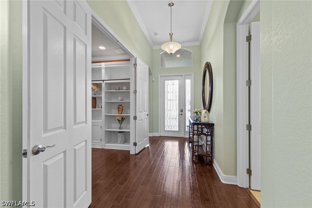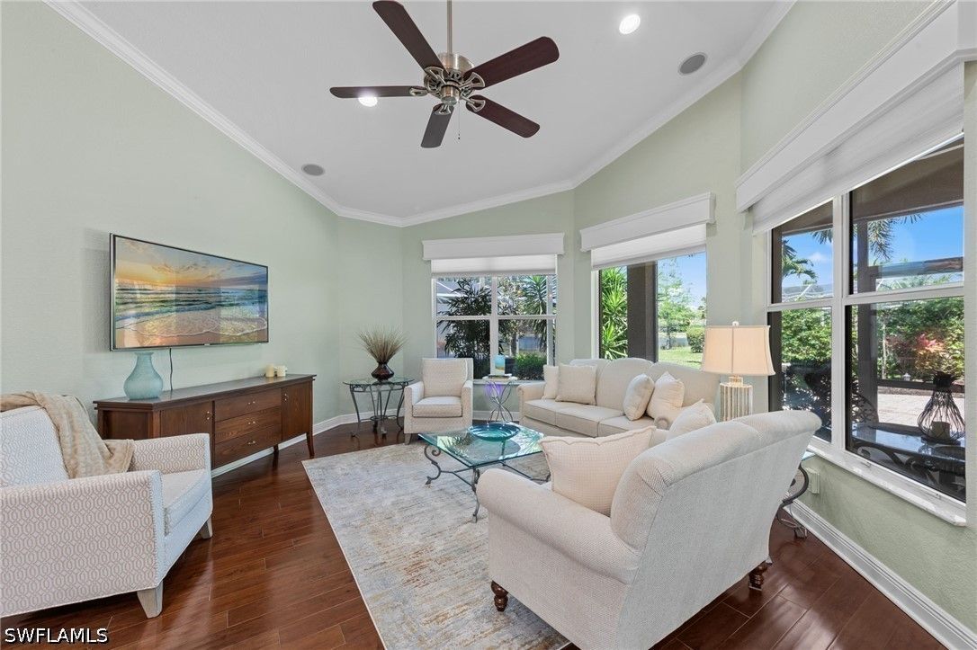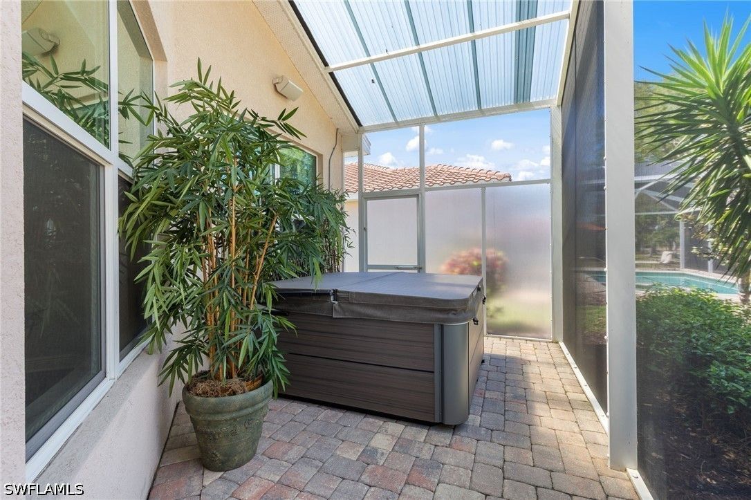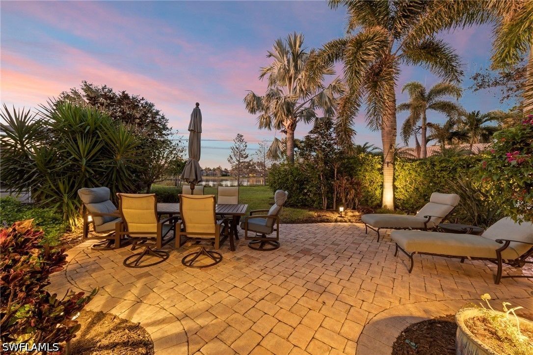 This beautifully maintained residence shows like a model home, blending refined design with effortless Florida living and a thoughtful collection of upgrades throughout. Featuring impact-resistant doors and windows, the home offers both peace of mind and elevated style. Rich wood flooring flows throughout the main living areas, complemented by tile in the bedrooms and baths, crown molding, and custom architectural details including wood valances and a den with custom built-ins—ideal as a home office or optional third bedroom. The outdoor living is a true highlight. A peaceful, long lake view creates a serene and private backdrop, enhanced by custom landscaping. The thoughtfully designed patio and covered lanai offer multiple spaces to relax and entertain, complete with a large spa and privacy screen—creating a tranquil retreat. There is also ample room to add a pool if desired, offering the opportunity to further customize your outdoor oasis. The well-designed floor plan features two spacious bedrooms, a flexible den, and 2.5 baths. An additional pool bath—an upgrade not often found in this floor plan—adds both convenience and value. Volume ceilings enhance the sense of openness and light, creating an airy and inviting ambiance throughout, making this an ideal space for both seasonal and year-round living. Located west of I-75 in Flood Zone X within The Reserve at Estero, a 24/7 gated natural gas community, residents enjoy a clubhouse, tennis, pickleball, and fitness center, all included in the HOA. Ideally positioned between Naples and Fort Myers with convenient access to RSW Airport, Coconut Point, Hertz Arena, and Gulf beaches.