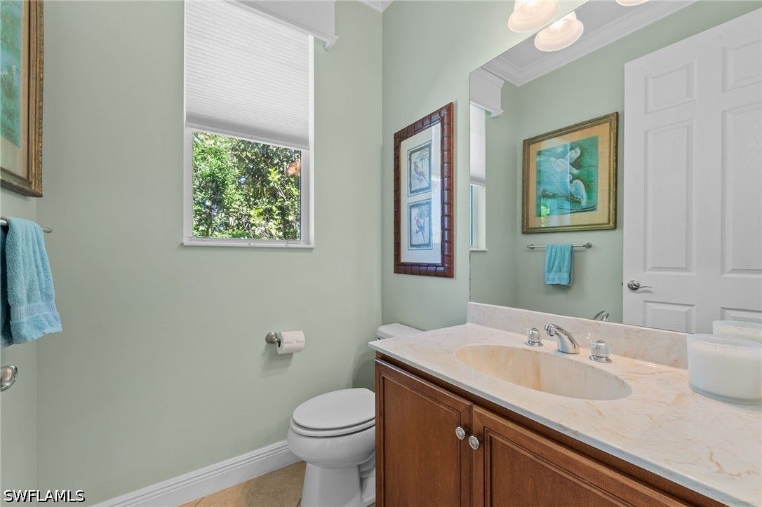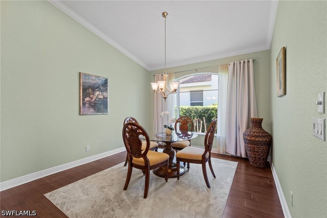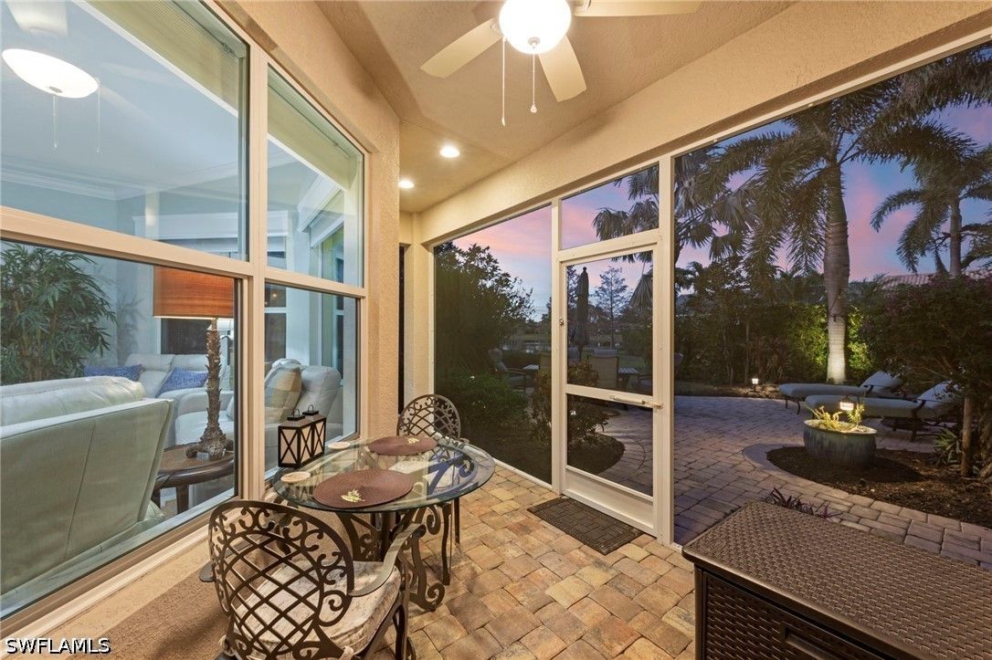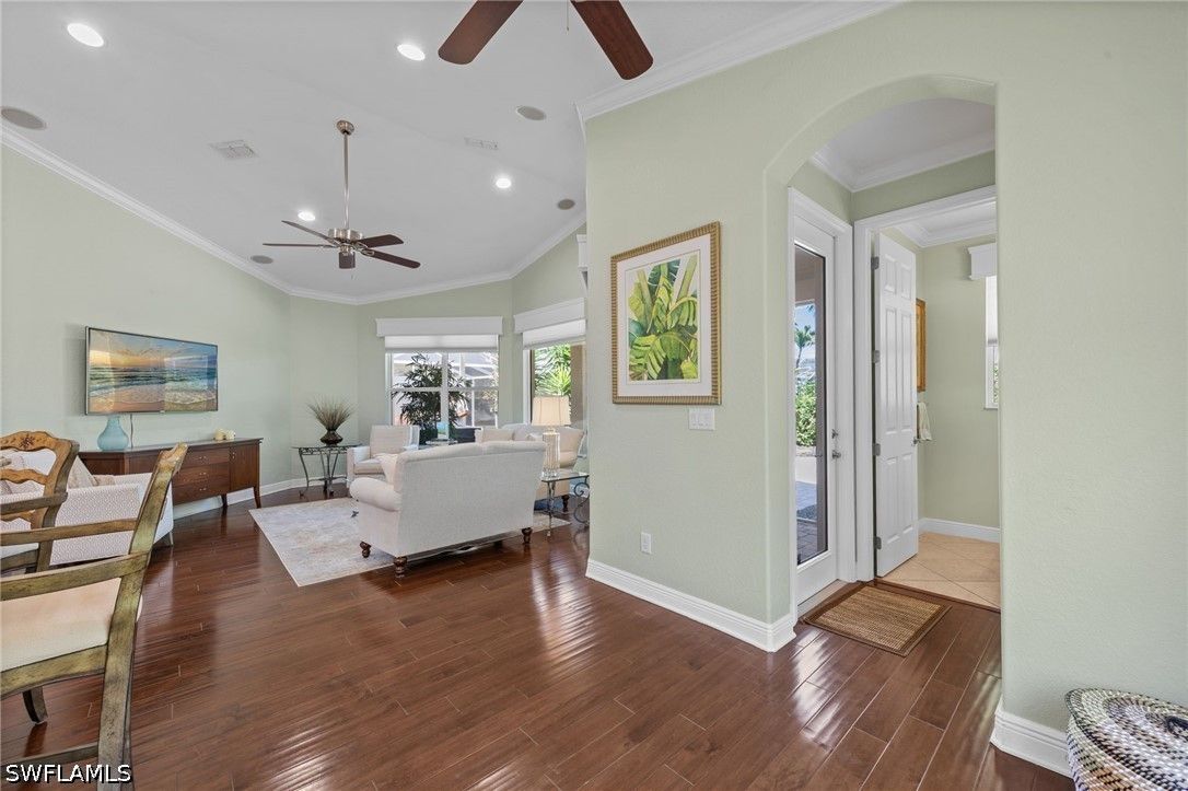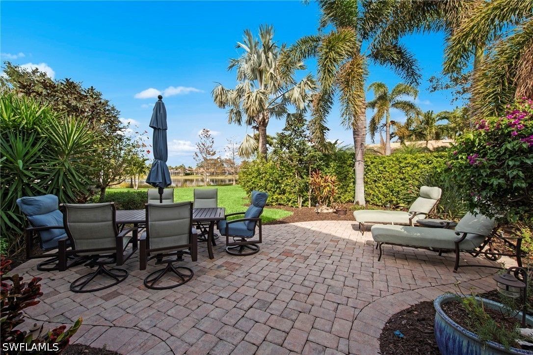 This beautifully maintained residence shows like a model home, blending refined design with effortless Florida living and a thoughtful collection of upgrades throughout. Featuring impact-resistant doors and windows, the home offers both peace of mind and elevated style. Rich wood flooring flows throughout the main living areas, complemented by tile in the bedrooms and baths, crown molding, and custom architectural details including wood valances and a den with custom built-ins—ideal as a home office or optional third bedroom. The outdoor living is a true highlight. A peaceful, long lake view creates a serene and private backdrop, enhanced by custom landscaping. The thoughtfully designed patio and covered lanai offer multiple spaces to relax and entertain, complete with a large spa and privacy screen—creating a tranquil retreat. There is also ample room to add a pool if desired, offering the opportunity to further customize your outdoor oasis. The well-designed floor plan features two spacious bedrooms, a flexible den, and 2.5 baths. An additional pool bath—an upgrade not often found in this floor plan—adds both convenience and value. Volume ceilings enhance the sense of openness and light, creating an airy and inviting ambiance throughout, making this an ideal space for both seasonal and year-round living. Located west of I-75 in Flood Zone X within The Reserve at Estero, a 24/7 gated natural gas community, residents enjoy a clubhouse, tennis, pickleball, and fitness center, all included in the HOA. Ideally positioned between Naples and Fort Myers with convenient access to RSW Airport, Coconut Point, Hertz Arena, and Gulf beaches.