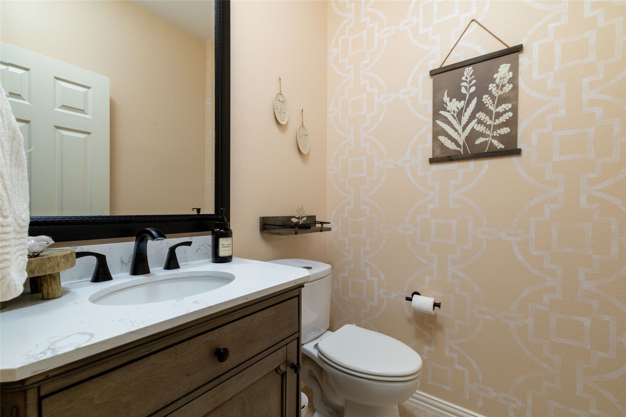 Welcome to 9004 Freeport Dr, where farmhouse charm meets resort-style living in the heart of Robson Ranch. This stunningly upgraded Talavera floor plan offers 2 beds + den-office, 2.5 baths & 2,229 SF of beautifully designed space on a rare 0.4-acre lot, one of the largest in the community! Step inside to find white oak LVP flooring and tile throughout, setting the tone for a bright & airy ambiance. Just off the entry, a spacious office with custom wall detailing & rattan blinds provides the perfect workspace, den or 3rd bedroom. The open-concept living area is a showstopper, with a wall of windows, shades, and sliding doors that frame the lush, tree-lined backyard. The completely reimagined farmhouse kitchen is a dream: beige cabinetry with sleek black hardware, floating honey oak shelves w accent lighting, and stunning two-tone countertops in quartz & granite. A wrap-around island with breakfast bar seating anchors the space, complemented by multi-tone tile backsplash, double ovens, and floor-to-ceiling cabinetry for maximum storage. The oversized dining area with surrounding window views flows effortlessly from the kitchen, making it perfect for entertaining. The expansive light-filled primary suite is a private sanctuary with bay window & sliding door to the back patio, while the spa-like ensuite bath offers a soaking tub, walk-in shower, and dual vanities for everyday luxury. Retreat to your backyard oasis where a breathtaking pergola shades an oversized patio, perfect for enjoying morning coffee or hosting under the stars. Surrounded by mature trees & vibrant landscaping, this tranquil space is truly unmatched. Additional highlights include a large laundry room w sink & cabinetry, plus an insulated 3-car garage. Enjoy the exceptional lifestyle of Robson Ranch: championship golf, fitness center, resort-style pool, pickleball, tennis & more. Brimming with charm, this exquisite home delivers comfort, style, and a rare outdoor space in one perfect package!