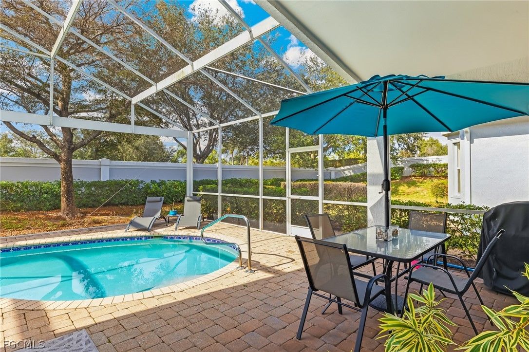 ***TURNKEY - NO FLOODING*** Beautiful, well-maintained coastal contemporary pool home on a quiet cul-de-sac. This updated 2 bedroom+Den home exudes an abundance of natural sunlight provides plenty of privacy, with no properties backing up to your home and lush landscaping surrounding you. Many recent updates include a NEW ROOF (2023), new AC (2024) with air filtration system, new LG washer and dryer, new garage door opener (2024), new picture window screen on the lanai, new pool pump and heater (2021), plantation shutters, and updated lights and fans throughout. The home is wired for a portable generator and has recently completed exterior and interior painting. Live the active lifestyle in Cascades, centrally located in the heart of Estero. Cascades at Estero is a sought-after, gated, active 55+ adult community with a 20% exception for younger owners. The recently completed clubhouse renovation offers something for everyone — from highly active pickleball and tennis programs to billiards, cards, crafts, a library, a large fitness center with sauna, community spa, resort-style pool with indoor/outdoor swimming, and social events led by a full-time activities director. Cascades is in a fantastic location, close to Southwest Florida International Airport, Coconut Point, Gulf Coast Town Center, award-winning beaches, and conveniently situated between Naples and Fort Myers. Come and Live Joy in the Cascades in Estero! (pilates machine in garage does not convey with purchase)