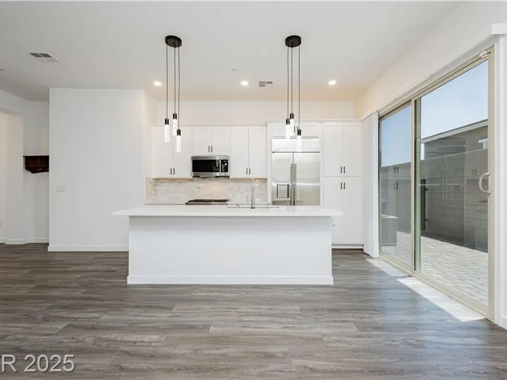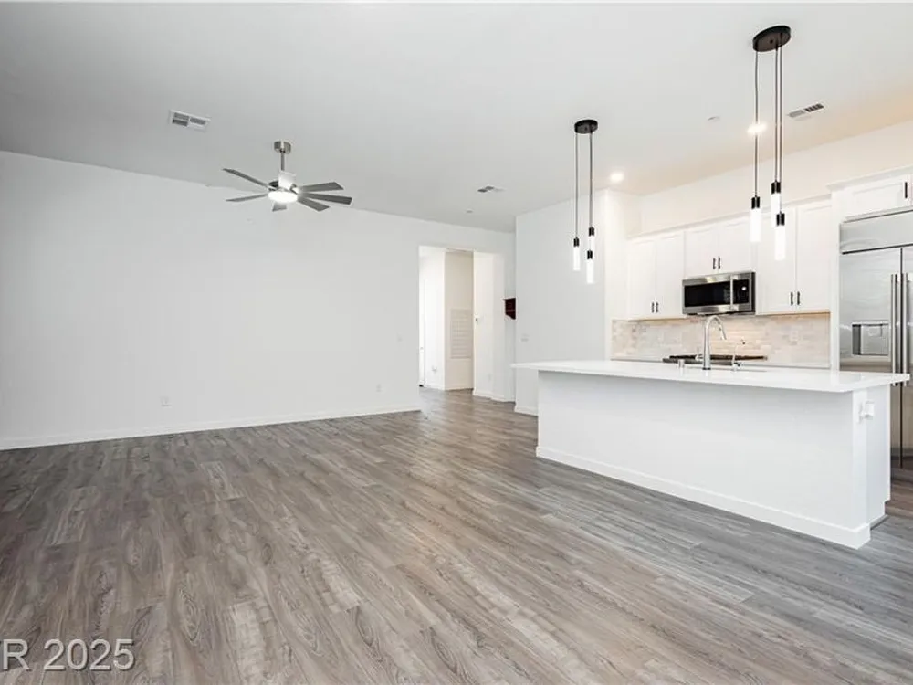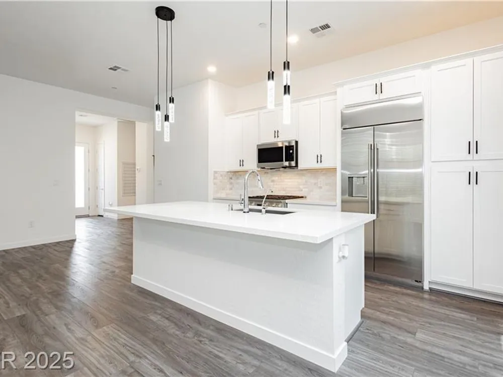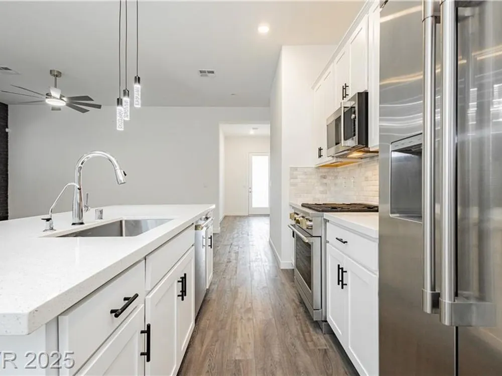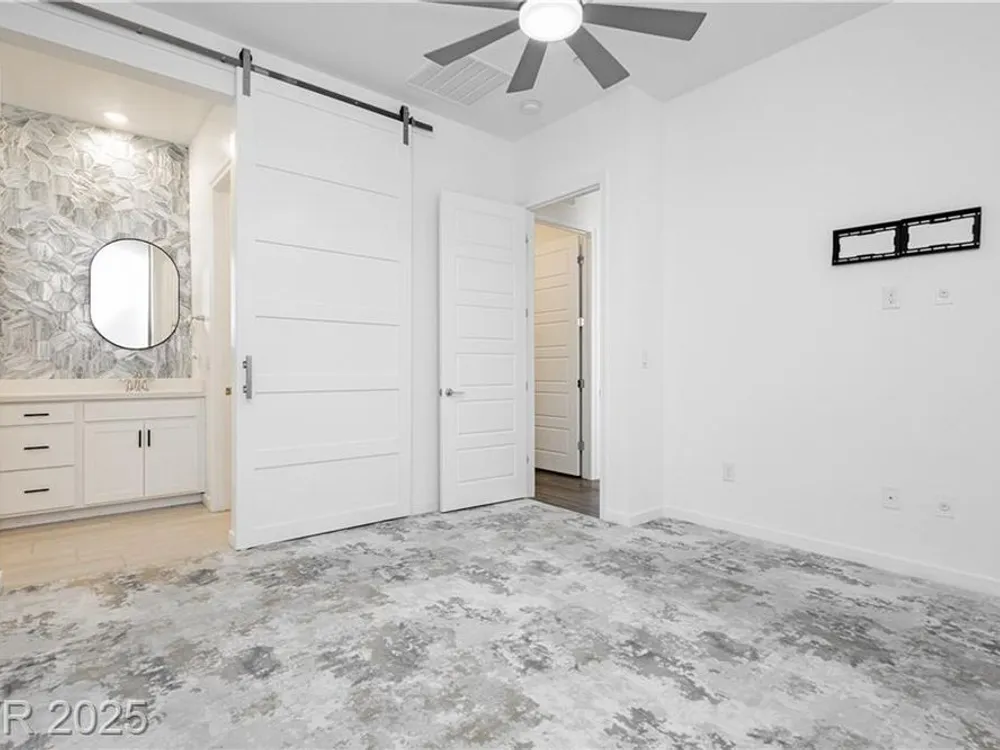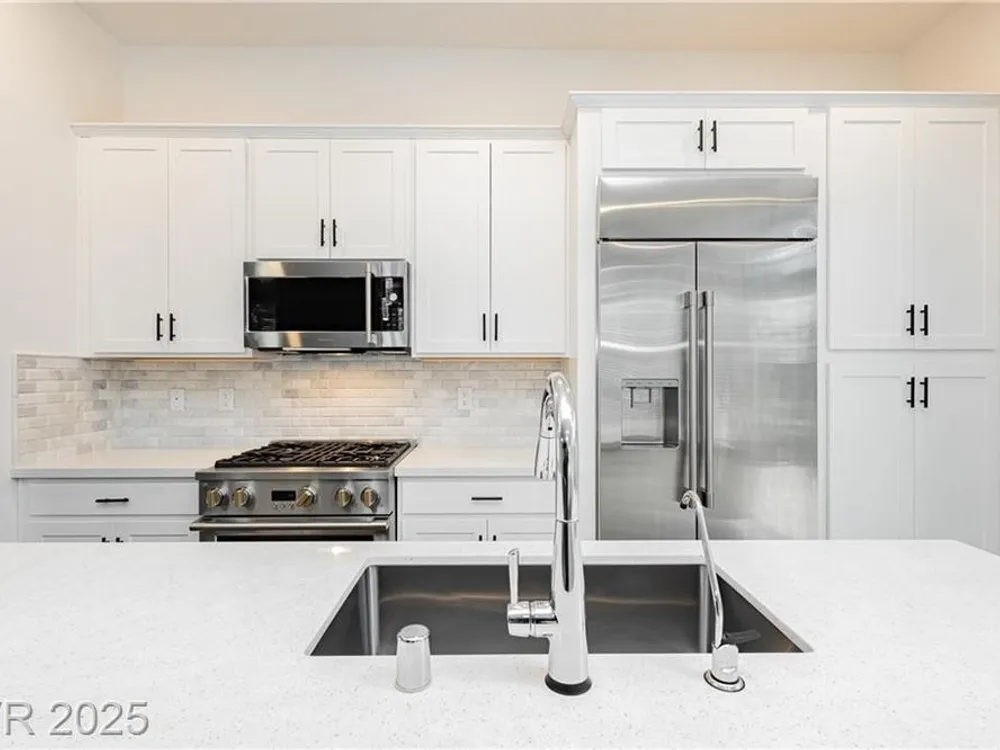Beautiful upgraded home located on a corner lot in Heritage Heights, Summerlin's exclusive guard gated 55+ community. As you walk up to the home you notice the openness & the stunning curb appeal of the ONLY CORNER LOT currently available in this floorplan. Stone facia embellishes the front entrance of this modern designed home, 10 ft ceilings, luxury vinyl plank flooring, upgraded tile & carpet throughout, lots of natural light, Kitchen w/pendant & recessed lighting, quartz countertops, island, soft close cabinets, R/O system, upgraded built-in refrigerator, microwave, stove, & dishwasher, Living room w/custom stone wall, master bedroom w/custom farm sliding door that leads to master bathroom w/double sinks, walk-in shower, custom tile designed walls in all bathrooms & master walk-in closet, Spacious secondary bedroom, ceiling fans w/lights, window covering throughout, private paver patio w/BBQ stub, garage w/epoxy floors, designer tiled wall, water softener, auto opener, NO SID FEE!