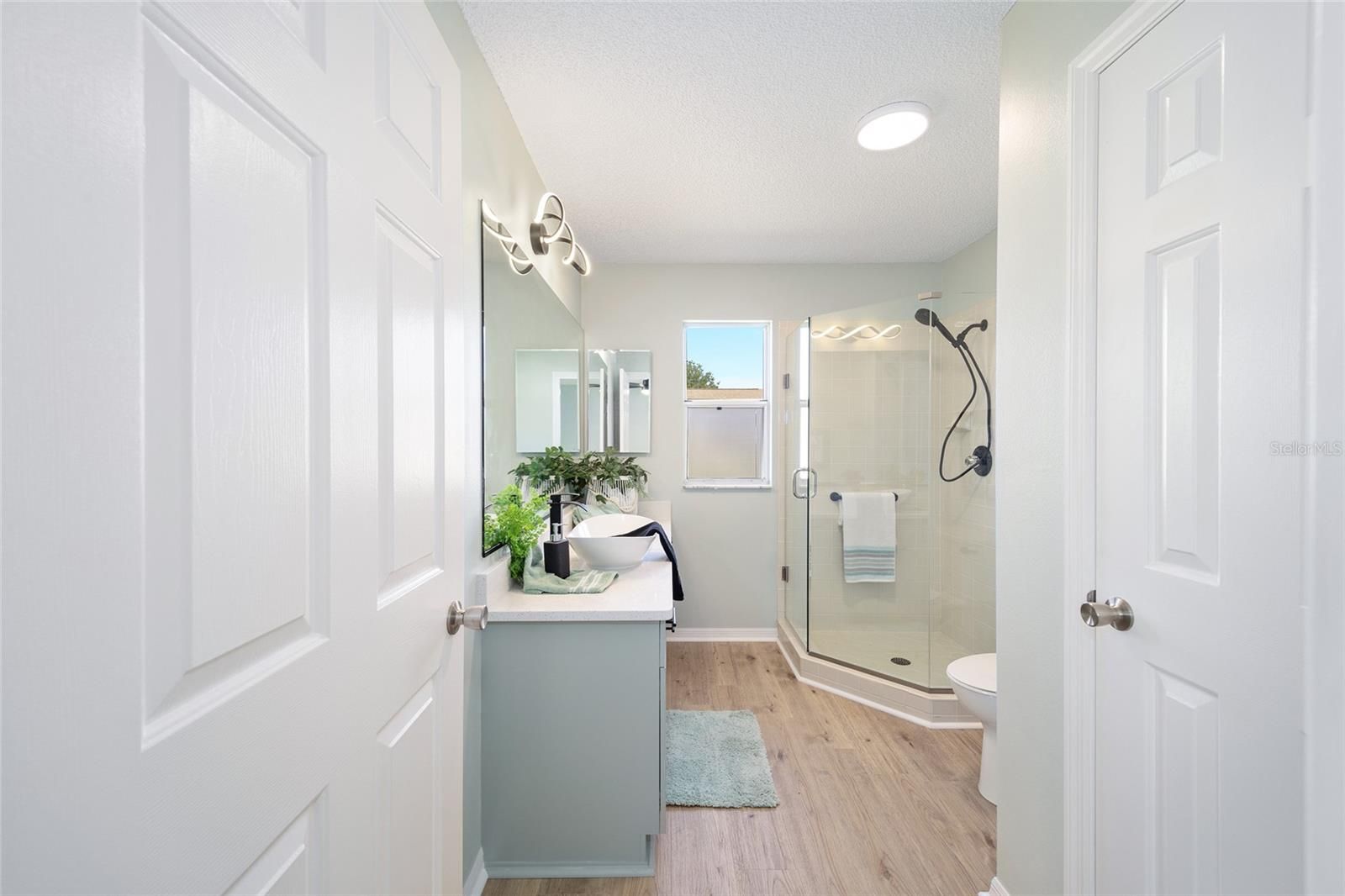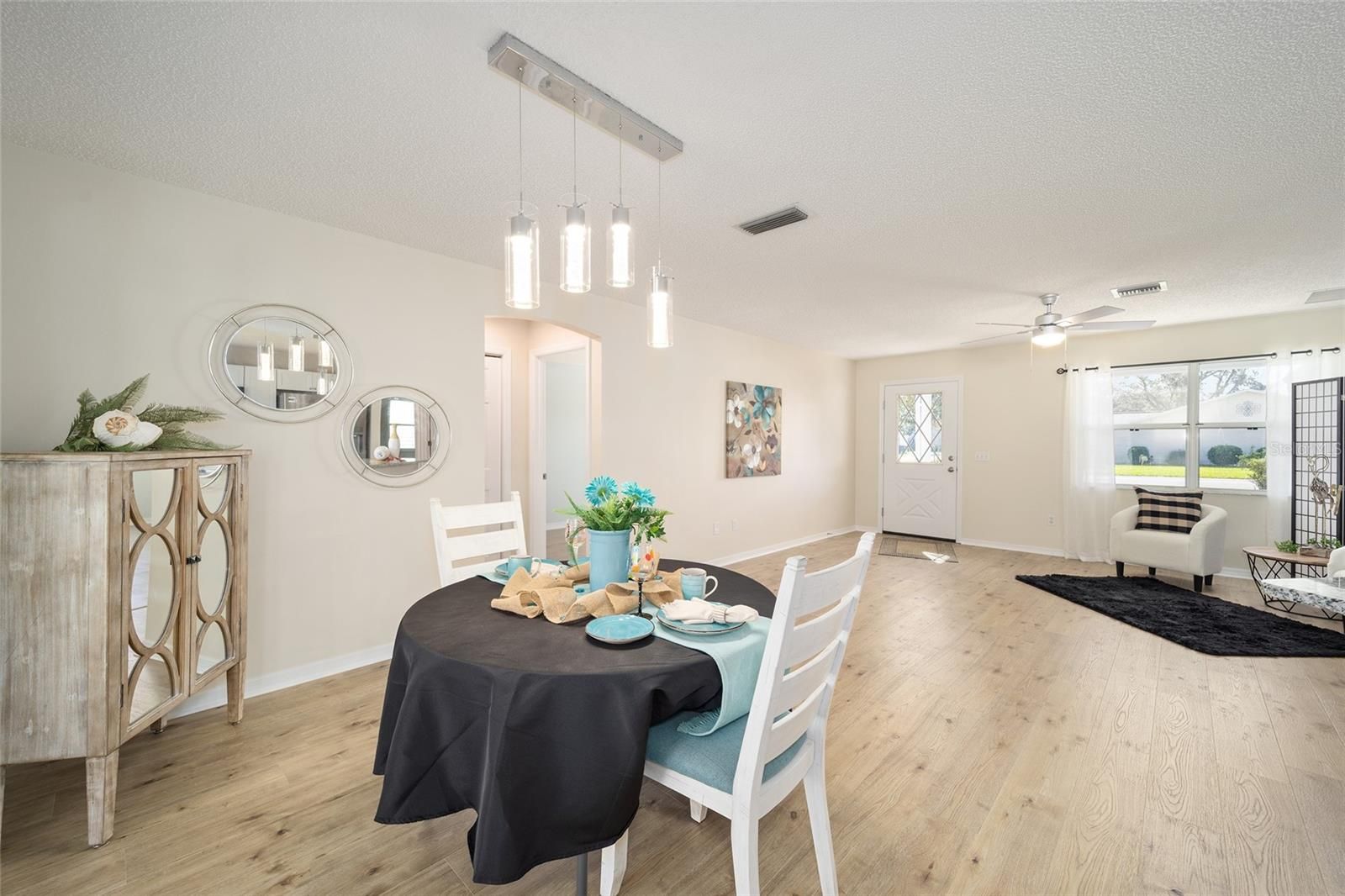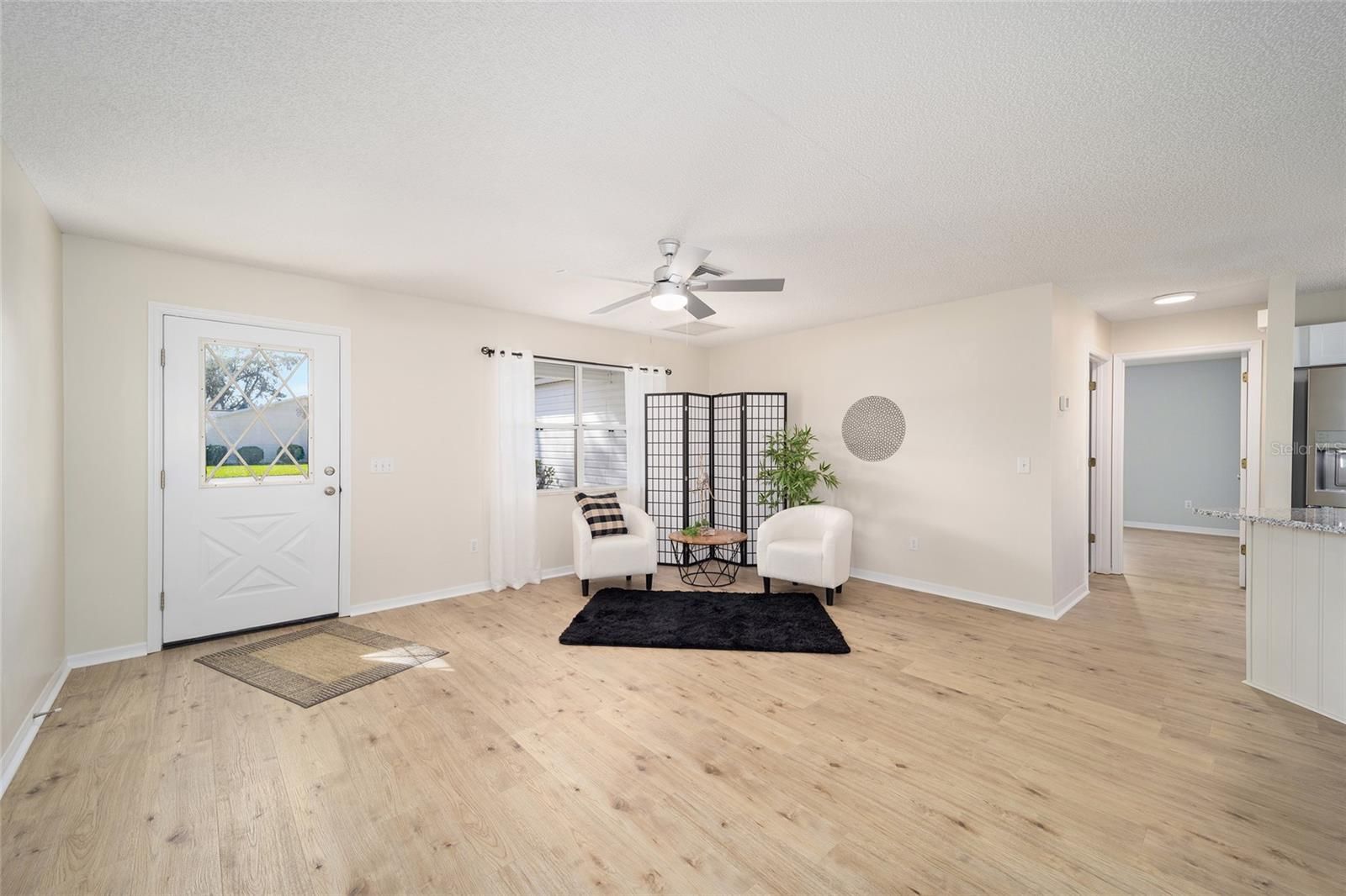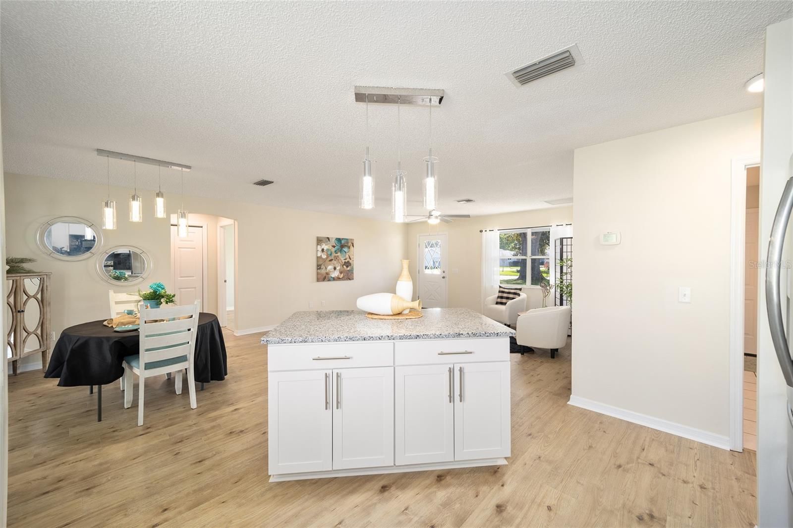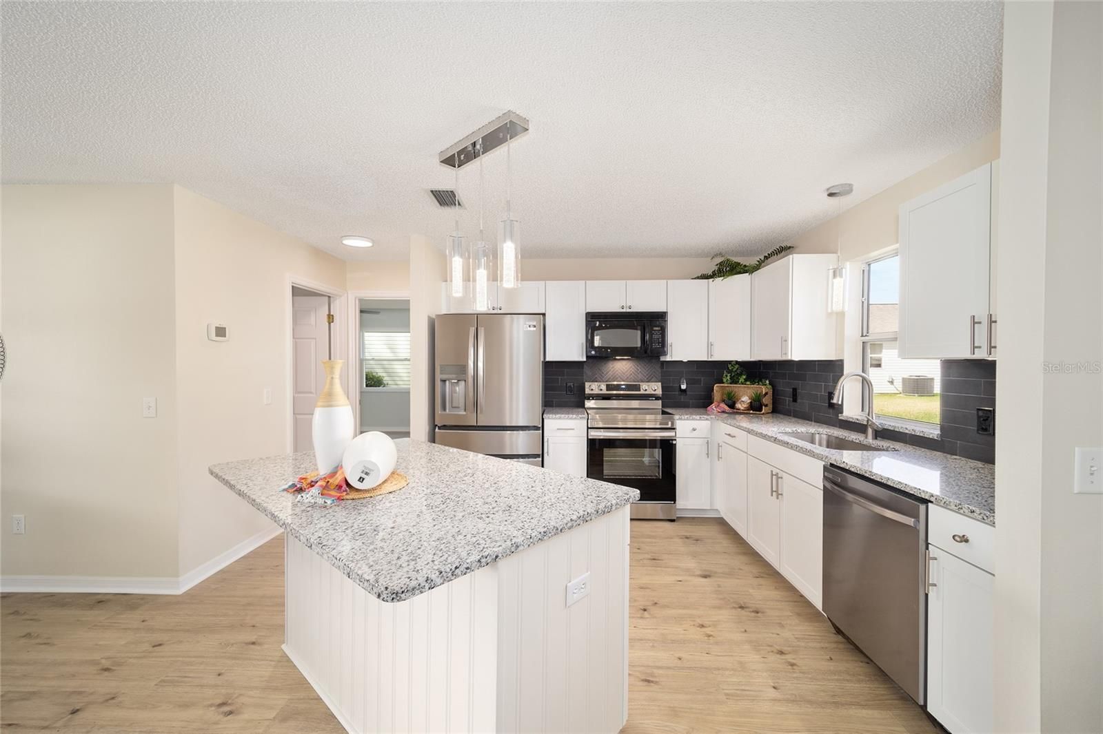 The Village of El Cortez – NO BOND, NO CDD MAINTENANCE FEE!! – Recently REMODELED CORPUS CHRISTI Model *** So Close to Chula Vista Recreation Center, Mira Mar Executive Golf Course, and Spanish Springs Town Square ® *** This home has 1,248 Sq Ft with 2 Bedrooms, 2 Baths & 2-CAR GARAGE on a CORNER LOT!! -- ROOF: 12/2023 – Water Heater: 2021 - HVAC: 2013 -- NEW Water-Resistant LAMINATE Flooring Throughout home!! -- FRESHLY PAINTED (Interior Walls, Doors & Trim, Garage Door, Front Door, Shutters & Garage Walls). – The Kitchen is a DREAM and is BEAUTIFULLY REMODELED with NEW Cabinets, Pulls, GRANITE COUNTERTOPS, TILE BACKSPLASH, STAINLESS STEEL Sink with Gooseneck Faucet, STAINLESS STEEL Refrigerator, Dishwasher & Range. Also a GRANITE-Topped Center ISLAND (Electrified) with Breakfast Bar Overhang, Bead Board, Modern Pendant Lighting.! -- The Open Floorplan is Perfect for Entertaining with a Spacious Living Room with Windows to the Front Yard. The Dining Room has a 6 Ft Slider to the ENCLOSED LANAI (with Vinyl Windows)!! – Walking into the SPACIOUS Primary En-Suite, you’ll find a 14 Ft x 14 Ft Bedroom, 5 Ft x 10 Ft Walk-in Closet, and the EN-SUITE BATHROOM with Freshly Painted Cabinets, NEW QUARTZ Vanity Top & Vessel Sink, NEW Lighting, Corner Step-in Shower with NEW GLASS SURROUND and Tiled Walls and Floor, also a Window and a Linen Closet. – The GUEST WING has a 10 Ft x 15 Ft Bedroom, and the Guest Bath has a Single Vanity with NEW QUARTZ Vanity Top & Vessel Sink, NEW Lighting, Tub/Shower Combo with Tiled Walls. – The INSIDE LAUNDRY ROOM houses a Kenmore Washer & Electric Dryer, and has a Door with Screen Door to the 2 CAR GARAGE. *** Don’t Wait to see this MOVE-IN READY Home and enjoy all The Villages, FL has to offer!!! ***