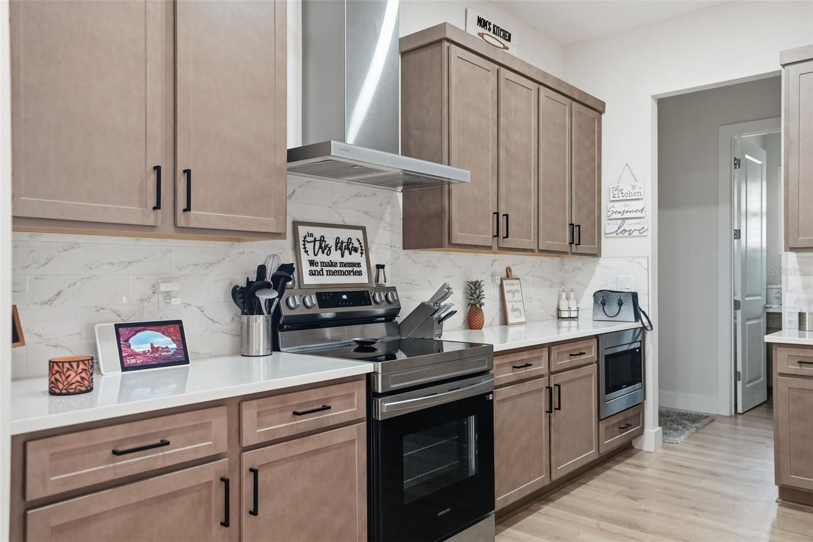 WELCOME HOME to this 2024 built lakefront home in the gated Glen Lakes Golf & Country Club! This beautifully upgraded 3-bedroom, 2-bath residence with an oversized 2-car garage features high-end modern finishes and breathtaking water views. The open floor plan showcases soaring tray ceilings, triple glass sliders, and luxury vinyl plank flooring throughout, creating a bright and inviting atmosphere. The gourmet kitchen is designed for entertaining with quartz countertops, shaker wood cabinetry, stainless steel appliances, a large center island, and a spacious walk-in pantry—all open to the dining and great room. Enjoy peaceful lake views from nearly every room. The private primary suite offers two walk-in closets and a spa-inspired bath with a soaking tub, oversized frameless glass shower, dual vanities, and designer finishes. The secondary bathroom mirrors the same upscale style with dual sinks and a walk-in shower. Both guest bedrooms are generously sized with walk-in closets. Additional highlights include a large laundry room with sink, mudroom entry from the garage, brick-paver driveway, and covered rear lanai overlooking the lake—perfect for enjoying Florida living. Spa and pergola WILL STAY! Glen Lakes offers a luxury, resort-style lifestyle with 24/7 gated security, a Ron Garl–designed championship golf course, clubhouse with dining and bar, pool and spa, fitness center, tennis and pickleball courts, and over 100 social clubs. Community fees include amenities, cable, and internet. Conveniently located just 40 minutes from Tampa—come experience why Glen Lakes is a top-rated community!