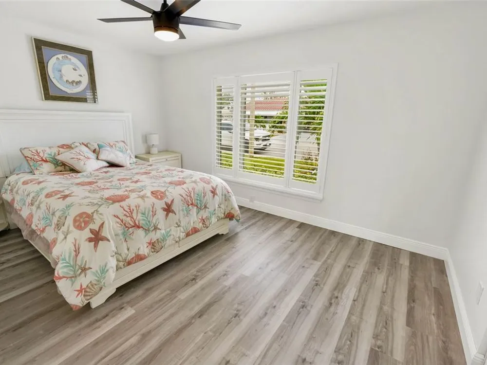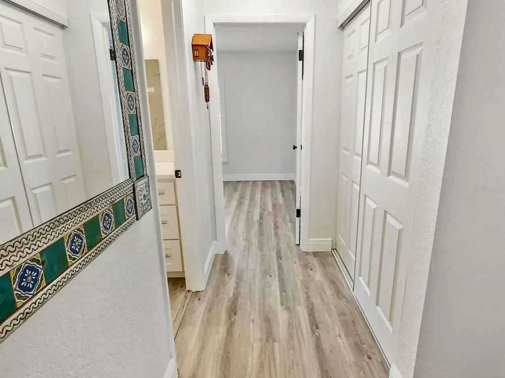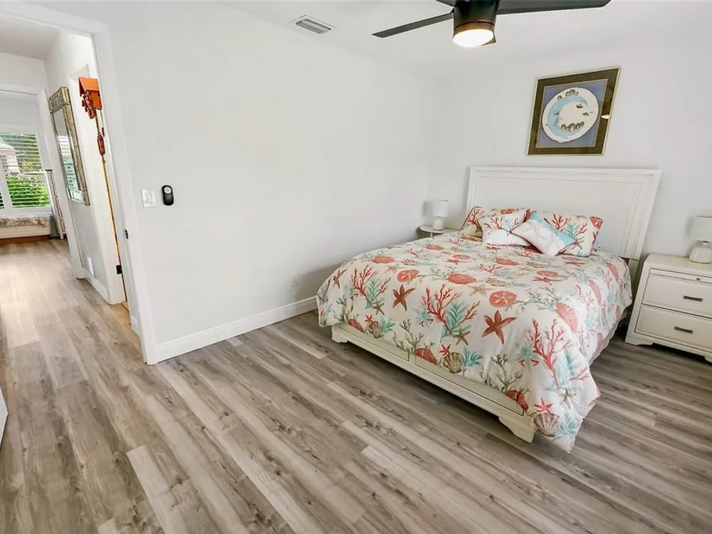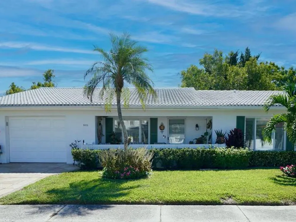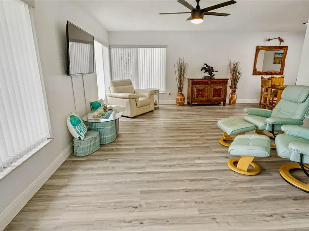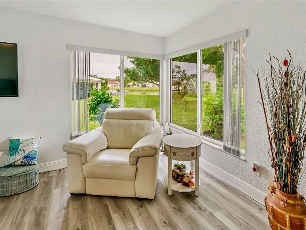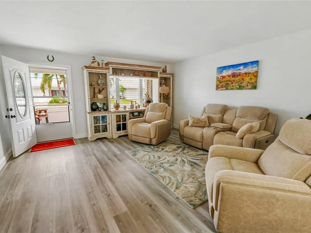 This is the one you have been looking for! A water view, beautifully, updated 2-bedroom, 2 bath, 1 car garage home with 1570 sq.ft. in the desirable 55+ community of Mainlands of Tamarac by the Gulf. As you walk up the stamped driveway and enter the covered, front porch, notice it is completely enclosed by a block fence with a new gate. The front door has a lovely oval glass inlay and complete with an outside storm door. The home has updated luxury, vinyl plank flooring, updated LED light fixtures, remote control fans, and double-pane windows. An open concept view from the living room continues through the dining room to the family room. New plantations shutters in the living room, kitchen and both bedrooms. The kitchen has been completely updated with white shaker, soft-close solid wood cabinets, stainless steel appliances, quartz counter-tops with a breakfast nook and a pass-through opening to the family room. The family room with new blinds, is a room with a view to the green space and pond. Off the family room is a barn-door with a step-down to the bonus room that can be used as an office, craft room, or extra guest room. No popcorn ceiling in this home, the ceiling and walls have been tastefully, texturized. The primary bedroom is on the backside of the home with a view of the pond and has its own, updated, private en-suite with a step-in shower. The guest bedroom is in the front of the home, near the updated, guest bathroom that has a tub/shower combo. The laundry area with a full-size washer and dryer is off the kitchen located in the over-sized 1 car garage, complete with a utility sink, epoxy flooring and a remote garage door opener. Mainlands Unit 5 residents enjoy access to a clubhouse with a heated pool, a variety of social activities such as dances, pancake breakfast, card games, and shuffleboard. Mainlands is a golf-cart community and is conveniently located just minutes from the Mainlands Public Golf Course, Mayor Park, Tampa International Airport, and downtown St. Petersburg. Don’t miss out on this gorgeous piece of paradise. Call now to schedule your private showing!