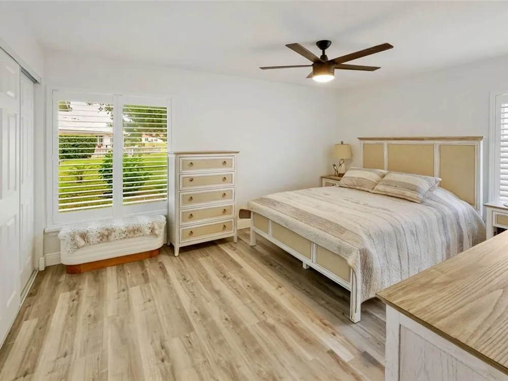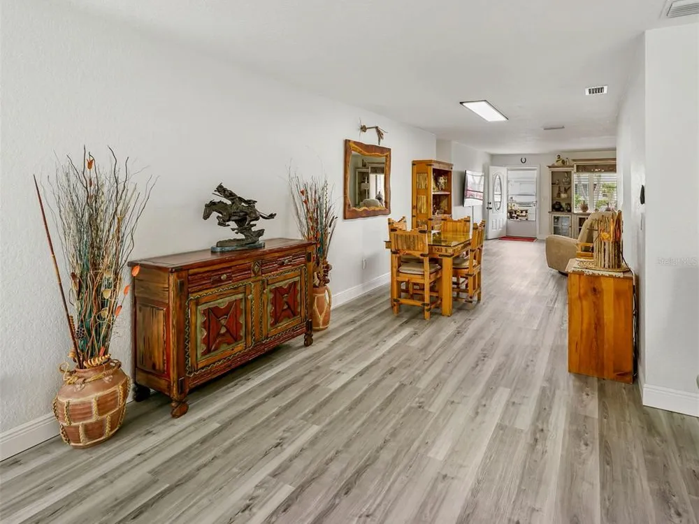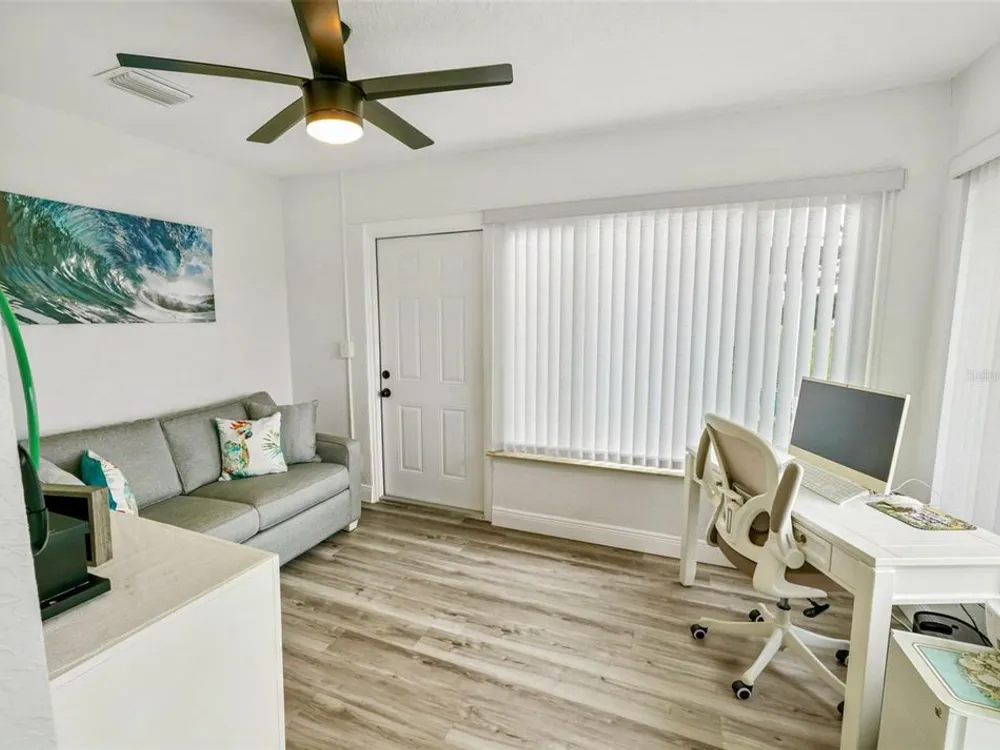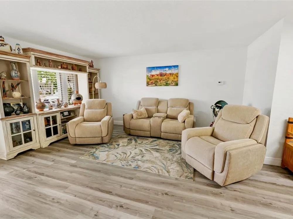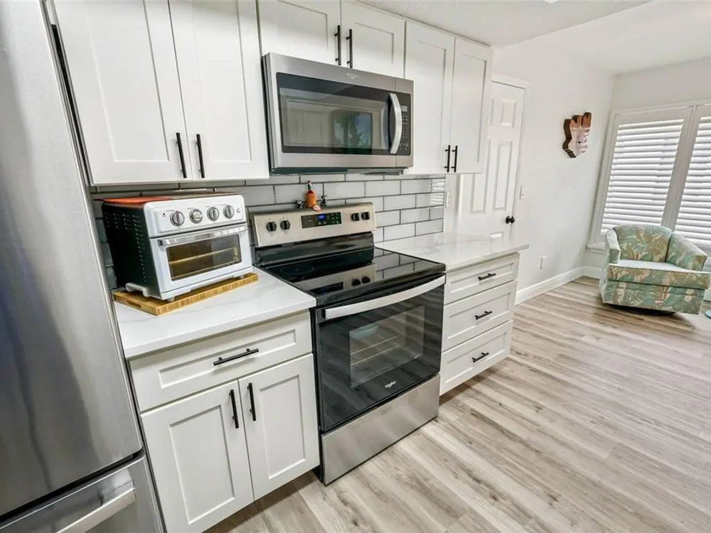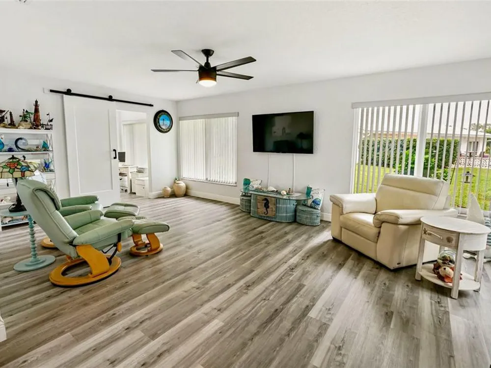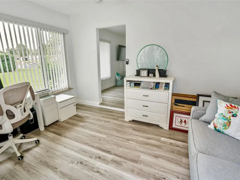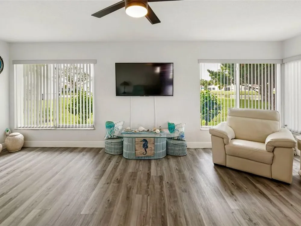 This is the one you have been looking for! A water view, beautifully, updated 2-bedroom, 2 bath, 1 car garage home with 1570 sq.ft. in the desirable 55+ community of Mainlands of Tamarac by the Gulf. As you walk up the stamped driveway and enter the covered, front porch, notice it is completely enclosed by a block fence with a new gate. The front door has a lovely oval glass inlay and complete with an outside storm door. The home has updated luxury, vinyl plank flooring, updated LED light fixtures, remote control fans, and double-pane windows. An open concept view from the living room continues through the dining room to the family room. New plantations shutters in the living room, kitchen and both bedrooms. The kitchen has been completely updated with white shaker, soft-close solid wood cabinets, stainless steel appliances, quartz counter-tops with a breakfast nook and a pass-through opening to the family room. The family room with new blinds, is a room with a view to the green space and pond. Off the family room is a barn-door with a step-down to the bonus room that can be used as an office, craft room, or extra guest room. No popcorn ceiling in this home, the ceiling and walls have been tastefully, texturized. The primary bedroom is on the backside of the home with a view of the pond and has its own, updated, private en-suite with a step-in shower. The guest bedroom is in the front of the home, near the updated, guest bathroom that has a tub/shower combo. The laundry area with a full-size washer and dryer is off the kitchen located in the over-sized 1 car garage, complete with a utility sink, epoxy flooring and a remote garage door opener. Mainlands Unit 5 residents enjoy access to a clubhouse with a heated pool, a variety of social activities such as dances, pancake breakfast, card games, and shuffleboard. Mainlands is a golf-cart community and is conveniently located just minutes from the Mainlands Public Golf Course, Mayor Park, Tampa International Airport, and downtown St. Petersburg. Don’t miss out on this gorgeous piece of paradise. Call now to schedule your private showing!