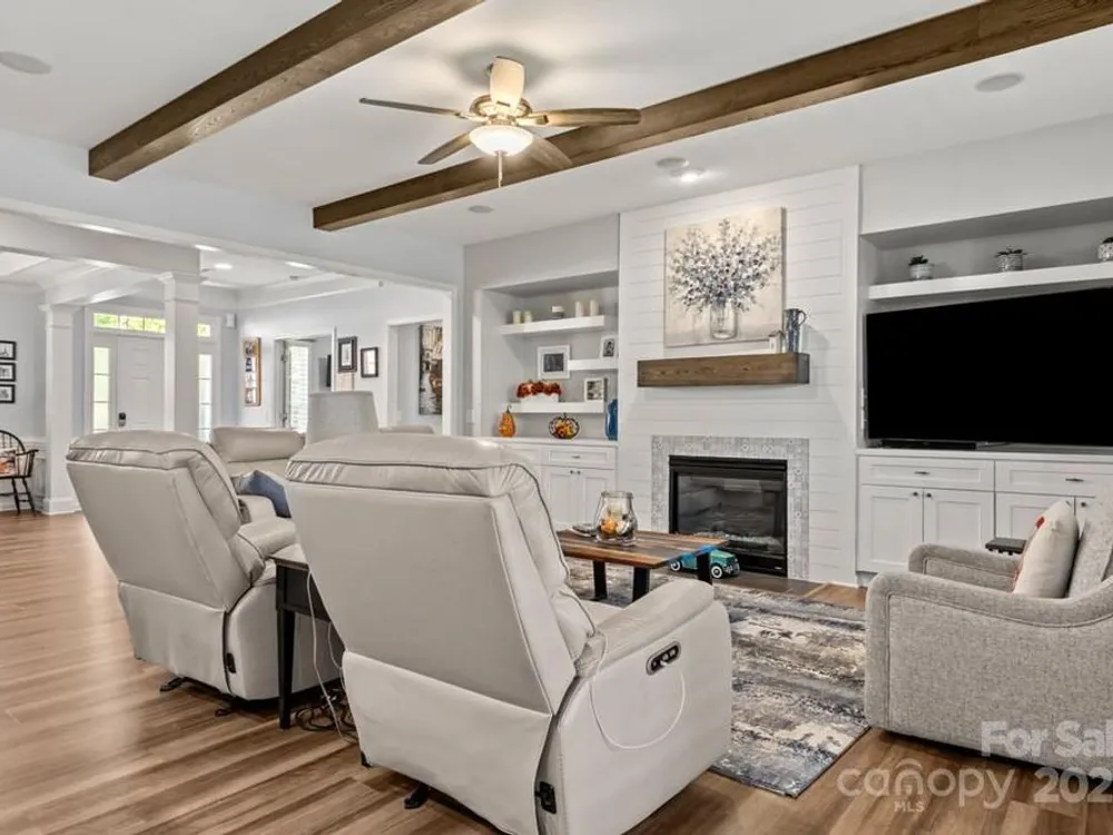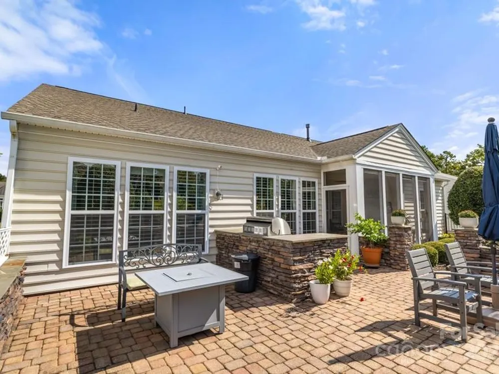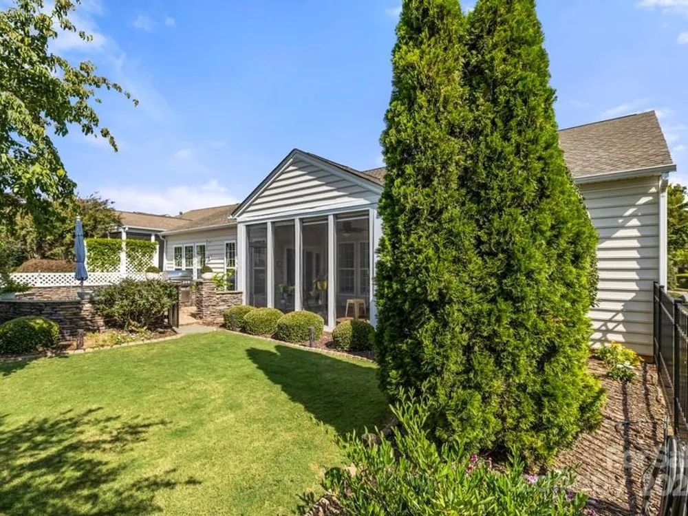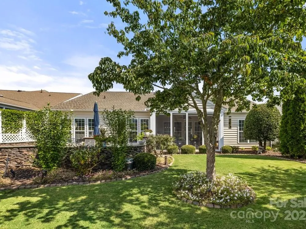 Enjoy meticulous, one-level living offering the desirable low-maintenance lifestyle you deserve, complete with upscale finishes and an open, airy floor plan. This home boasts glowing LVP flooring throughout, with a gas fireplace anchoring the open living room, and elevated with beautiful ceiling beams above. The dreamy chef's kitchen features SS appliances, gas cooktop, wall oven and built-in microwave, cabinet pantry, tons of storage and an adjacent breakfast nook. The classic Bluffton Cottage design offers an intuitive flow between the main living spaces, ideal for entertaining and daily comfort. Owner(s) can retreat to a spacious bedroom with tray ceilings and an ensuite bath with double vanities, soaking tub, walk-in shower and water closet and a large walk-in closet. Crossing the living area, two adjacent bedrooms, await your guests with a shared full bath. Step out to your screened-in porch overlooking a tranquil, landscaped backyard—your perfect spot for a morning coffee or an evening cocktail. Living in Sun City Carolina Lakes means having access to unparalleled amenities, including the stunning Lake House amenity center, 18-hole golf course, indoor and outdoor pools, tennis, pickleball, miles of trails, and a vibrant social calendar with various clubs. Plus, your HOA covers lawn care, giving you more time to enjoy it all.