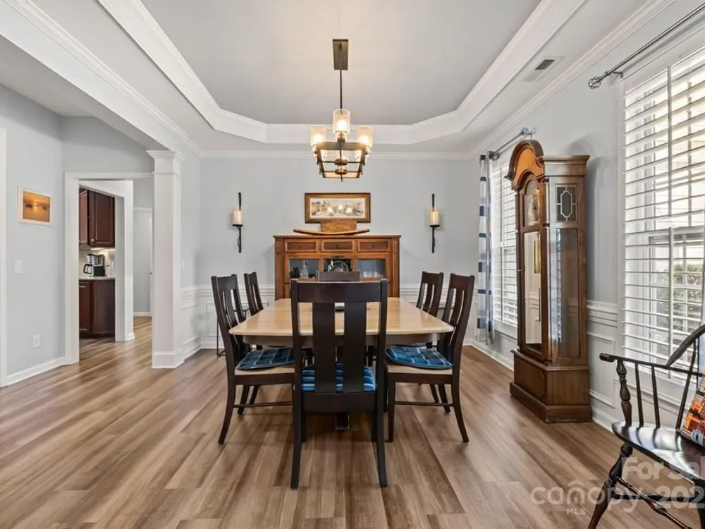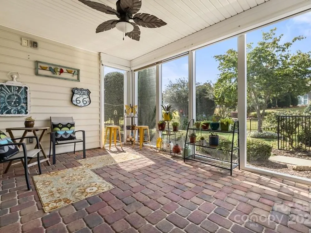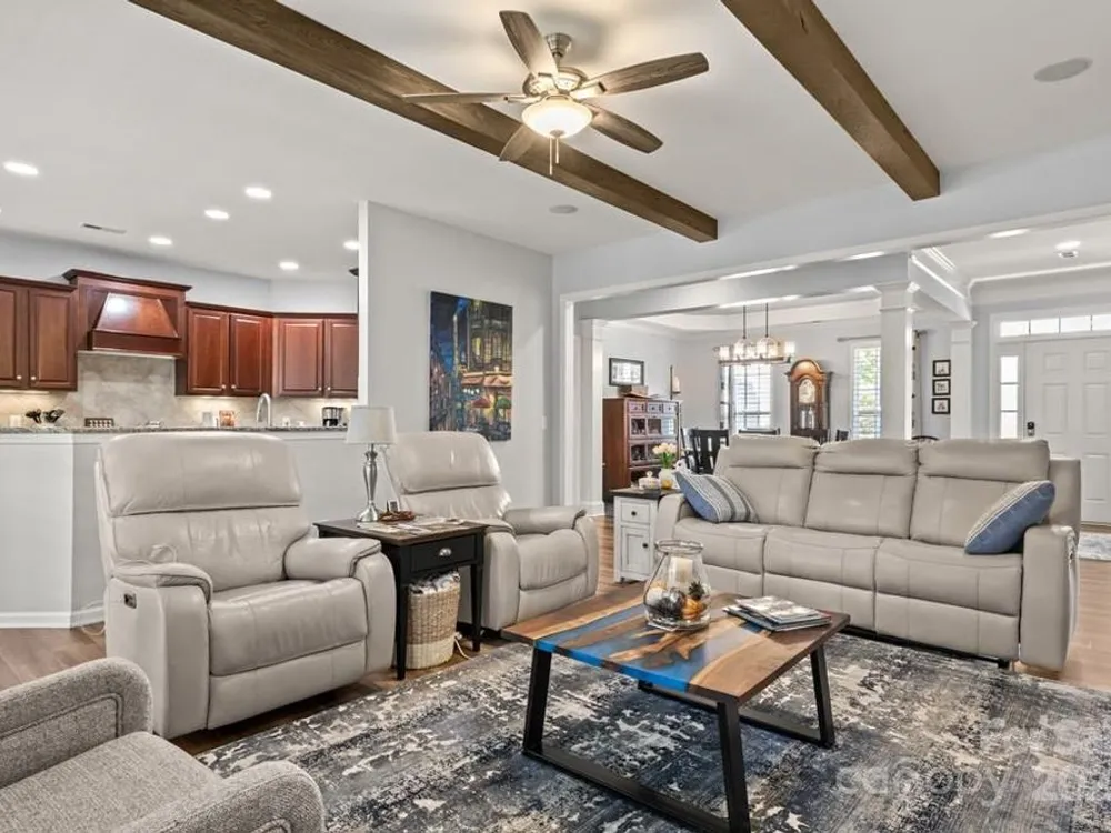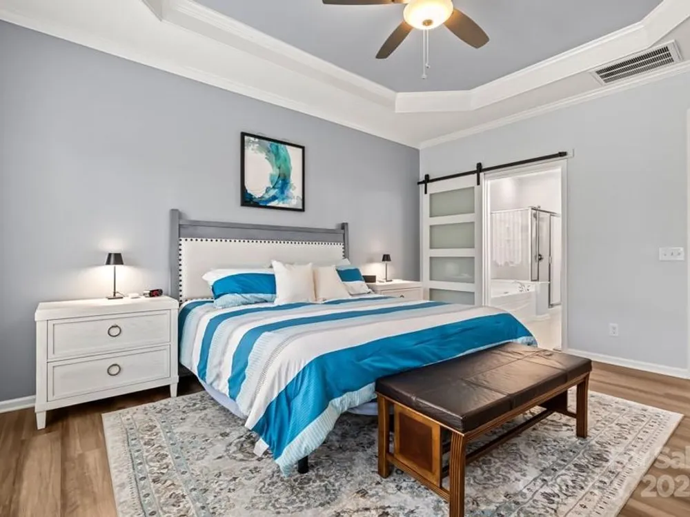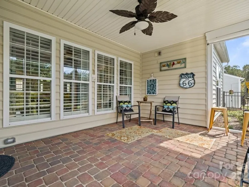 Enjoy meticulous, one-level living offering the desirable low-maintenance lifestyle you deserve, complete with upscale finishes and an open, airy floor plan. This home boasts glowing LVP flooring throughout, with a gas fireplace anchoring the open living room, and elevated with beautiful ceiling beams above. The dreamy chef's kitchen features SS appliances, gas cooktop, wall oven and built-in microwave, cabinet pantry, tons of storage and an adjacent breakfast nook. The classic Bluffton Cottage design offers an intuitive flow between the main living spaces, ideal for entertaining and daily comfort. Owner(s) can retreat to a spacious bedroom with tray ceilings and an ensuite bath with double vanities, soaking tub, walk-in shower and water closet and a large walk-in closet. Crossing the living area, two adjacent bedrooms, await your guests with a shared full bath. Step out to your screened-in porch overlooking a tranquil, landscaped backyard—your perfect spot for a morning coffee or an evening cocktail. Living in Sun City Carolina Lakes means having access to unparalleled amenities, including the stunning Lake House amenity center, 18-hole golf course, indoor and outdoor pools, tennis, pickleball, miles of trails, and a vibrant social calendar with various clubs. Plus, your HOA covers lawn care, giving you more time to enjoy it all.