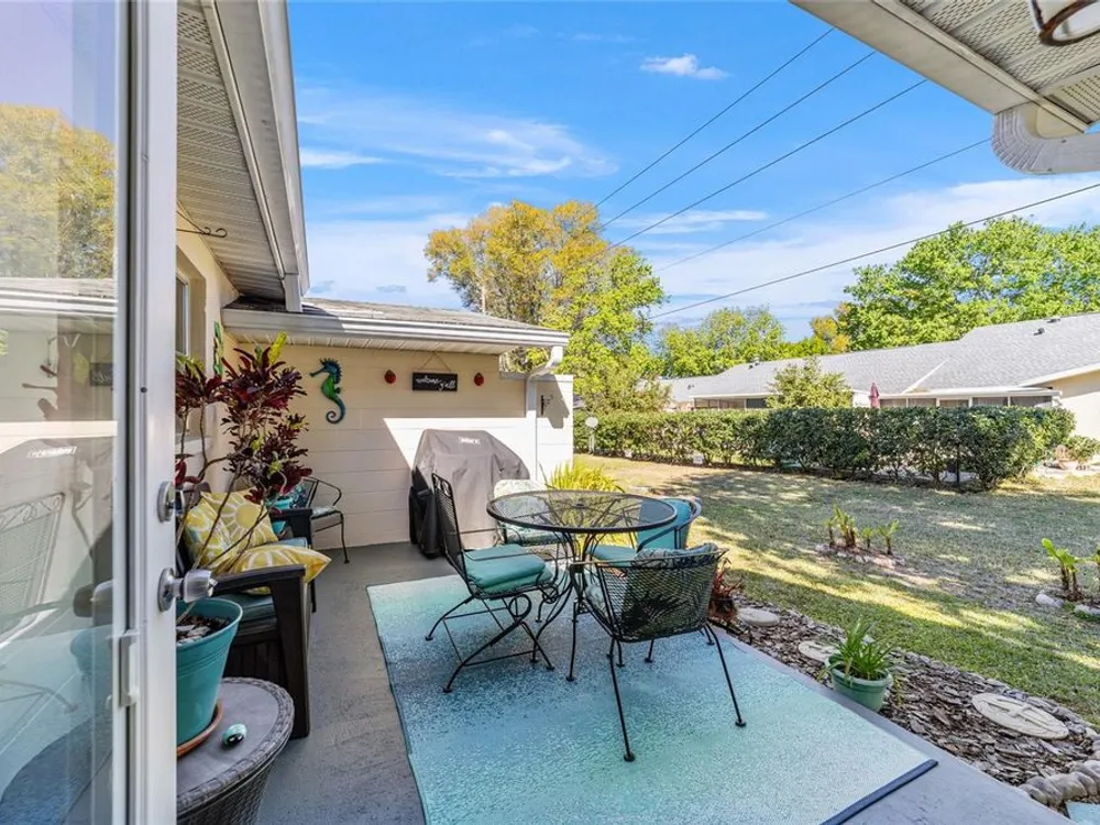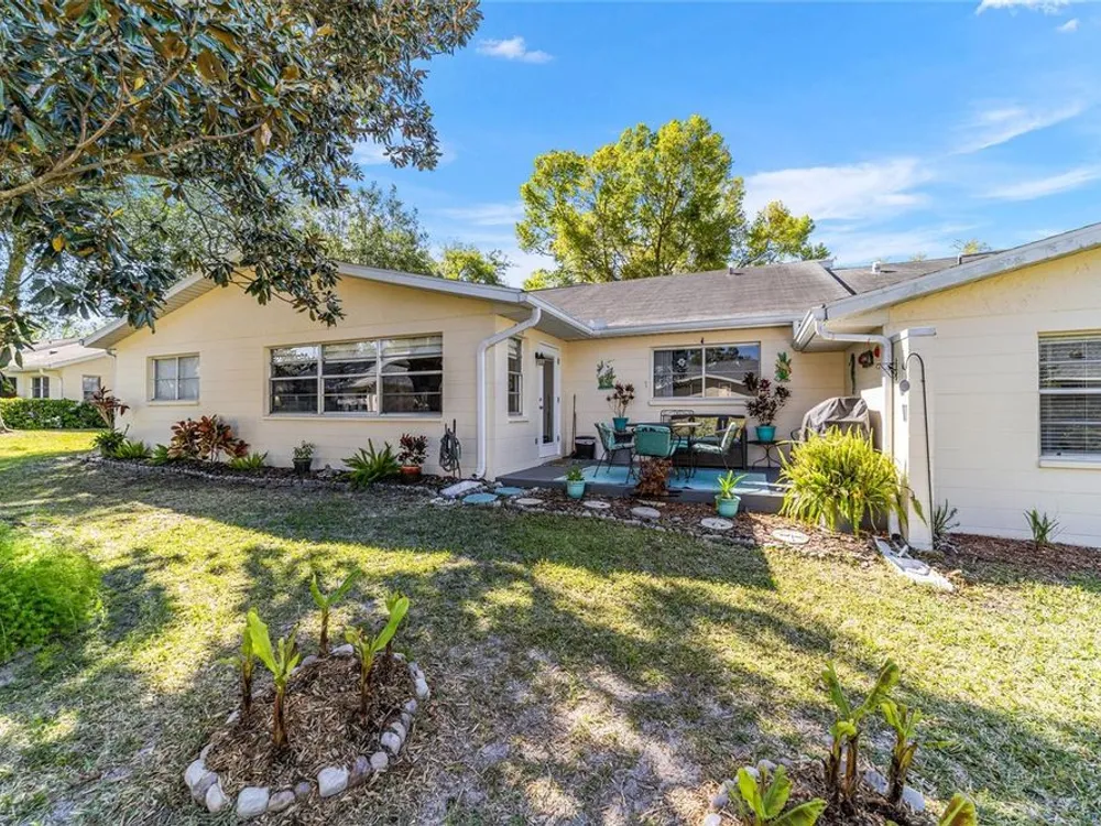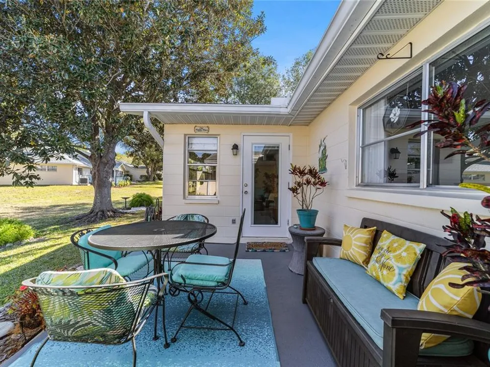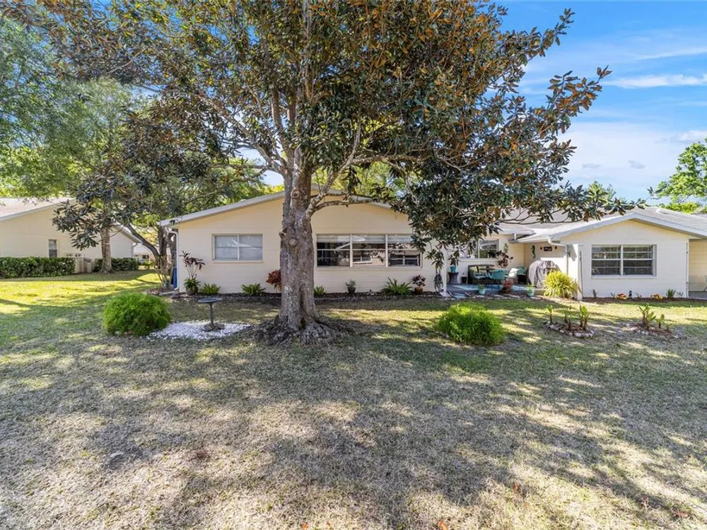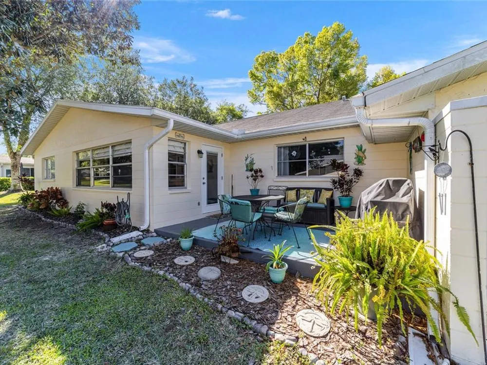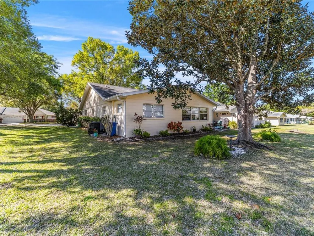 This move-in-ready two-bedroom, two-bath Augusta extended model villa sits on a desirable corner lot in On Top of the World and features a new roof (2025) and 3.5-ton HVAC unit (2024) relocated for quieter operation. With over 1,800 square feet of living space, a large den and a two-car garage with washer and dryer, this home offers comfort and convenience. From the moment you arrive, you'll appreciate the oak tree-lined street, lush landscaping and charming covered front porch, a welcoming first impression with great curb appeal. Inside, vaulted ceilings and a bay window fill the living area with natural light. The updated kitchen boasts stainless steel appliances, quartz countertops, shaker-style cabinets and a breakfast bar, flowing seamlessly into the dining area and Florida room. The owner’s suite features dual closets and an en-suite bath with an oversized vanity and walk-in shower. A spacious den with built-in shelving is ideal for an office or hobby space. Enjoy a private back patio, ideal for relaxing or entertaining. The low-maintenance lifestyle includes HOA-covered basic cable, exterior and roof maintenance, landscaping, irrigation, trash/recycling, and exterior painting every seven years. Resort-style amenities include multiple pools, two fitness centers, pickleball, tennis, bocce ball, billiards, archery, baseball and over 175 clubs. Don’t miss this opportunity, schedule your private showing today and start enjoying the easy, active lifestyle!