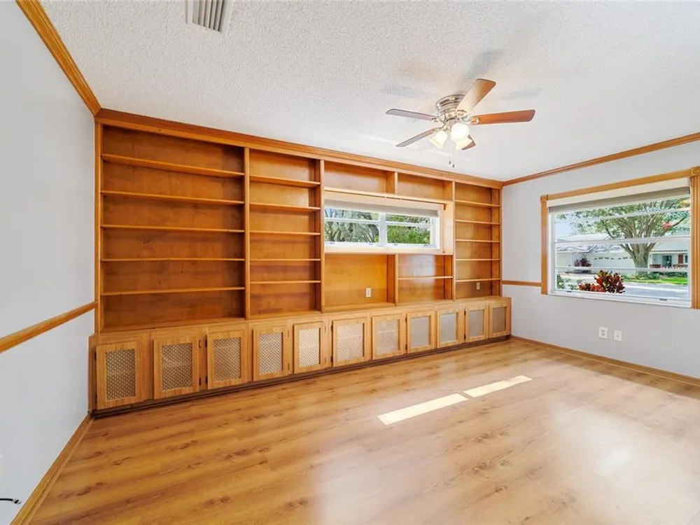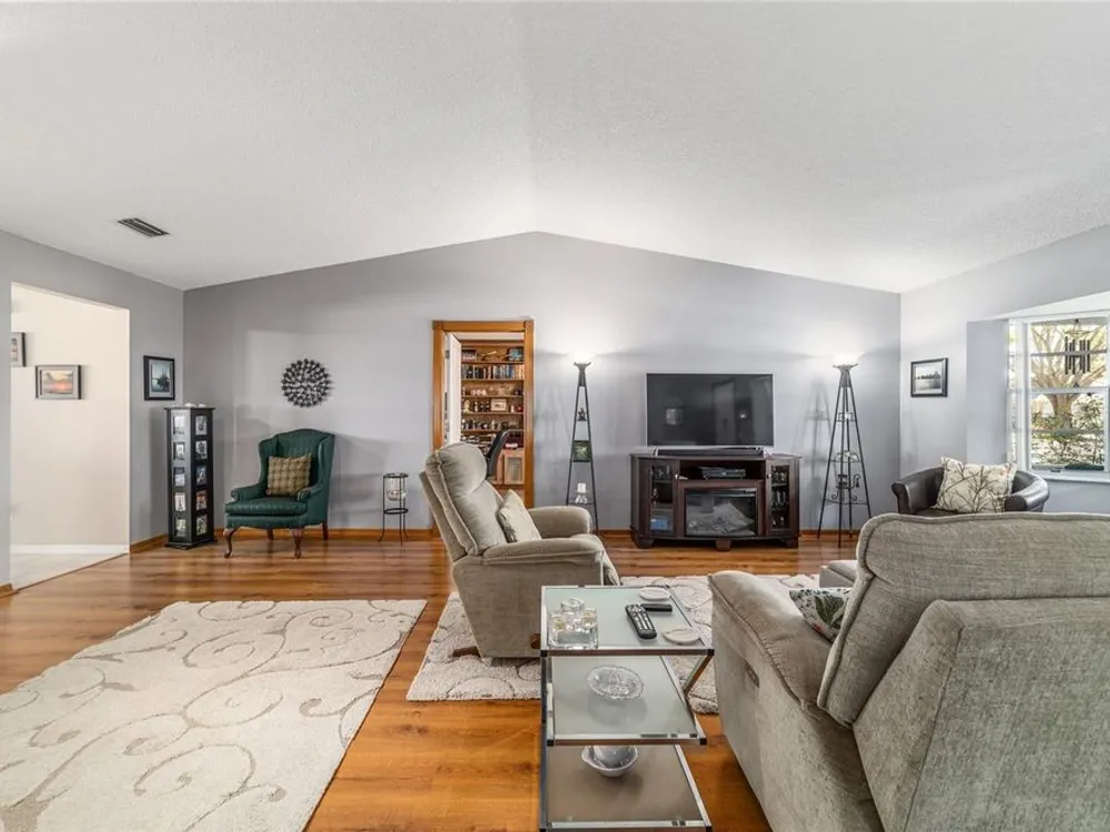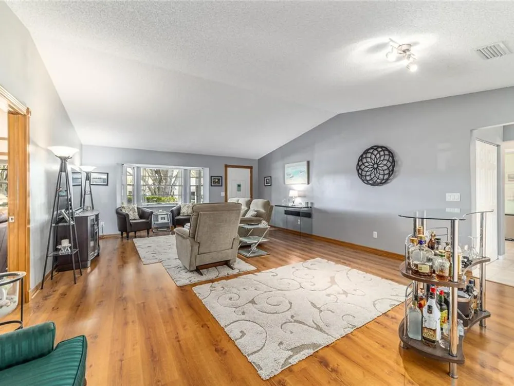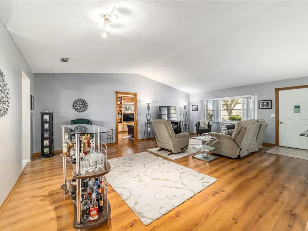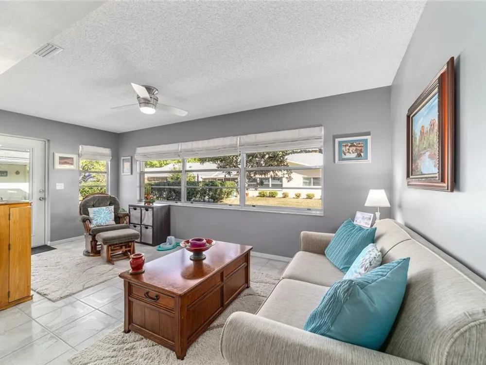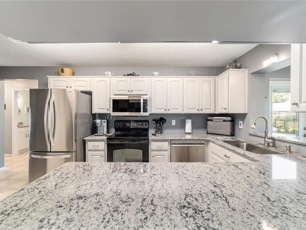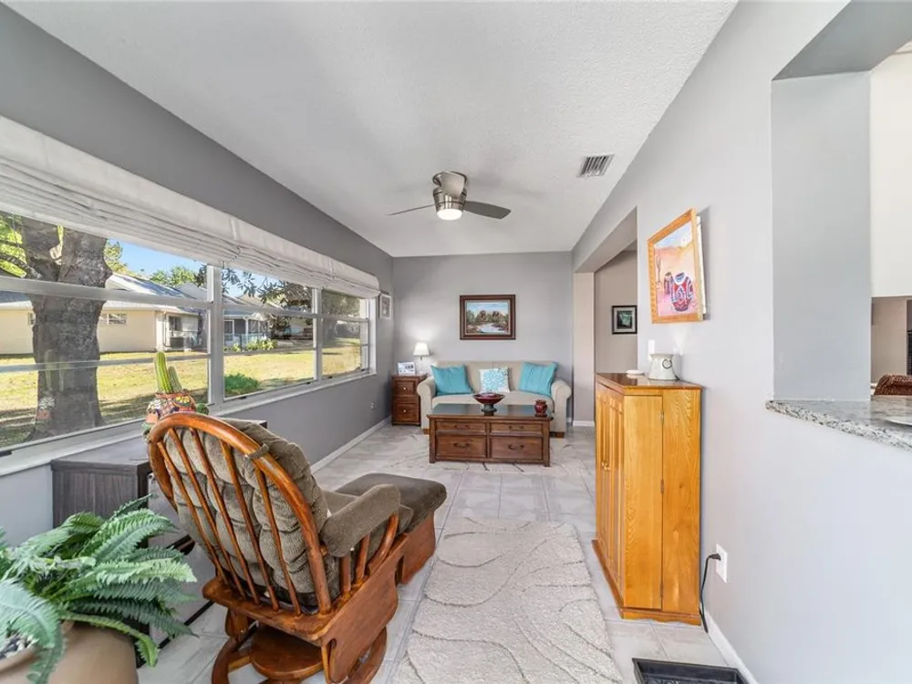 This move-in-ready two-bedroom, two-bath Augusta extended model villa sits on a desirable corner lot in On Top of the World and features a new roof (2025) and 3.5-ton HVAC unit (2024) relocated for quieter operation. With over 1,800 square feet of living space, a large den and a two-car garage with washer and dryer, this home offers comfort and convenience. From the moment you arrive, you'll appreciate the oak tree-lined street, lush landscaping and charming covered front porch, a welcoming first impression with great curb appeal. Inside, vaulted ceilings and a bay window fill the living area with natural light. The updated kitchen boasts stainless steel appliances, quartz countertops, shaker-style cabinets and a breakfast bar, flowing seamlessly into the dining area and Florida room. The owner’s suite features dual closets and an en-suite bath with an oversized vanity and walk-in shower. A spacious den with built-in shelving is ideal for an office or hobby space. Enjoy a private back patio, ideal for relaxing or entertaining. The low-maintenance lifestyle includes HOA-covered basic cable, exterior and roof maintenance, landscaping, irrigation, trash/recycling, and exterior painting every seven years. Resort-style amenities include multiple pools, two fitness centers, pickleball, tennis, bocce ball, billiards, archery, baseball and over 175 clubs. Don’t miss this opportunity, schedule your private showing today and start enjoying the easy, active lifestyle!