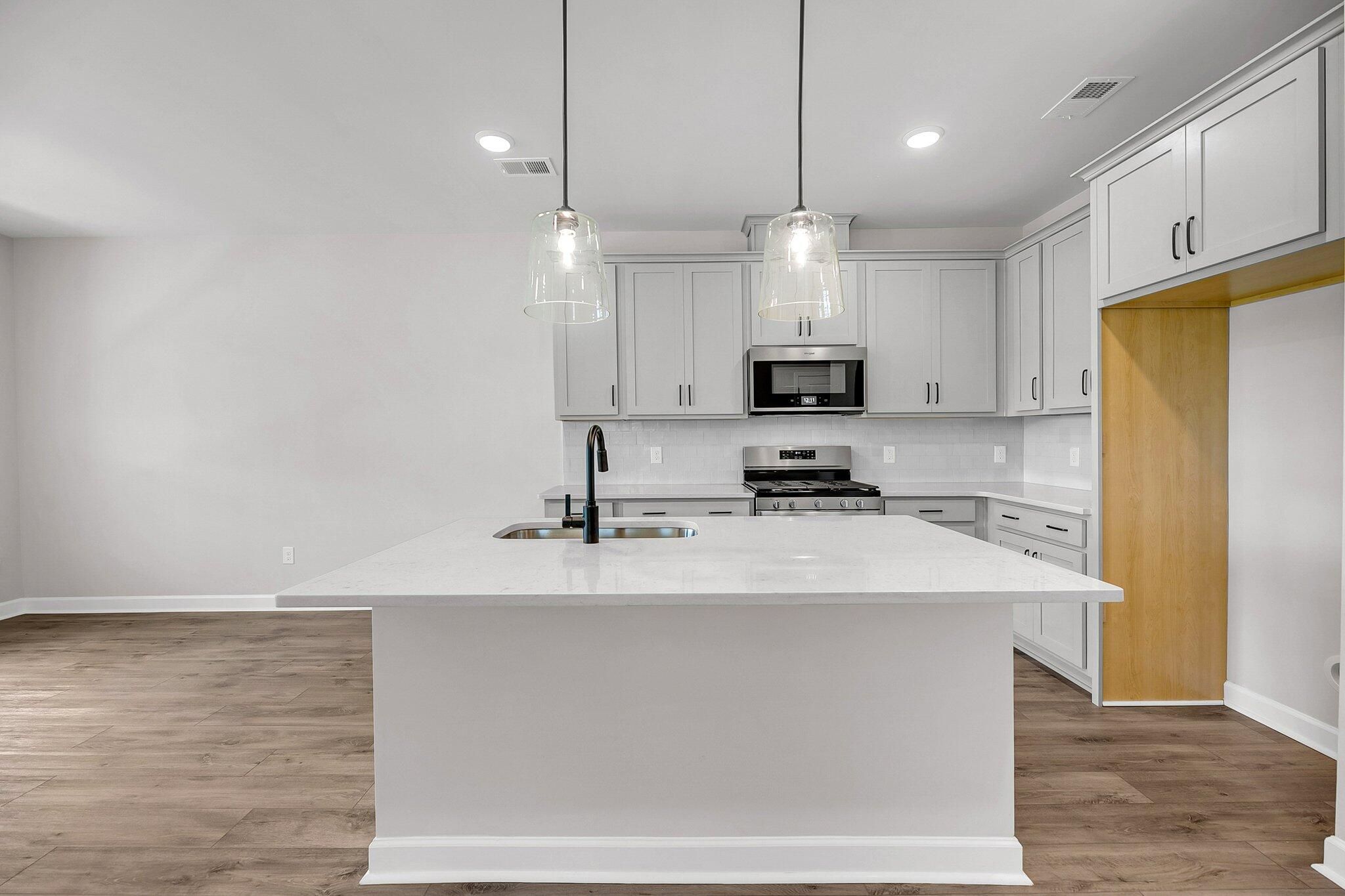 This two bedroom two bathroom end unit villa has a spacious backyard and beautiful front porch perfect for enjoying the lowcountry weather. The home backs to a dense treeline for added privacy in the back. All on one floor, this home has been designed with our stunning Milan design collection. 42'' grey shaker cabinets in the kitchen, quartz countertops, designer white backsplash make a stunning display. The primary suite is towards the back of the home, and its en suite bathroom has tile flooring, a tile zero entry shower, dual vanities with quartz tops, and walk in closet.