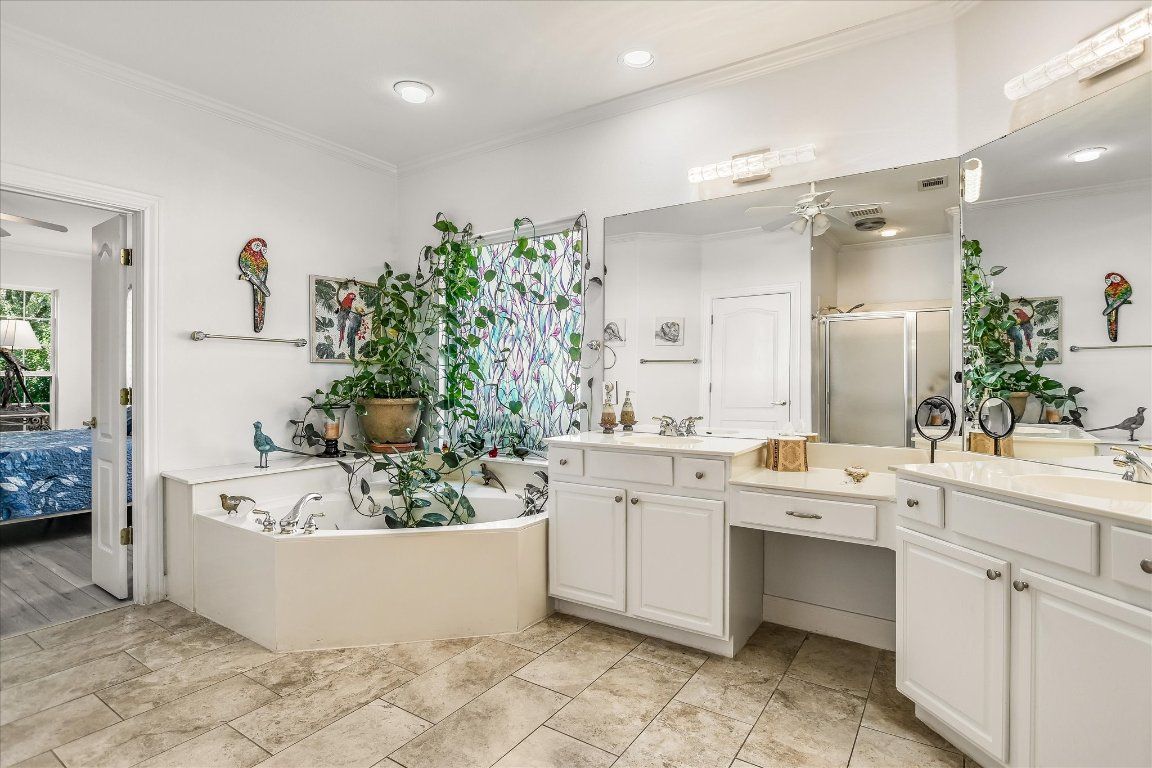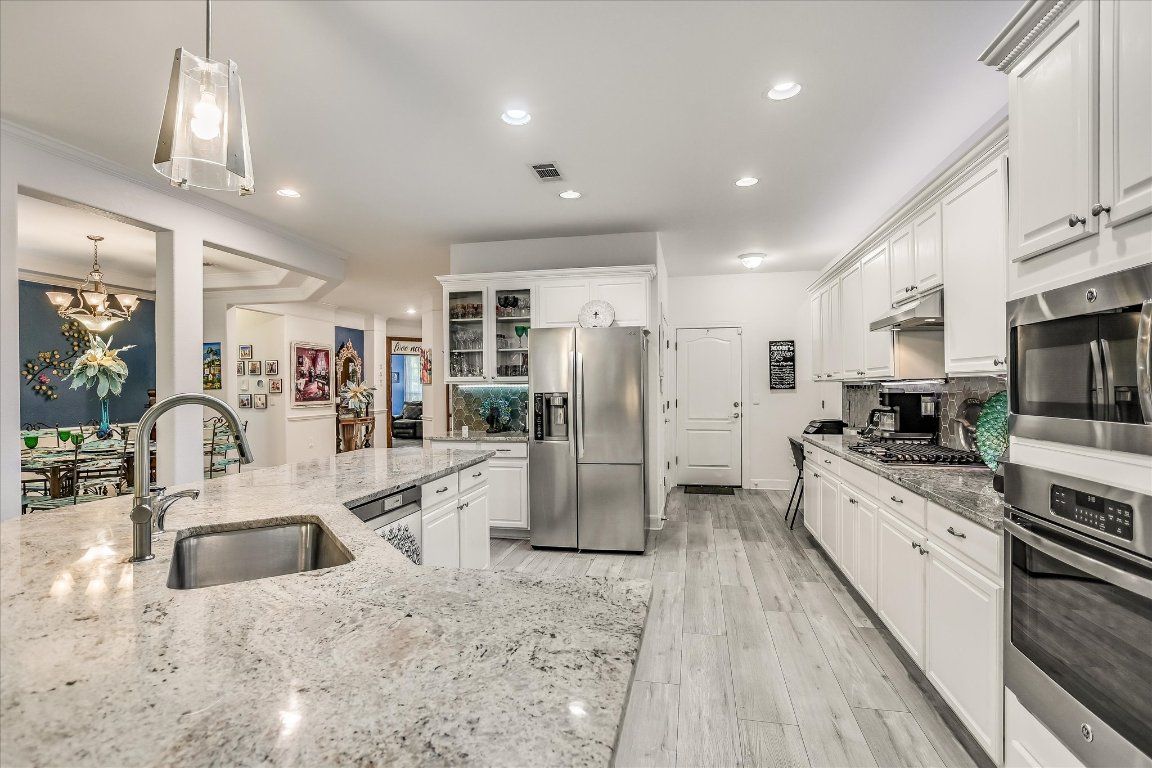- Bookcases, Crown Molding, Separate/Formal Dining Room, Granite Counters, Multiple Living Areas, Multiple Dining Areas, Main Level Primary, NoInteriorSteps, Walk-In Closet(s)