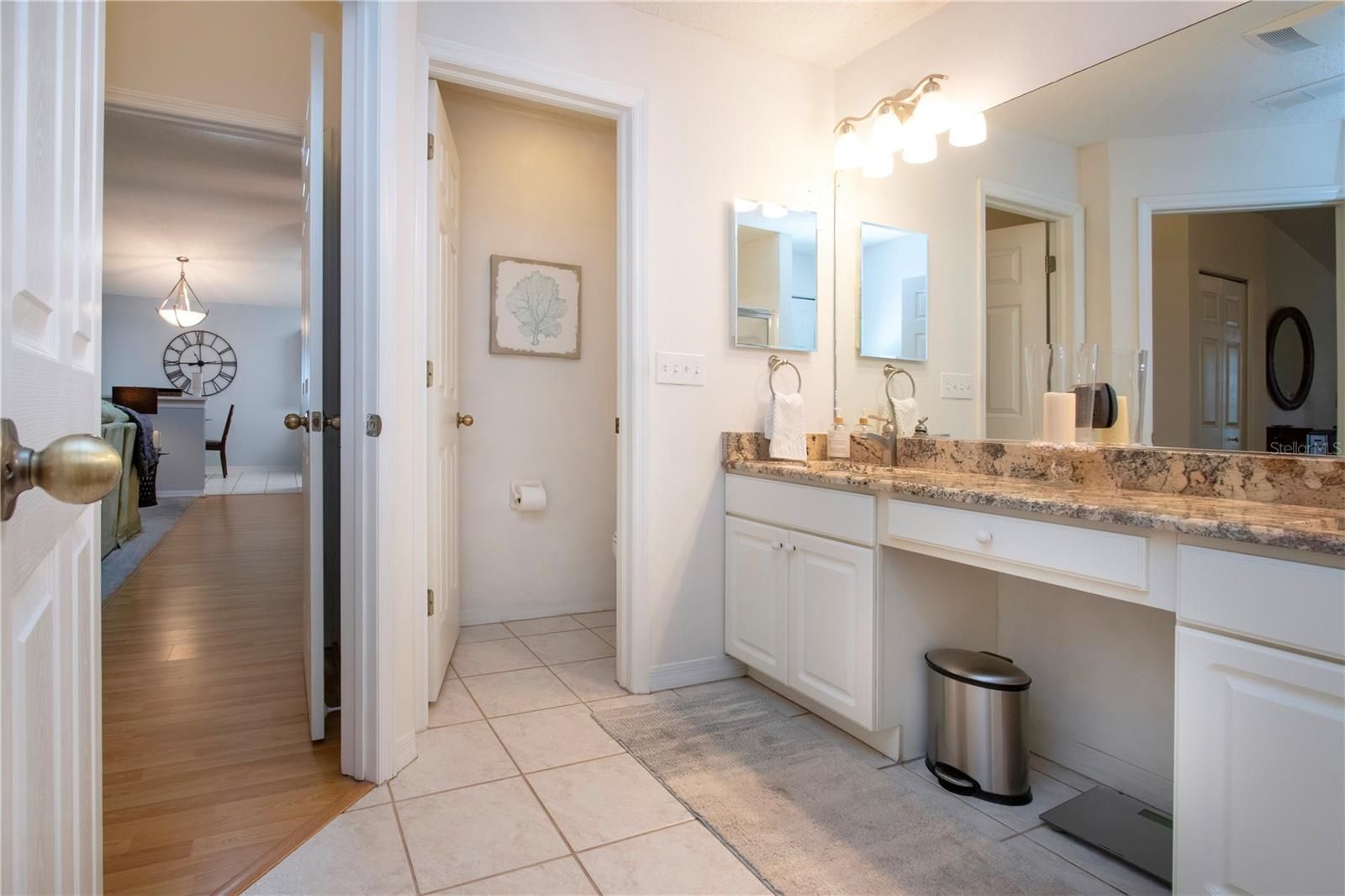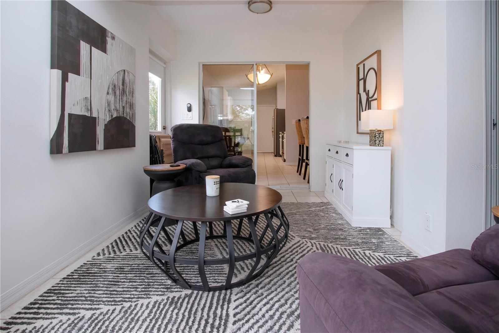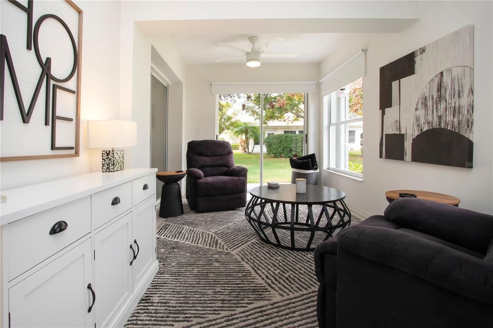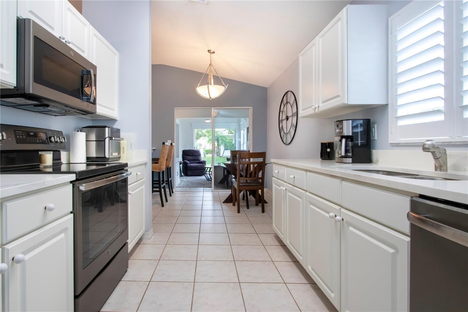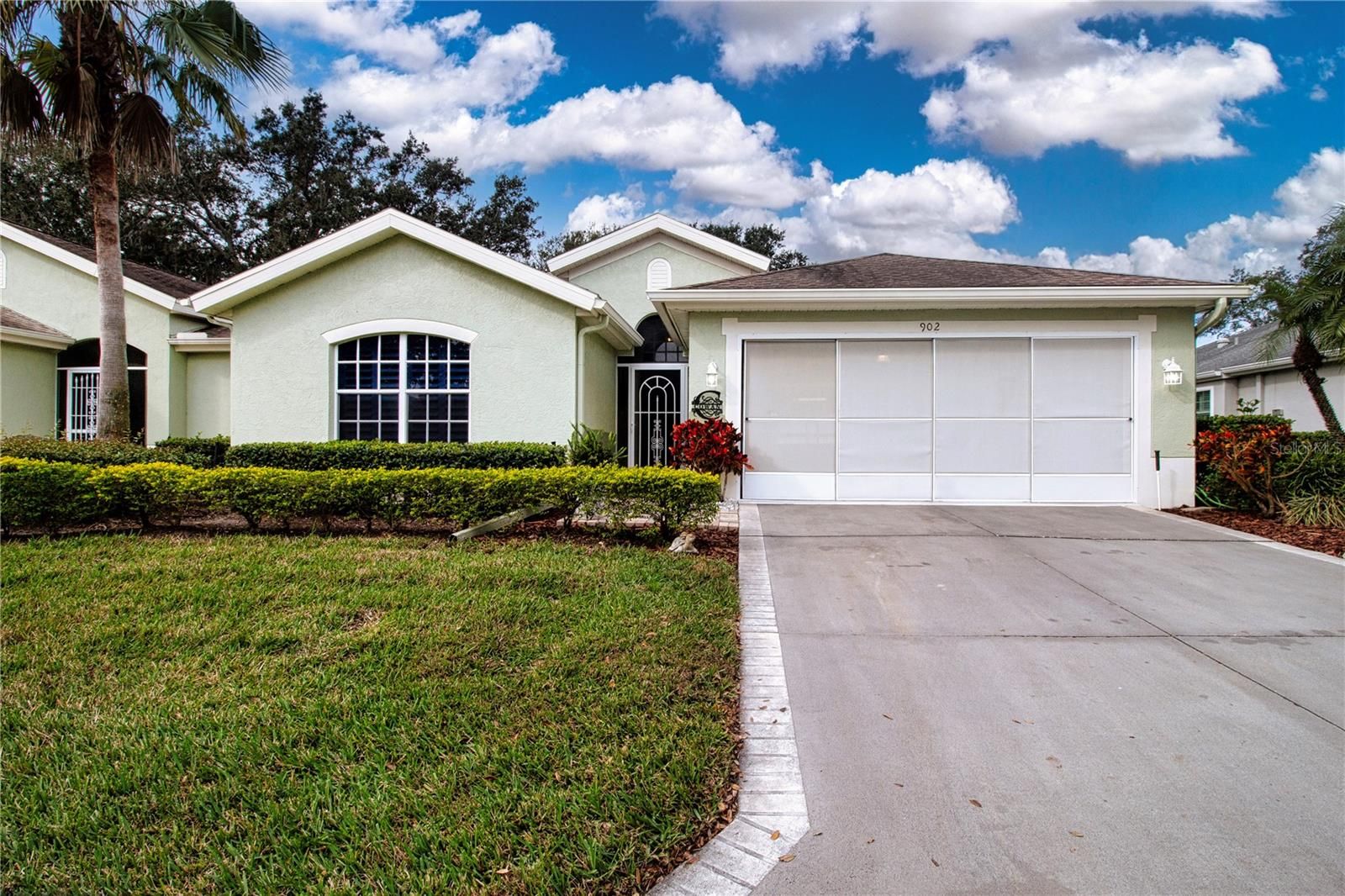 Prepare to be dazzled by this spacious Dartmouth floor plan, featuring a grand 13-foot arched domed doorway as you enter the home. The large living and dining area flows seamlessly into a beautifully air-conditioned Florida room, adorned with plantation shutters that add Southern charm. The galley kitchen boasts of quartz countertops, newer slate shade appliances, solid wood cabinets, and an eat-in area complemented by a bar with seating. Use the bonus room as your office or hobby room. The master bedroom features his and her closets, including a walk-in closet, and the bathroom offers granite countertops with dual sinks and a walk-in shower. The home is enhanced by high ceilings, two solar lights, and three new remote-control fans, along with custom hurricane shutters. The two-car garage includes attic storage, and the property features an irrigation system. This pet-friendly, peaceful location is near the South Clubhouse, offering a resort-style pool, restaurant, bar, and more. The HOA fee covers lawn care, cable, water, sewer, trash, roof replacement, building insurance, exterior painting, pest control, irrigation, security, and all the amenities of Kings Point, including six pools, pickleball, tennis, a fitness center, and an 850-seat veterans theater. This one of a kind 55+ gated community is just 45 minutes from international airports, beaches, sports facilities, Busch Gardens and is located between Tampa and Sarasota. TRAVEL AND LEISURE MAGAZINE has voted Sun City Center as one of the best retirement communities in the U. S. Come join us!