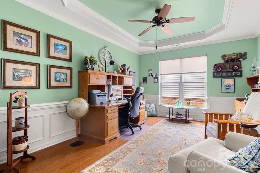 Beautiful Crestwood Meadow on a premium cul-de-sac home-site featuring a stunning 3-season room and extensive upgrades throughout. Wood flooring in the main living areas, crown molding, upgraded lighting, and soft neutral paint create a warm, inviting feel. The gourmet kitchen with breakfast nook, offers granite countertops, a spacious island, stainless steel appliances, gas cooktop with exterior vent, tile backsplash, walk-in pantry, built-in desk, and abundant cabinetry. Large windows overlook the backyard and provide abundant natural light. The spacious primary suite features a tray ceiling, a large walk-in closet, and a well-appointed bath with dual sink vanity and custom tile shower. Two guest bedrooms share a hall bath with walk-in tiled shower. The all-glass 3-season room with tile flooring opens to a rear paver patio with electric awning and privacy landscaping. Grill conveys. Sun City Carolina Lakes Residents enjoy resort-style amenities including a championship golf course, expansive clubhouse, indoor and outdoor pools, state-of-the-art fitness center, tennis and pickleball courts, walking trails, social clubs, woodworking shop, and a full calendar of activities designed for active adult living.
