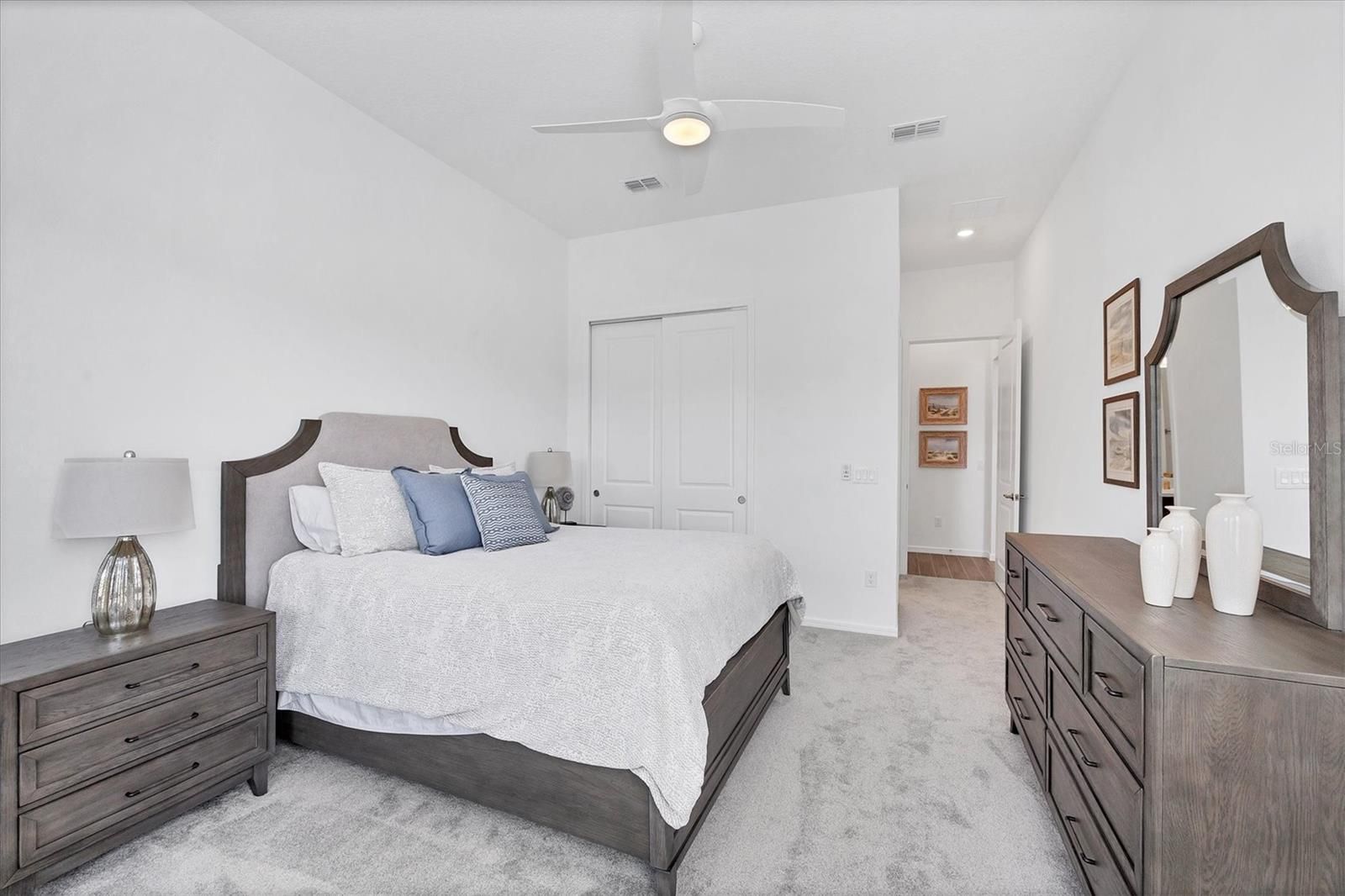 - Ceiling Fan(s), Coffered Ceiling(s), Crown Molding, High Ceilings, In-Wall Pest Control, Open Floorplan, Main Level Primary, Smart Home, Solid Surface Counters, Solid-Wood Cabinets, Split Bedrooms, Thermostat, Tray Ceiling(s), Walk-In Closet(s), Window Treatments