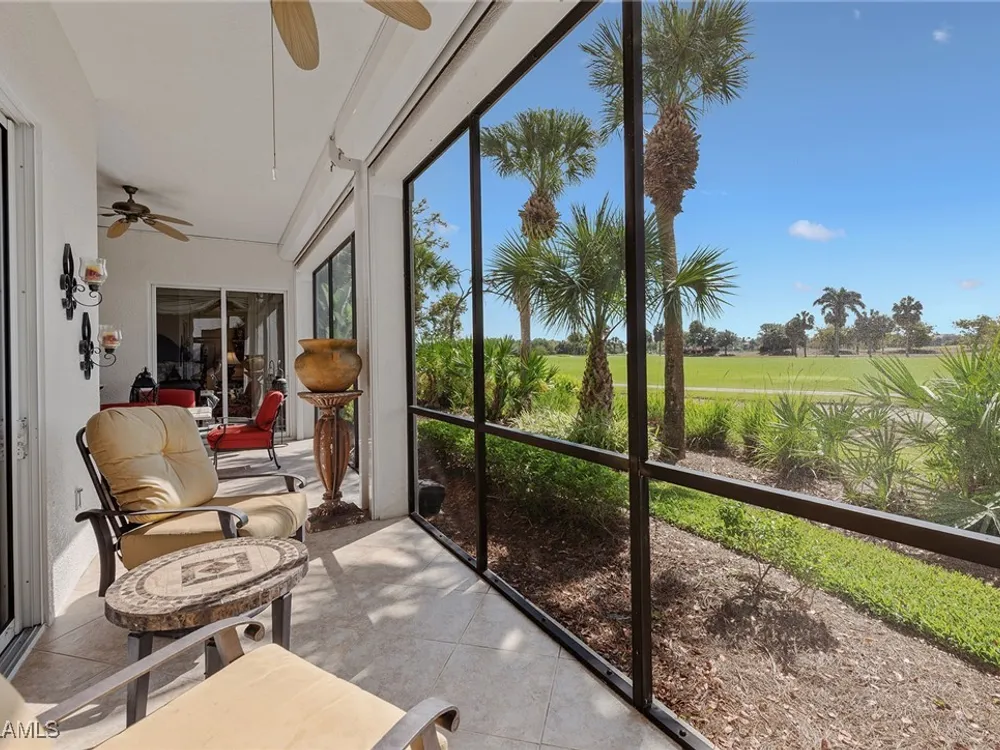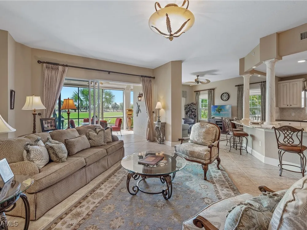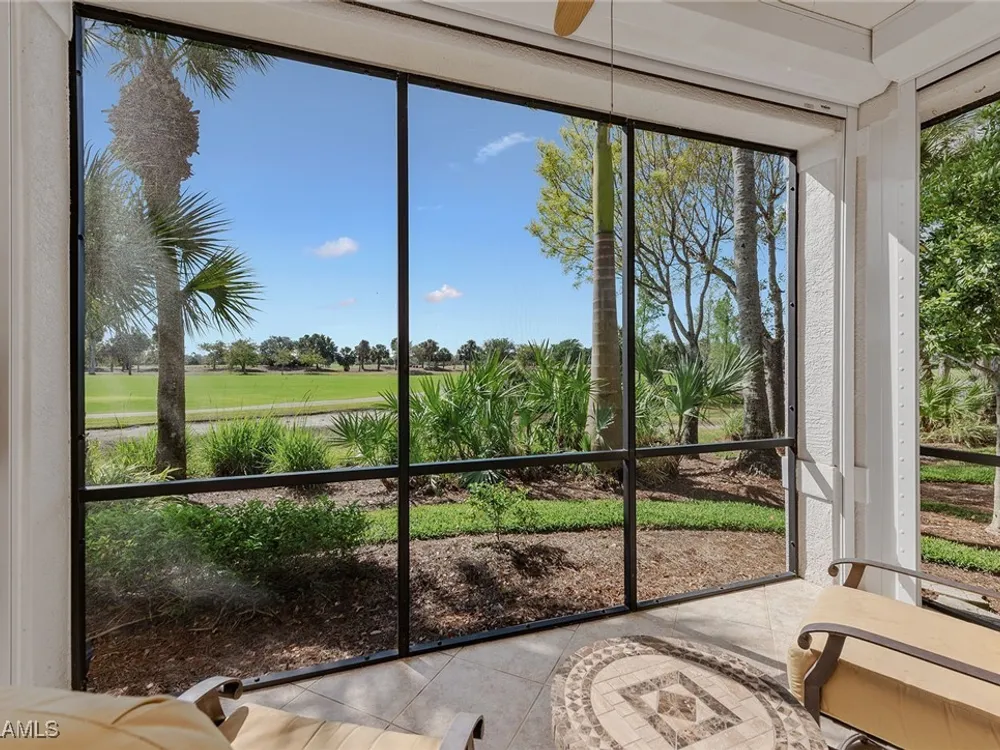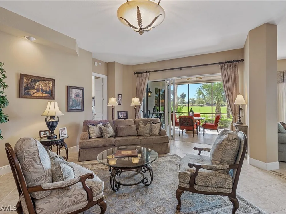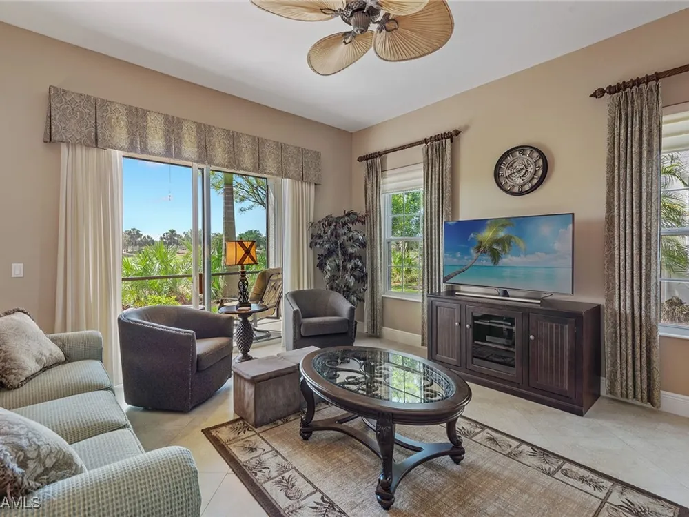 Introducing a beautifully maintained three-bedroom plus study, two full-bath coach home with two-car garage in the sought-after double-gated Cascada neighborhood of Fiddler’s Creek. Ideally on the first floor, this end-unit offers tranquil southeastern golf course views, an inviting courtyard entry, and a functional layout designed for comfort and elegance. Tile flooring runs throughout the main living areas, creating a seamless flow between expansive living room, family room and kitchen. Offered furnished, this condominium is filled with abundant natural light, enhanced by large windows and sliding doors that frame picturesque views of the golf course from multiple vantage points, including the main living areas, lanai and primary suite. The kitchen is a central gathering space, featuring a large island ideal for casual dining or entertaining, complemented by a stylish tile backsplash, natural gas cooking and generous cabinet space. Whether you're preparing a quiet meal or hosting guests, the open-concept design connects the kitchen with the surrounding living and dining areas, offering functionality and flow. A newer HVAC system (2020) and a tankless water heater add modern efficiency and value. The primary suite is a private retreat with double door entry, two walk-in closets, featuring a primary bath with dual vanities, and a separate tub and shower. A set of double doors leads into the versatile den, ideal for a home office, media room or additional guest space. Go out to the screened lanai with electric hurricane screens and enjoy the serenity of the surrounding greenery and golf course views, an ideal spot for morning coffee or evening relaxation. The thoughtful design of this home allows for natural breezes and plenty of sunshine to fill the space throughout the day, creating a bright and airy atmosphere. Additional highlights of Cascada are the newer exterior paint, newer roof, lush landscaping, convenient village pool and a gated cul-de-sac street with no drive-through traffic. Enjoy access to world-class amenities including the award-winning Club & Spa, offering fine and casual indoor/outdoor poolside dining, fitness center with trainers and classes, resort-style pools, hot tub, spa services, sauna, steam room, bocce, an active tennis and pickleball program, and an extensive event calendar. Optional beach and marina memberships are available, and you also have the option to join the equity Creek Golf Course with new clubhouse and newly renovated golf course. Outstanding location with Publix, nail salon, hair salon, urgent care and a health food café/store coming soon, just outside the gate. Convenient to executive airport, parks, museums, kayaking, paddleboarding, beach yoga, restaurants, boutiques, art galleries and all Naples and Marco Island popular activities.
