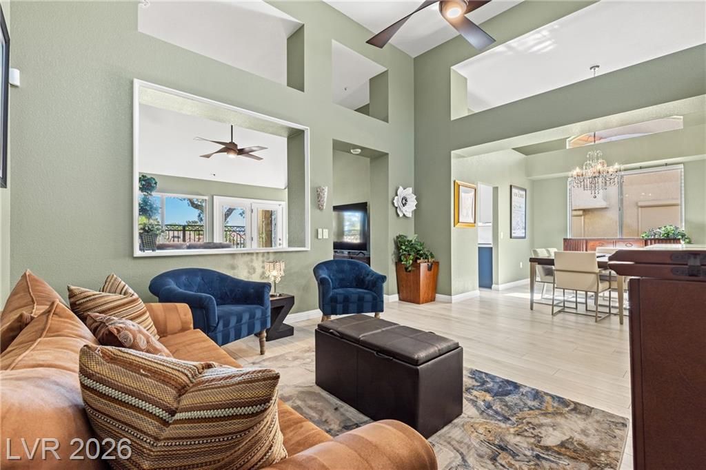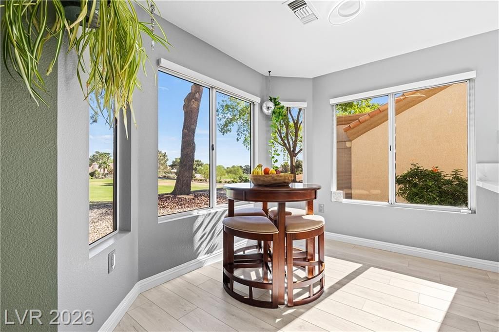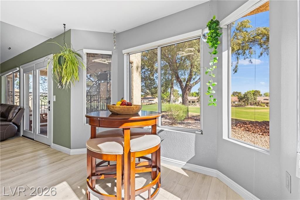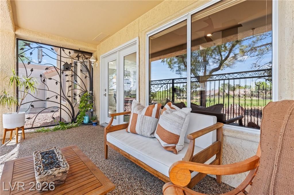 Stunning golf course & mountain views set the stage for this beautiful two bedroom two bath townhome showcasing true pride of ownership. The remodeled kitchen features wood- like laminate flooring, quartz countertops, new cabinets, GE café appliances, a breakfast bar and a cozy kitchen nook. Vaulted ceiling's and ceiling fans enhance the bright airy floor-plan. The primary suite offers golf course views, large walk-in closet with mirror closet doors and an updated bathroom with modern vanity and glass enclosed shower. Additional highlights include all appliances, a two car garage with storage and laundry area and a private gated patio ideal for relaxing enjoying sunsets and watching golfers pass by. Located in Sun City Summerlin a premier 55+ community offering resort style amenities including clubhouse , pools, golf courses fitness center , tennis courts , pickle-ball courts and parks. Experience the best of active living in this exceptional home.