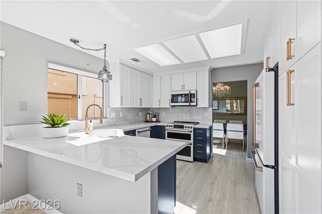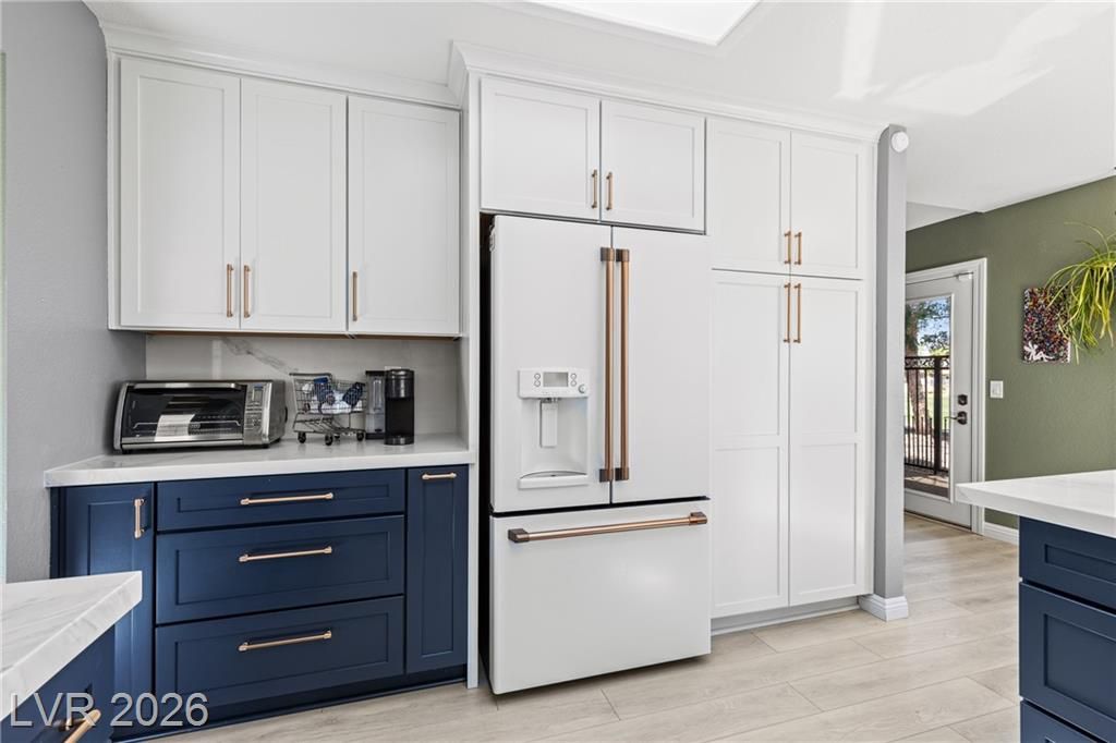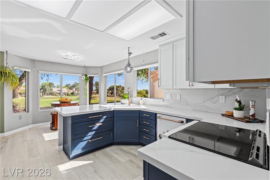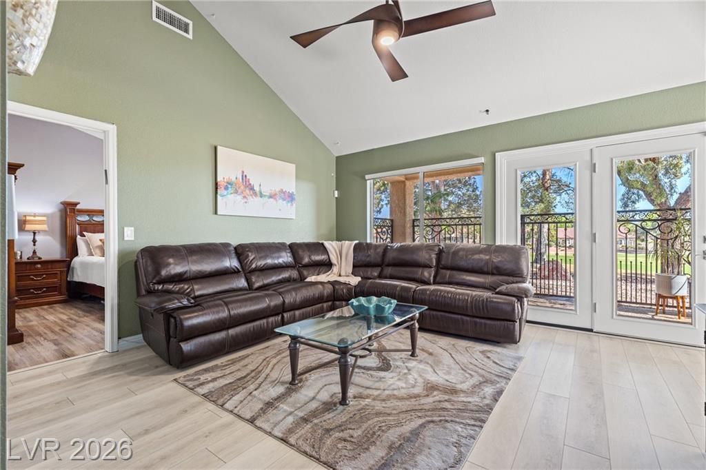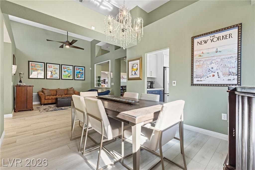 Stunning golf course & mountain views set the stage for this beautiful two bedroom two bath townhome showcasing true pride of ownership. The remodeled kitchen features wood- like laminate flooring, quartz countertops, new cabinets, GE café appliances, a breakfast bar and a cozy kitchen nook. Vaulted ceiling's and ceiling fans enhance the bright airy floor-plan. The primary suite offers golf course views, large walk-in closet with mirror closet doors and an updated bathroom with modern vanity and glass enclosed shower. Additional highlights include all appliances, a two car garage with storage and laundry area and a private gated patio ideal for relaxing enjoying sunsets and watching golfers pass by. Located in Sun City Summerlin a premier 55+ community offering resort style amenities including clubhouse , pools, golf courses fitness center , tennis courts , pickle-ball courts and parks. Experience the best of active living in this exceptional home.