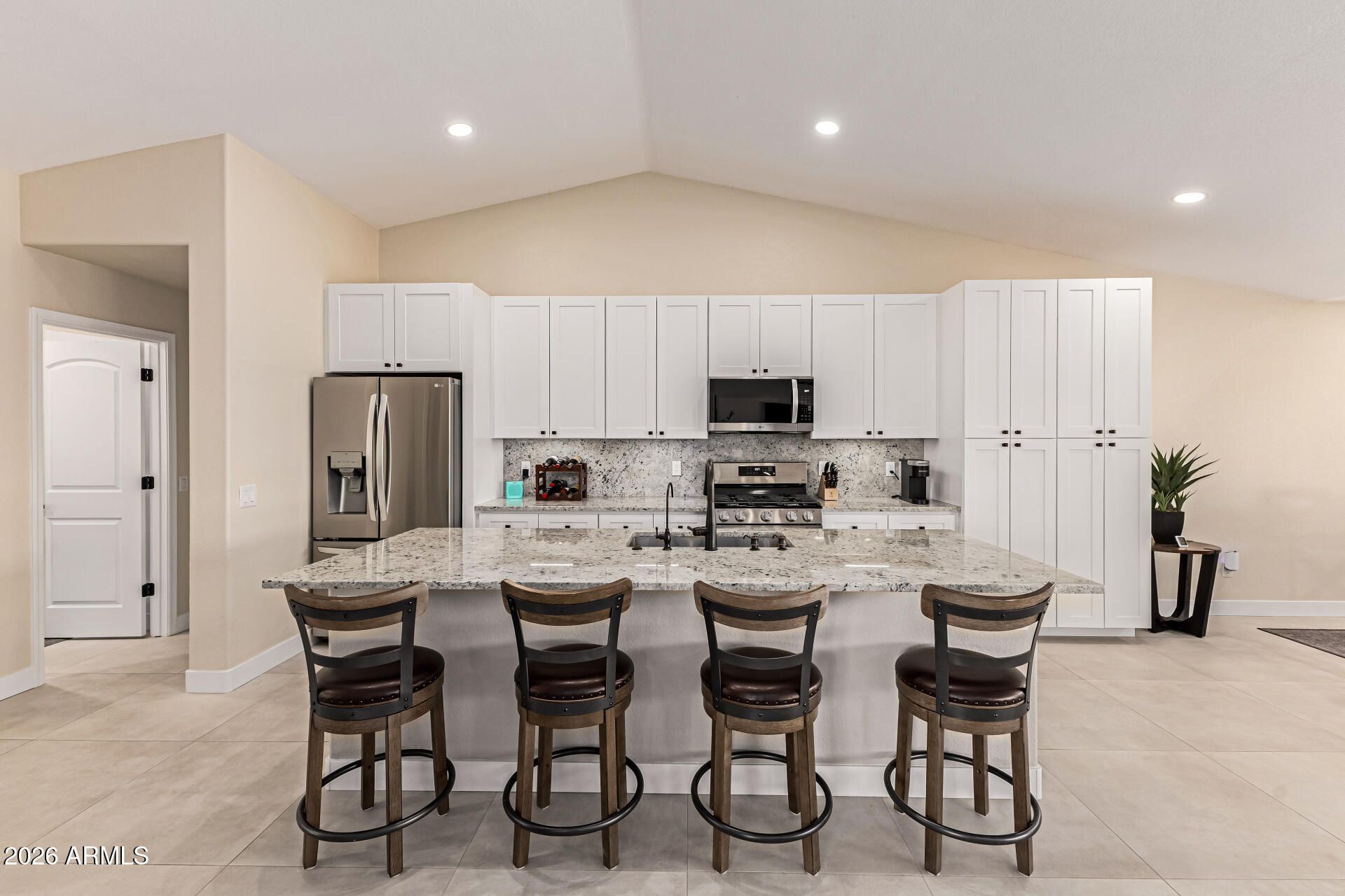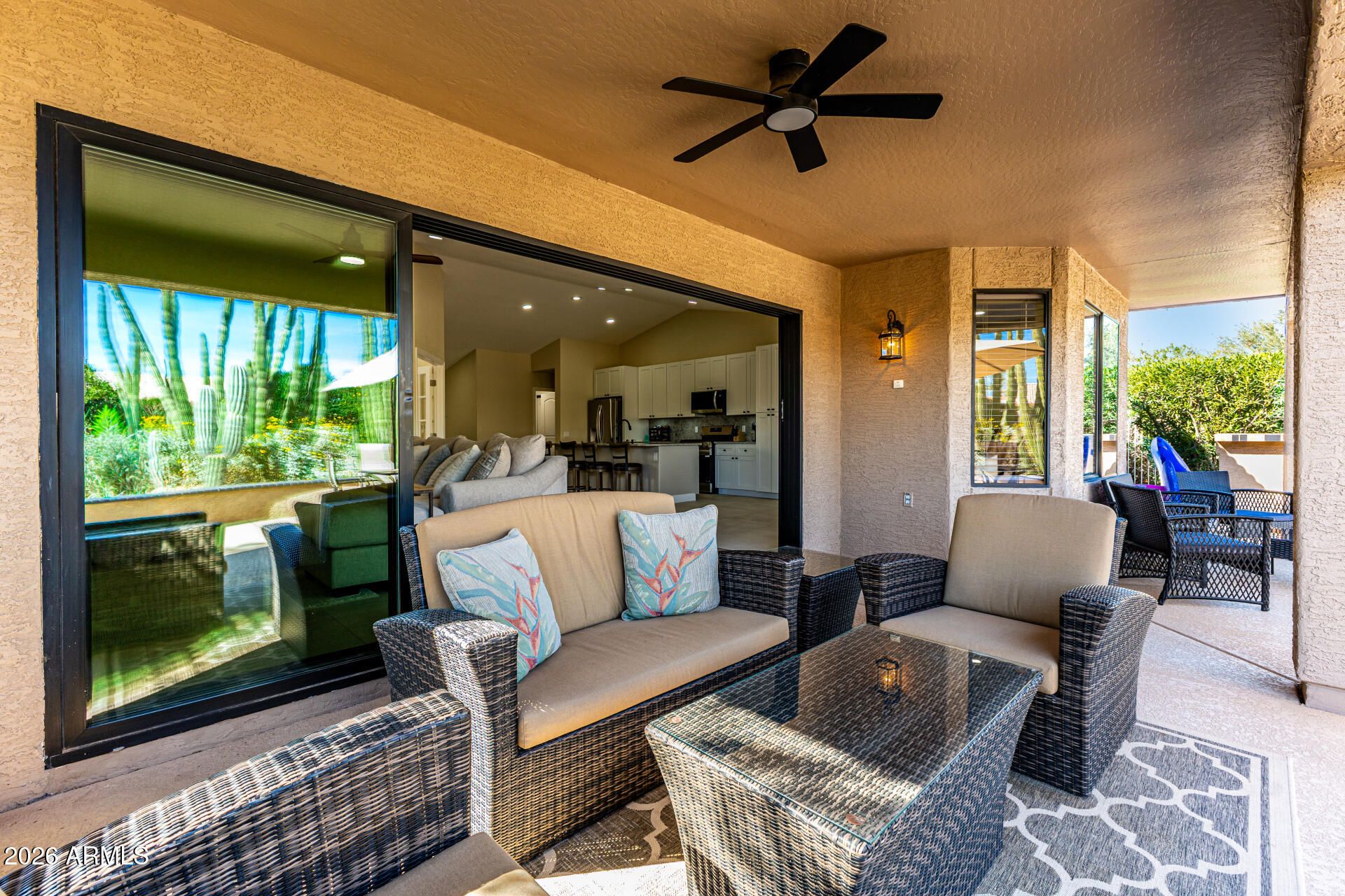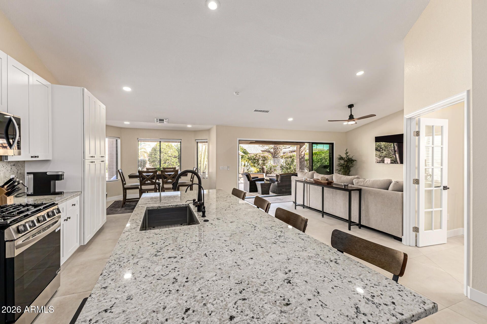 STUNNING, fully reimagined home offering luxury upgrades and modern smart home features throughout. This redesigned open concept floor plan features 30'' x 30'' tile flooring, LED lighting with dimmers, and a dramatic 16' stacking glass slider that seamlessly connects indoor and outdoor living. The kitchen showcases a large granite island, new soft-close cabinetry, stainless steel appliances including a 5-burner gas stove, RO system, and touch sensitive faucet. Both bathrooms have been beautifully renovated with granite vanities, soft-close cabinets, comfort-height toilets, heated LED mirrors, and a marble shower in the primary suite. The primary bedroom also features an expanded walk in closet with custom built-ins. Major upgrades include new HVAC and duct work, new roof, new plumbing... fixtures throughout, Ecobee Wi-Fi thermostat, Wi-Fi keypad lock, whole-house water softener, new interior paint, and new carpet in bedrooms. Backyard oasis features a new PebbleTec resurfaced pool, new variable speed pump and filter, LED pool lighting, gas firepit with stainless steel fire ring and new logs, updated landscape lighting, irrigation system, and 50-amp patio service for a future spa. Truly move in ready with high end finishes and resort style living.
