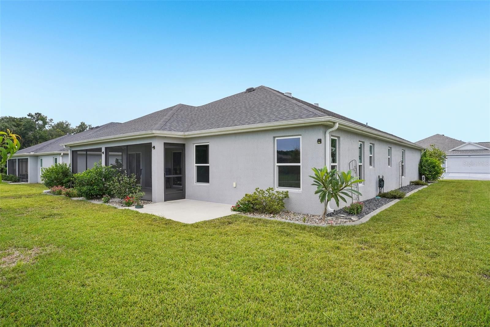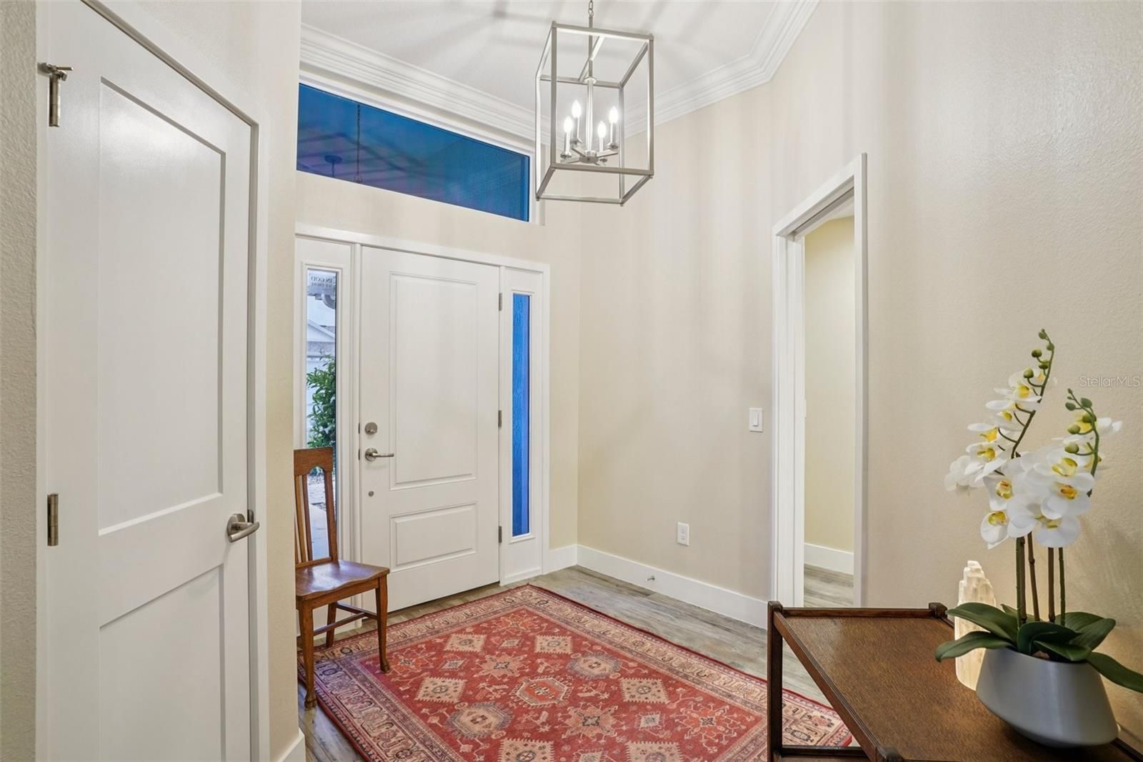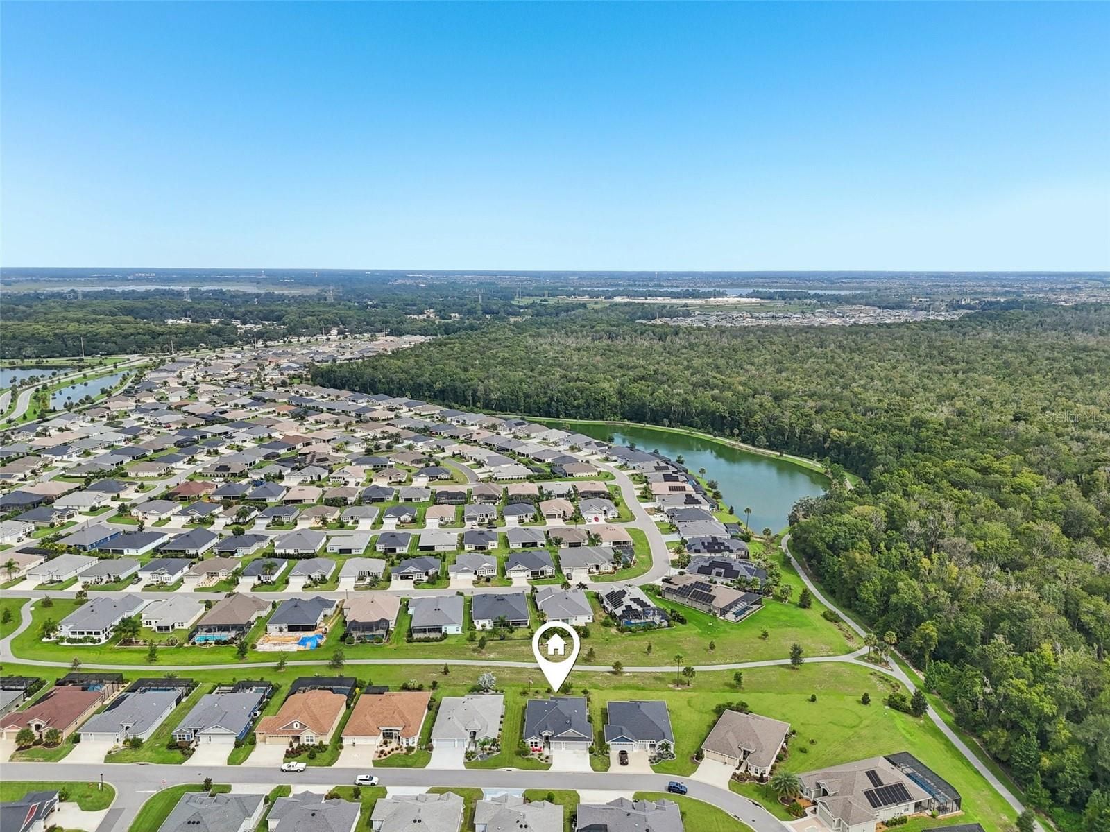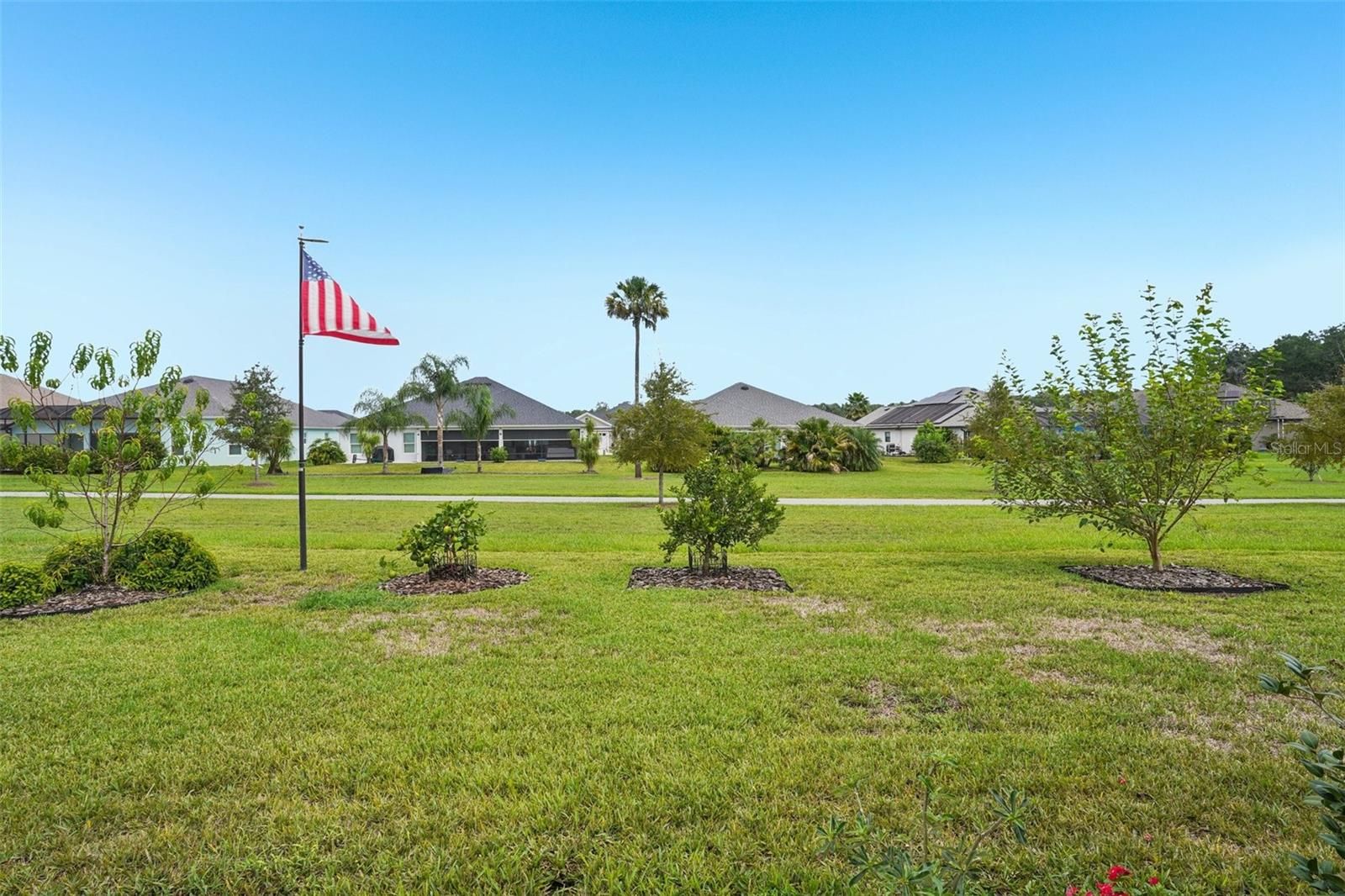 This luxury designer Iris model offers three bedrooms and two baths . From the moment you step inside, you’re welcomed by a roomy entrance with a coat closet for guests. Tile flooring graces the main living areas and baths in a warm, neutral wood-look finish, while the bedrooms feature carpeting for added comfort. The kitchen is a chef’s delight, featuring cabinetry with pull-out drawers, under-cabinet and indirect lighting, and a large island with sink. The open design flows seamlessly into the living area, where a Bose surround sound system enhances your entertainment experience. Each bedroom is equipped with a custom closet system—one room thoughtfully configured into a private office with desk and hutch. The third bedroom serves as a comfortable guest retreat. The primary suite is a true sanctuary with a tray ceiling and windows overlooking the serene green space. Its bath offers a tiled walk-in shower and a remarkable converted closet, designed as a luxury dressing room with vanity, shoe storage, cabinetry, and lined drawers for jewelry. This home is enriched with smart and practical upgrades including a lighted flagpole, gutters, invisible pet fence with dog door, Kinetico water softener, whole-house surge protector, lightning rods, and tinted windows throughout. Natural light pours in through three solar tubes, brightening the kitchen, guest bath, and primary closet. The garage is as functional as it is refined, featuring custom cabinetry, a utility sink, insulated doors, pull-down ladder access to an insulated attic with solar powered fan, and a gleaming epoxy-coated floor. Outdoors, the professionally landscaped lot showcases St. Augustine lawn with concrete edgeing and river rock, complemented by a variety of fruit trees—peach, ponderosa lemon, orange, mulberry, avocado, and fig—as well as vibrant flowering plants including gardenia, camellia, lantana, plumeria, hibiscus, bottle brush, and Bird of paradise. A mandevilla vine greets you at the entry with a cascade of blooms. The home backs to tranquil green space with a bike and walking path that leads to shaded trails and peaceful ponds, perfect for quiet strolls and relaxation. Its location is ideal—just steps from the Aviary Recreation Center with a family pool and minutes from the Ezell Recreation Center, offering a gym, sports pool, bocce, and pickleball. Nearby you’ll also find the Sawgrass Entertainment Market with its dining and live entertainment, plus convenient access to Brownwood Square and the up-and-coming Eastport Square, which will feature even more shopping, dining, and entertainment options.
