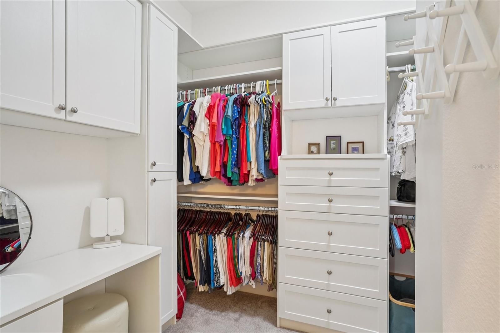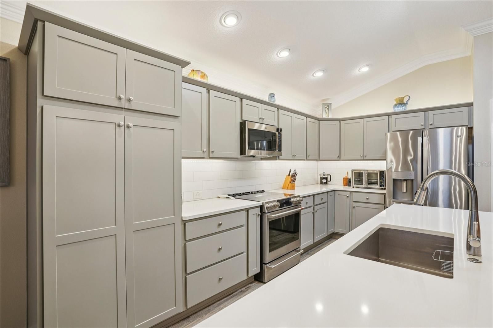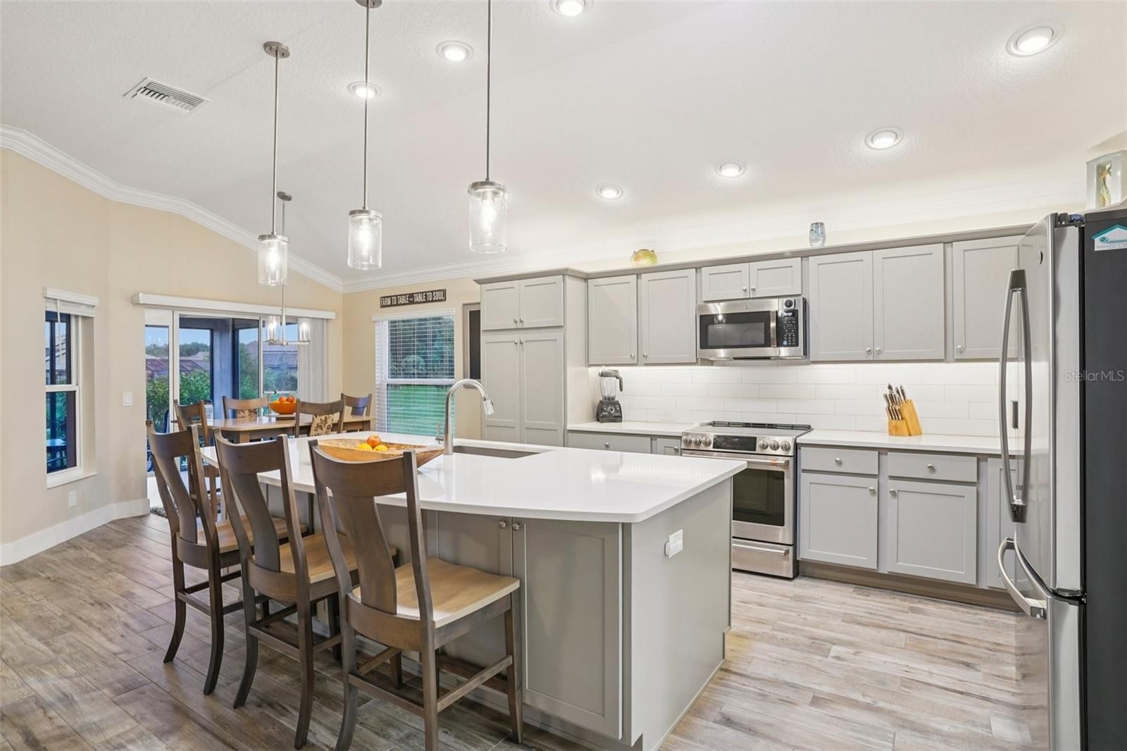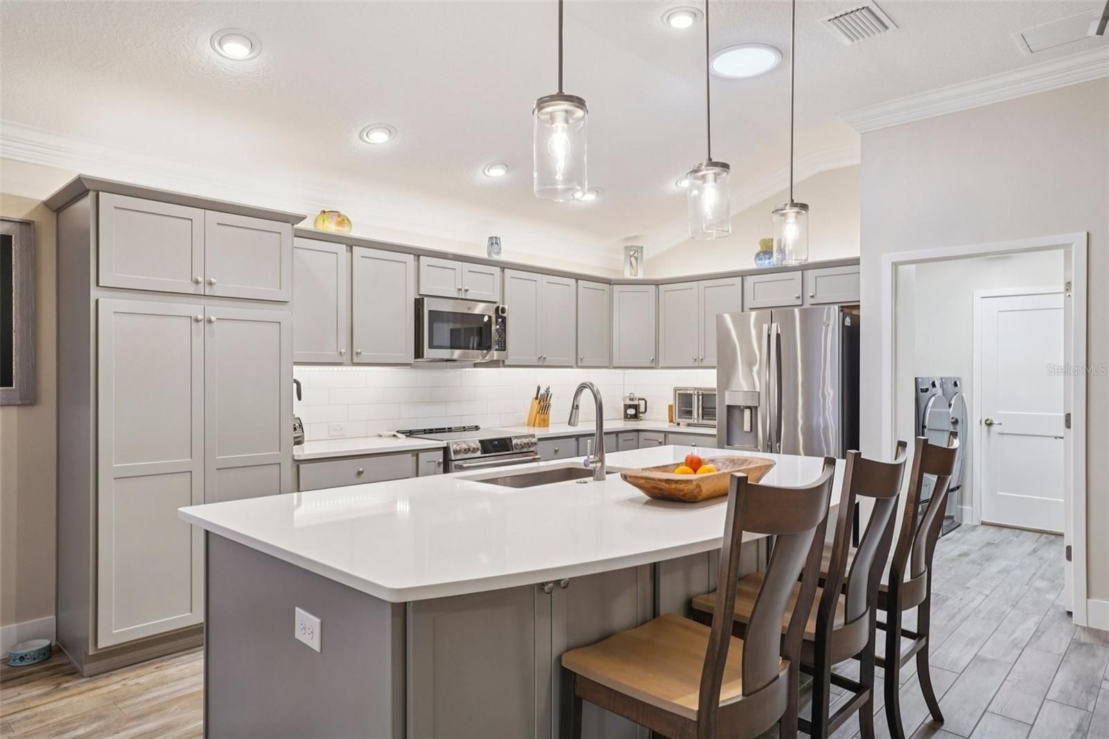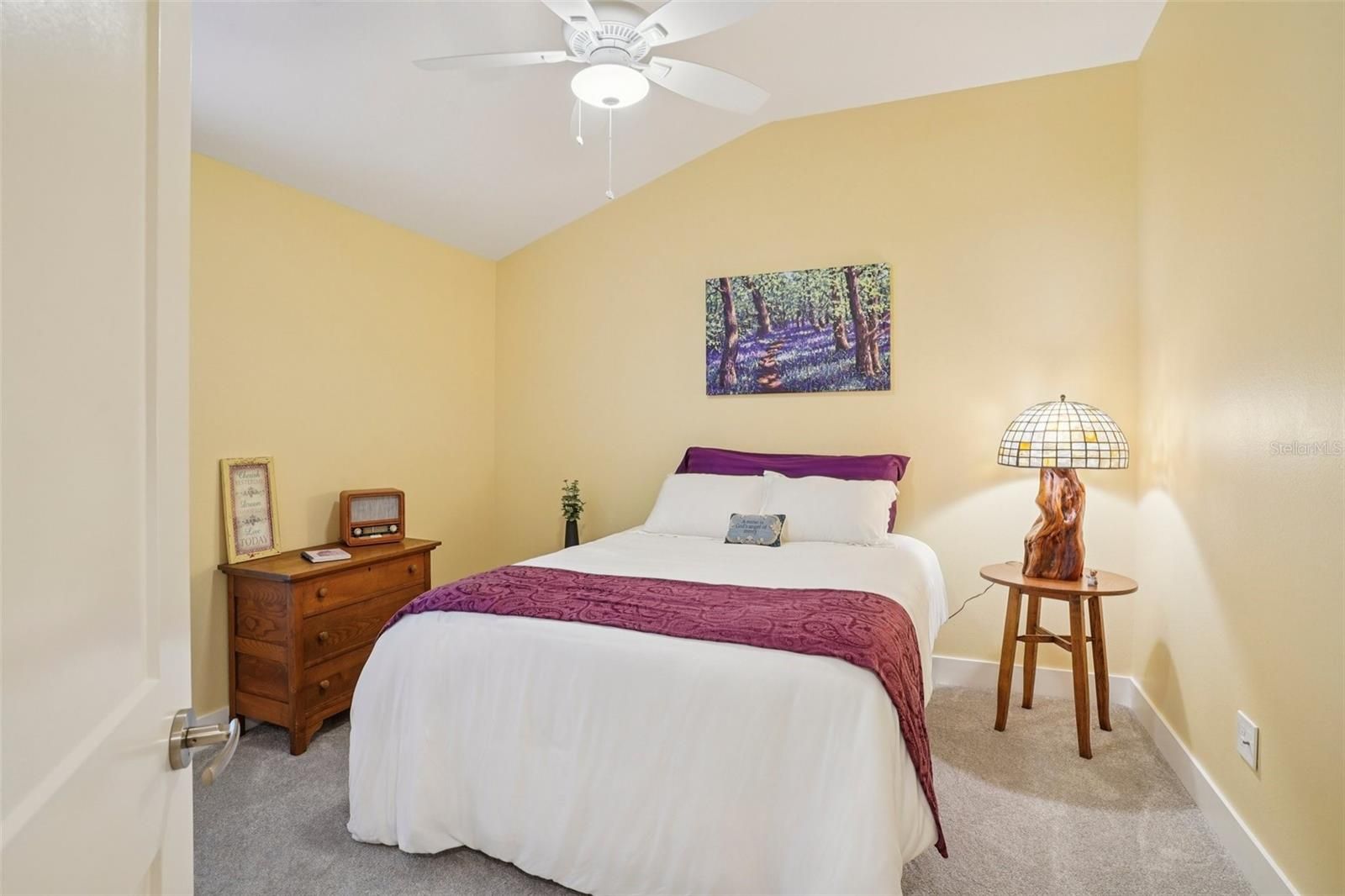 This luxury designer Iris model offers three bedrooms and two baths . From the moment you step inside, you’re welcomed by a roomy entrance with a coat closet for guests. Tile flooring graces the main living areas and baths in a warm, neutral wood-look finish, while the bedrooms feature carpeting for added comfort. The kitchen is a chef’s delight, featuring cabinetry with pull-out drawers, under-cabinet and indirect lighting, and a large island with sink. The open design flows seamlessly into the living area, where a Bose surround sound system enhances your entertainment experience. Each bedroom is equipped with a custom closet system—one room thoughtfully configured into a private office with desk and hutch. The third bedroom serves as a comfortable guest retreat. The primary suite is a true sanctuary with a tray ceiling and windows overlooking the serene green space. Its bath offers a tiled walk-in shower and a remarkable converted closet, designed as a luxury dressing room with vanity, shoe storage, cabinetry, and lined drawers for jewelry. This home is enriched with smart and practical upgrades including a lighted flagpole, gutters, invisible pet fence with dog door, Kinetico water softener, whole-house surge protector, lightning rods, and tinted windows throughout. Natural light pours in through three solar tubes, brightening the kitchen, guest bath, and primary closet. The garage is as functional as it is refined, featuring custom cabinetry, a utility sink, insulated doors, pull-down ladder access to an insulated attic with solar powered fan, and a gleaming epoxy-coated floor. Outdoors, the professionally landscaped lot showcases St. Augustine lawn with concrete edgeing and river rock, complemented by a variety of fruit trees—peach, ponderosa lemon, orange, mulberry, avocado, and fig—as well as vibrant flowering plants including gardenia, camellia, lantana, plumeria, hibiscus, bottle brush, and Bird of paradise. A mandevilla vine greets you at the entry with a cascade of blooms. The home backs to tranquil green space with a bike and walking path that leads to shaded trails and peaceful ponds, perfect for quiet strolls and relaxation. Its location is ideal—just steps from the Aviary Recreation Center with a family pool and minutes from the Ezell Recreation Center, offering a gym, sports pool, bocce, and pickleball. Nearby you’ll also find the Sawgrass Entertainment Market with its dining and live entertainment, plus convenient access to Brownwood Square and the up-and-coming Eastport Square, which will feature even more shopping, dining, and entertainment options.