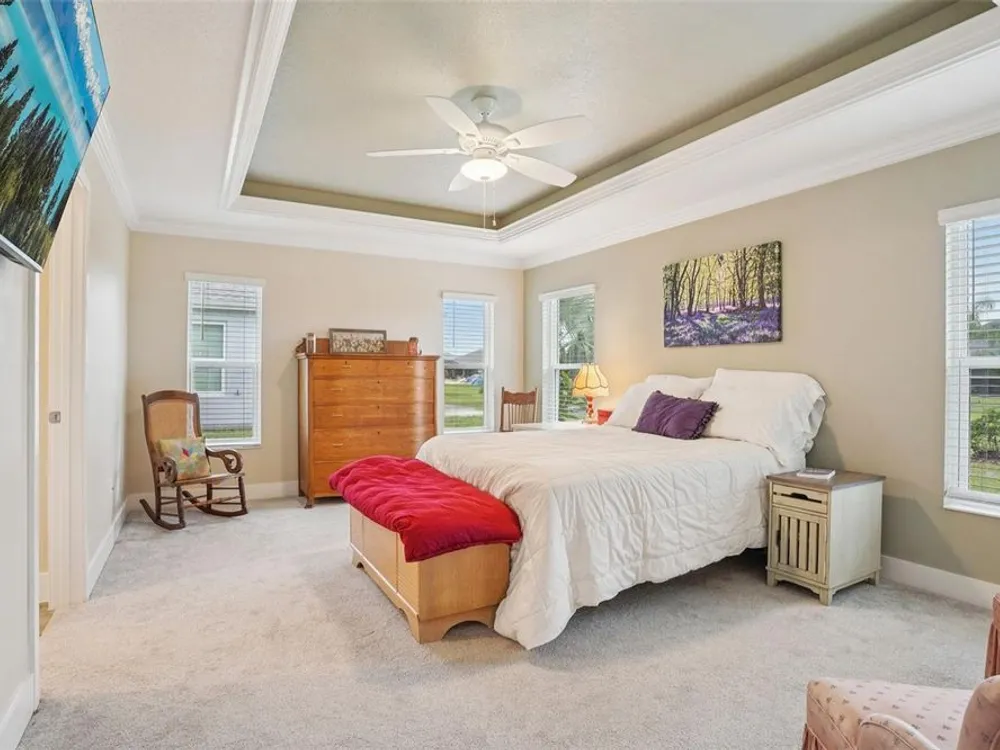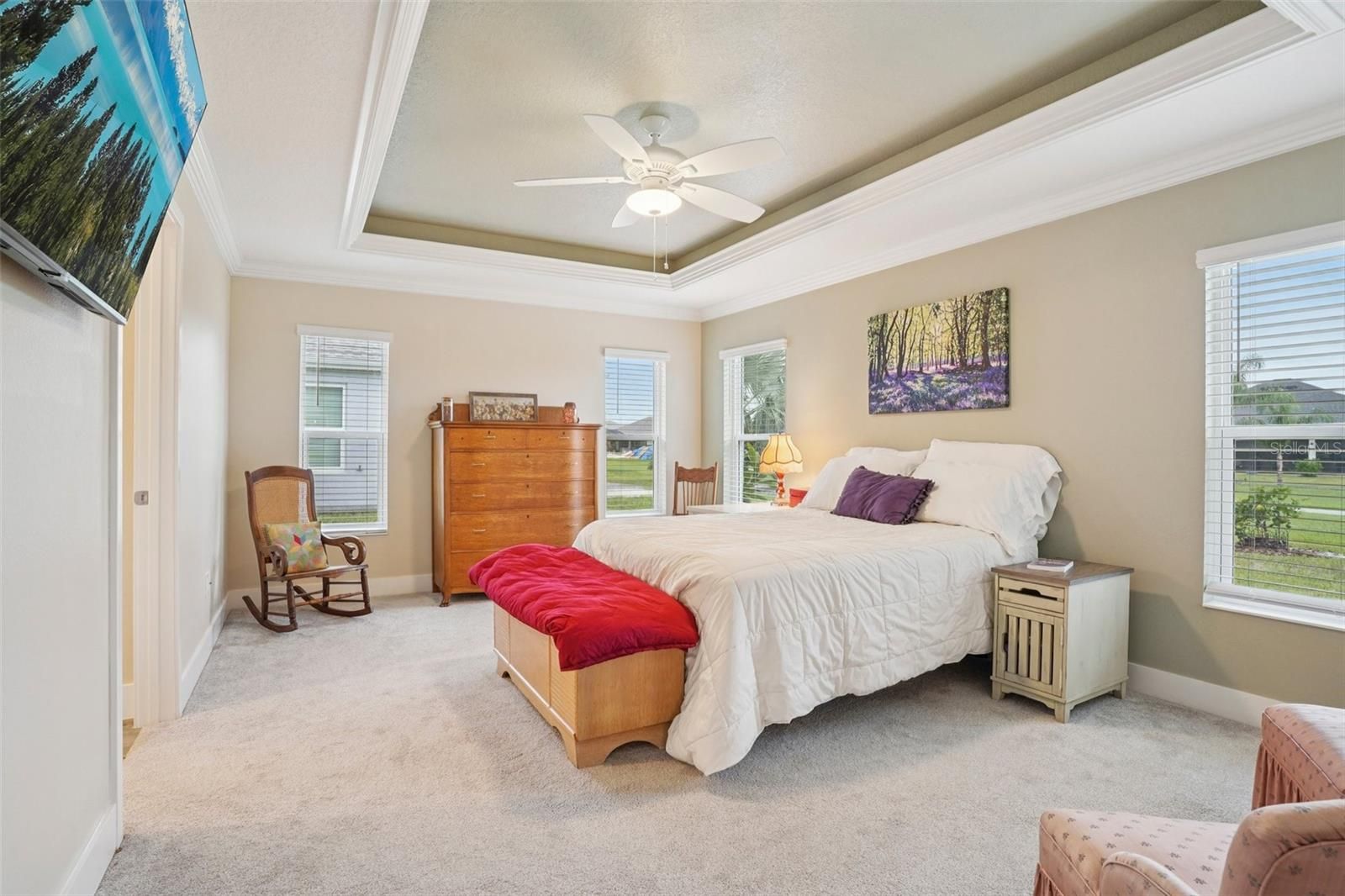 - Ceiling Fan(s), Crown Molding, High Ceilings, Open Floorplan, Main Level Primary, Solid Surface Counters, Split Bedrooms, Thermostat, Tray Ceiling(s), Window Treatments