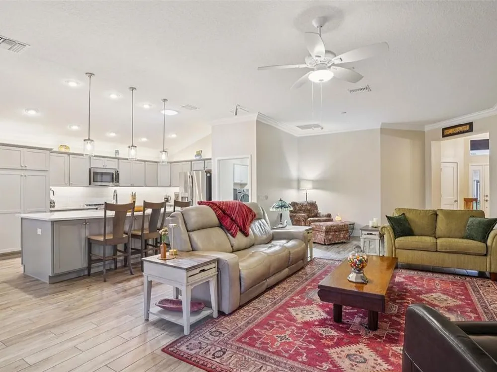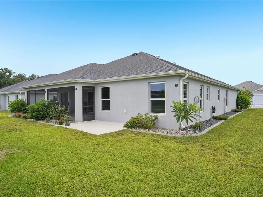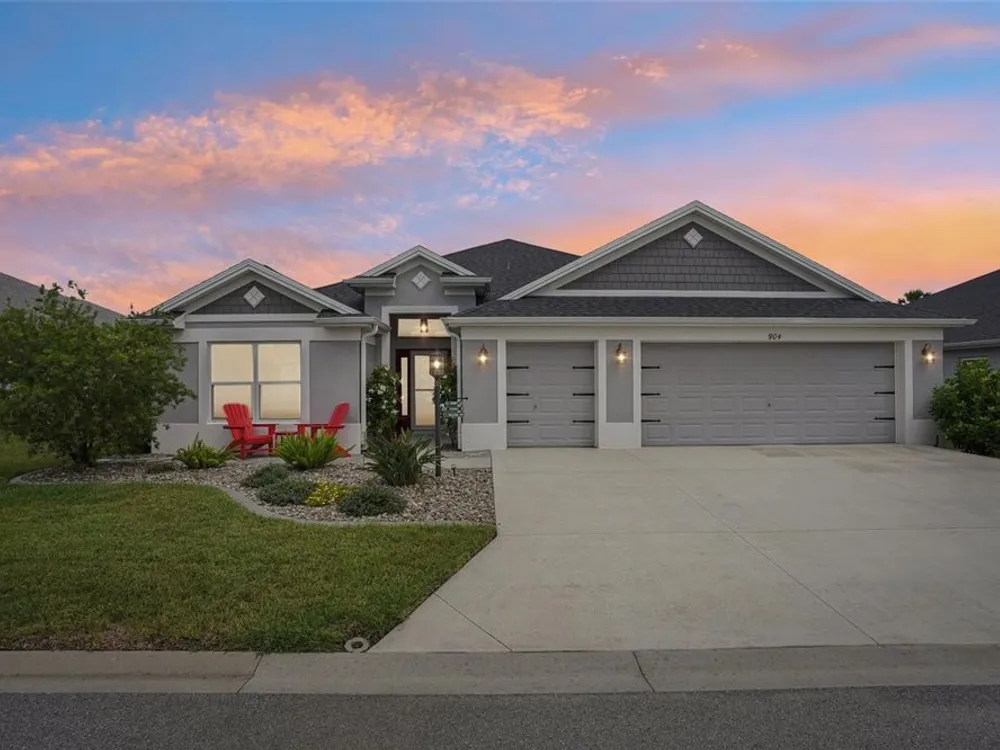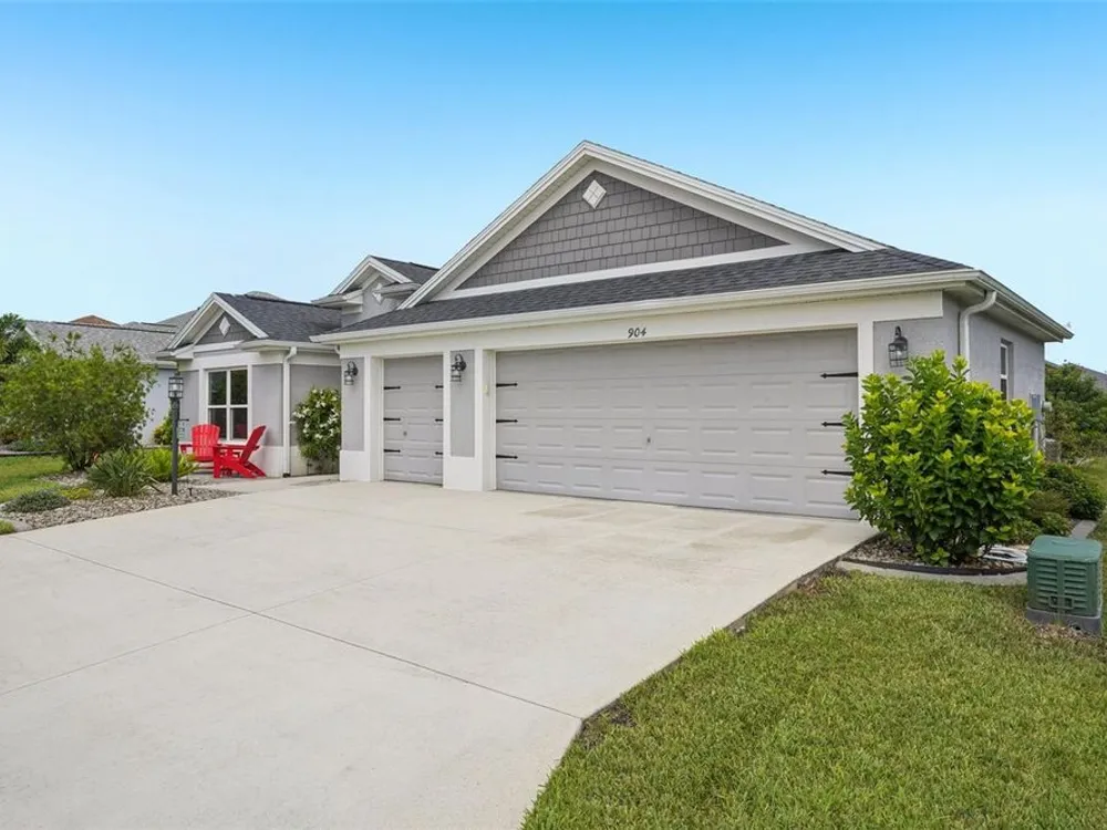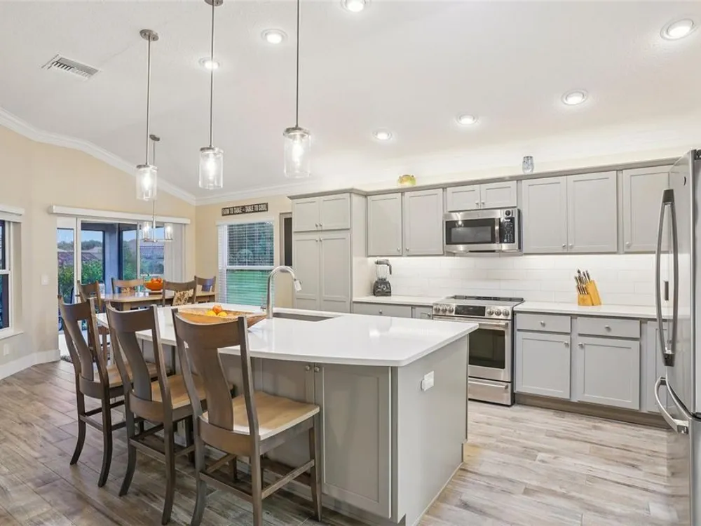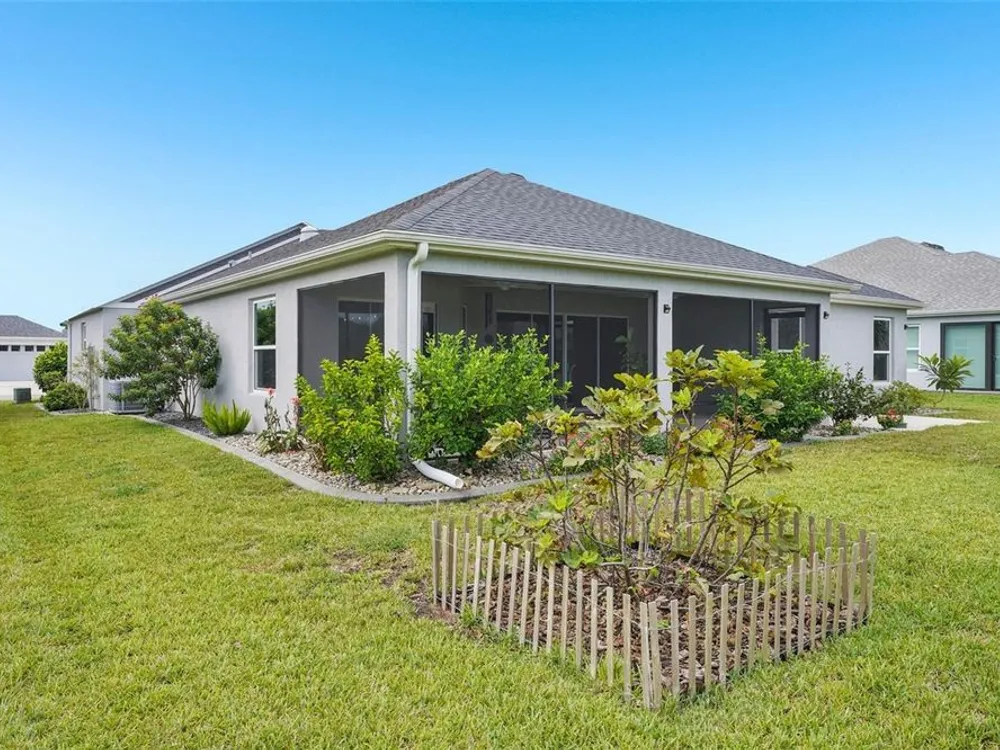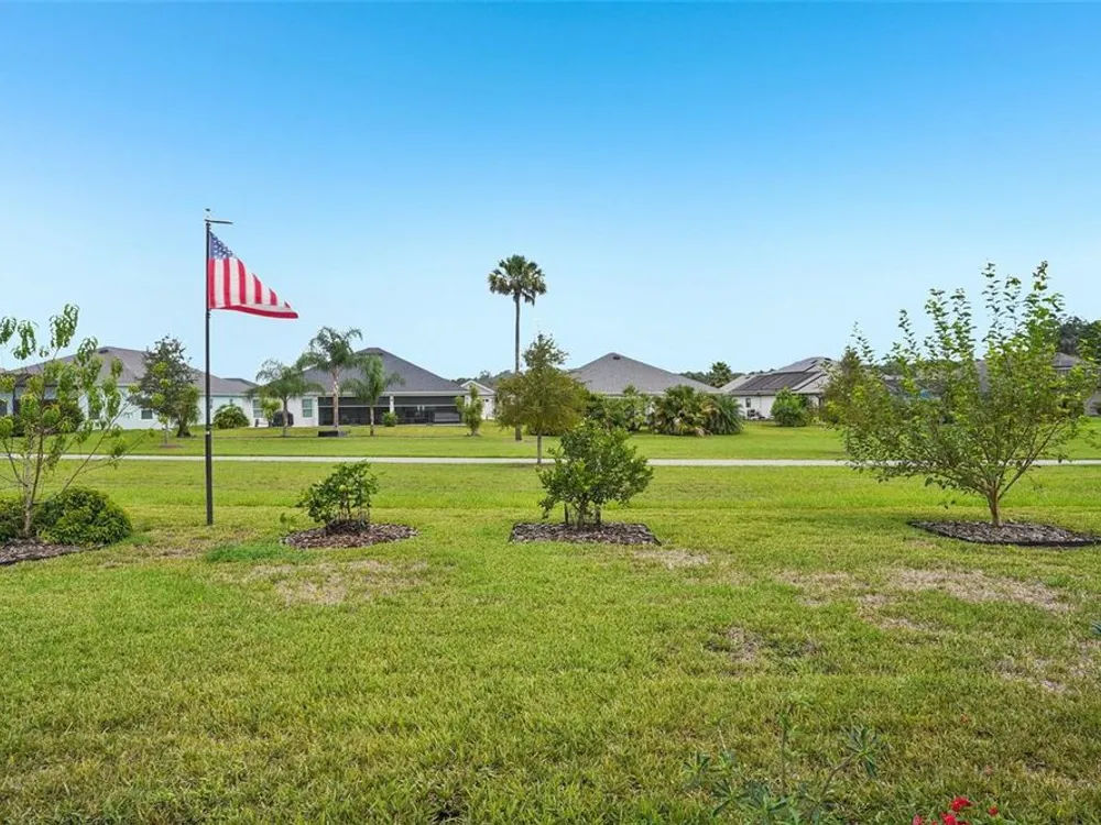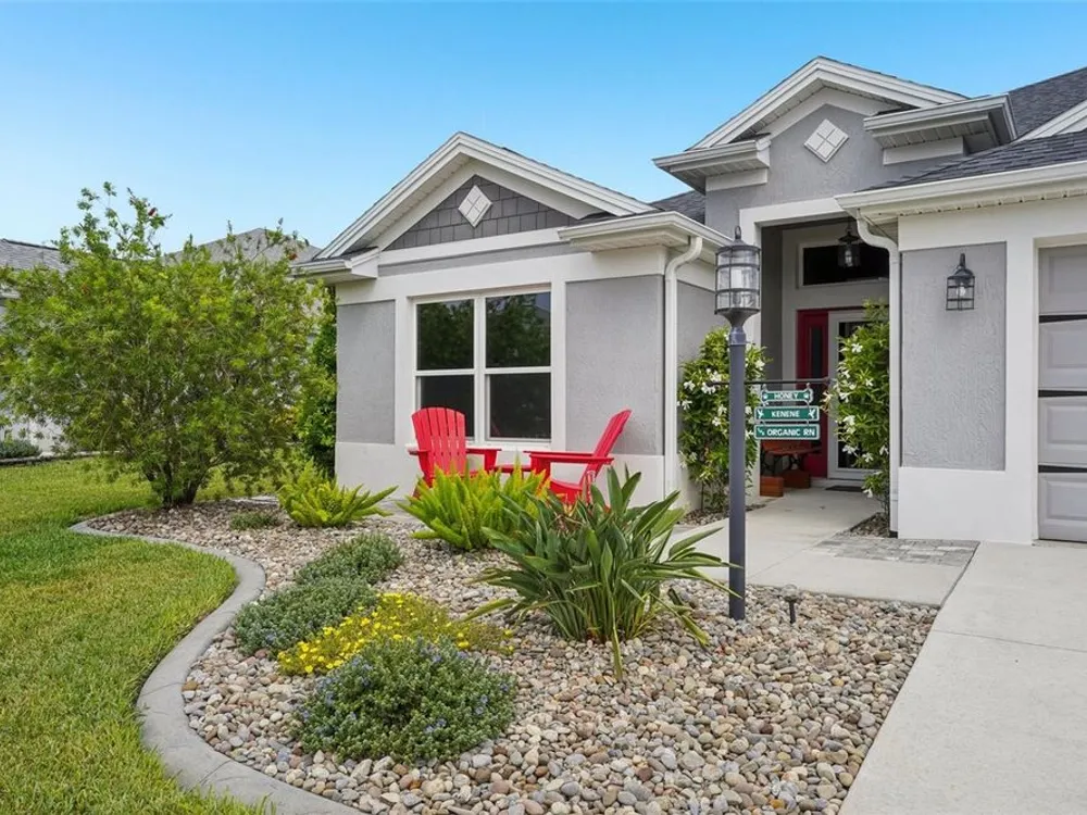 Located in Bradford Village of The Villages, this luxury designer Iris model offers three bedrooms and two baths with a thoughtful design that blends comfort and elegance. From the moment you step inside, you’re welcomed by a convenient coat closet and beautiful crown molding that carries throughout the home. Tile flooring graces the main living areas and baths in a warm, neutral wood-look finish, while the bedrooms feature carpeting for added comfort. The kitchen is a chef’s delight, featuring cabinetry with pull-out drawers, under-cabinet and indirect lighting, and a large island with sink. The open design flows seamlessly into the living area, where a Bose surround sound system enhances your entertainment experience. Each bedroom is equipped with a custom closet system—one room thoughtfully configured into a private office with desk and hutch. The third bedroom serves as a comfortable guest retreat. The primary suite is a true sanctuary with a tray ceiling and windows overlooking the serene green space. Its bath offers a tiled walk-in shower and a remarkable converted closet, designed as a luxury dressing room with vanity, shoe storage, cabinetry, and lined drawers for jewelry. This home is enriched with smart and practical upgrades including a lighted flagpole, gutters, invisible pet fence with dog door, Kinetico water softener, whole-house surge protector, lightning rods, and tinted windows throughout. Natural light pours in through three solar tubes, brightening the kitchen, guest bath, and primary closet. The garage is as functional as it is refined, featuring custom cabinetry, a utility sink, insulated doors, pull-down ladder access to an insulated attic with solar powered fan, and a gleaming epoxy-coated floor. Outdoors, the professionally landscaped lot showcases St. Augustine lawn with concrete edgeing and river rock, complemented by a variety of fruit trees—peach, ponderosa lemon, orange, mulberry, avocado, and fig—as well as vibrant flowering plants including gardenia, camellia, lantana, plumeria, hibiscus, bottle brush, and Bird of paradise. A mandevilla vine greets you at the entry with a cascade of blooms. The home backs to tranquil green space with a bike and walking path that leads to shaded trails and peaceful ponds, perfect for quiet strolls and relaxation. Its location is ideal—just steps from the Aviary Recreation Center with a family pool and minutes from the Ezell Recreation Center, offering a gym, sports pool, bocce, and pickleball. Nearby you’ll also find the Sawgrass Entertainment Market with its dining and live entertainment, plus convenient access to Brownwood Square and the up-and-coming Eastport Square, which will feature even more shopping, dining, and entertainment options.