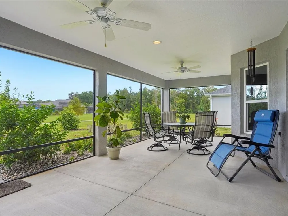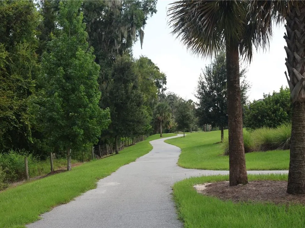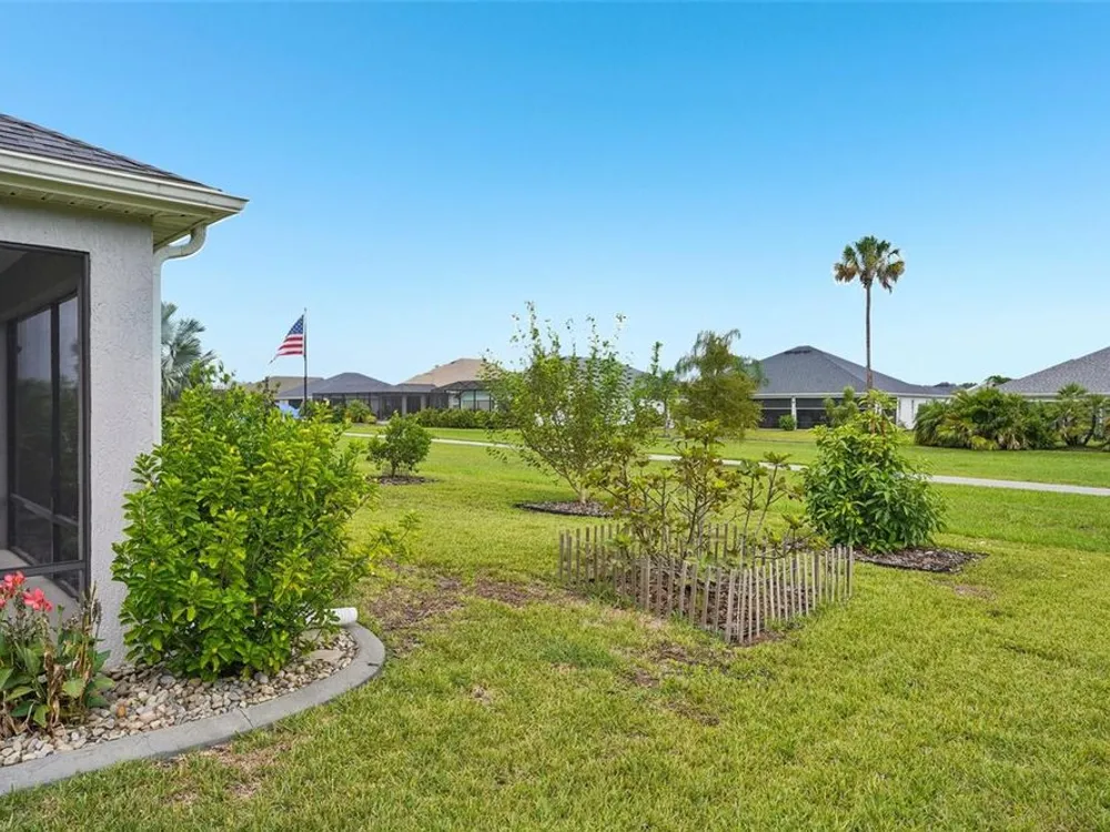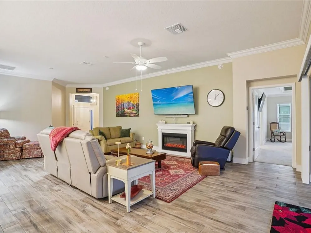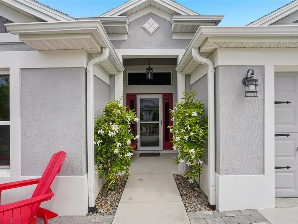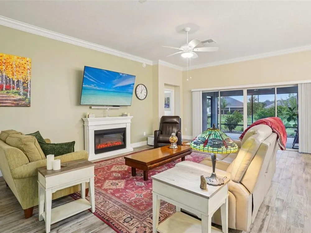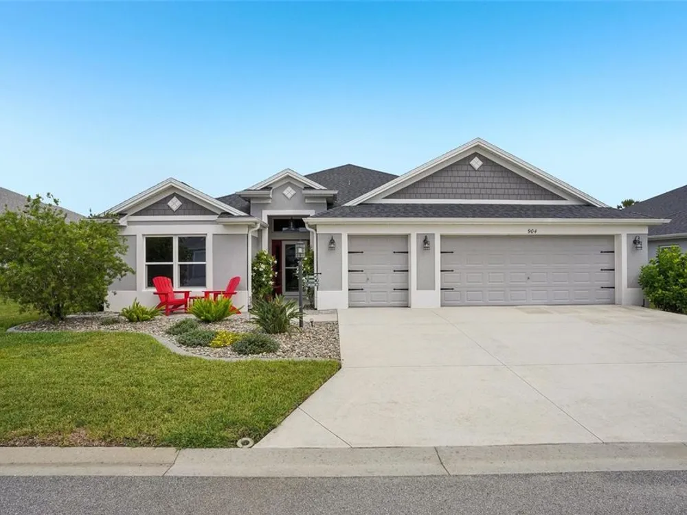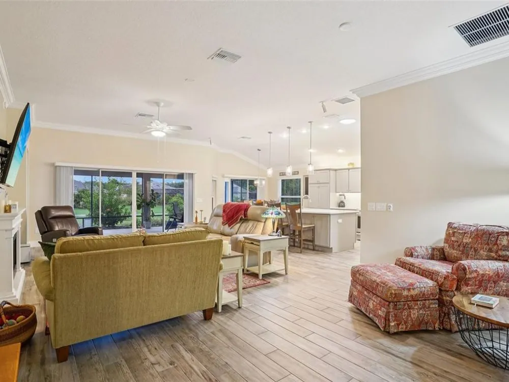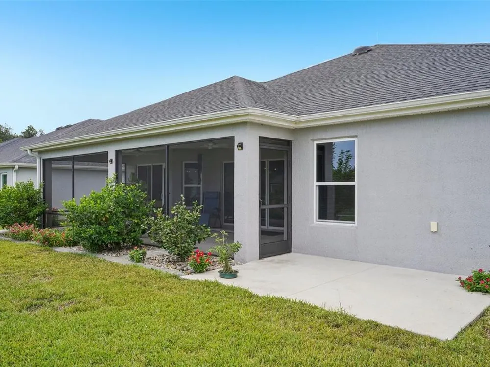 Located in Bradford Village of The Villages, this luxury designer Iris model offers three bedrooms and two baths with a thoughtful design that blends comfort and elegance. From the moment you step inside, you’re welcomed by a convenient coat closet and beautiful crown molding that carries throughout the home. Tile flooring graces the main living areas and baths in a warm, neutral wood-look finish, while the bedrooms feature carpeting for added comfort. The kitchen is a chef’s delight, featuring cabinetry with pull-out drawers, under-cabinet and indirect lighting, and a large island with sink. The open design flows seamlessly into the living area, where a Bose surround sound system enhances your entertainment experience. Each bedroom is equipped with a custom closet system—one room thoughtfully configured into a private office with desk and hutch. The third bedroom serves as a comfortable guest retreat. The primary suite is a true sanctuary with a tray ceiling and windows overlooking the serene green space. Its bath offers a tiled walk-in shower and a remarkable converted closet, designed as a luxury dressing room with vanity, shoe storage, cabinetry, and lined drawers for jewelry. This home is enriched with smart and practical upgrades including a lighted flagpole, gutters, invisible pet fence with dog door, Kinetico water softener, whole-house surge protector, lightning rods, and tinted windows throughout. Natural light pours in through three solar tubes, brightening the kitchen, guest bath, and primary closet. The garage is as functional as it is refined, featuring custom cabinetry, a utility sink, insulated doors, pull-down ladder access to an insulated attic with solar powered fan, and a gleaming epoxy-coated floor. Outdoors, the professionally landscaped lot showcases St. Augustine lawn with concrete edgeing and river rock, complemented by a variety of fruit trees—peach, ponderosa lemon, orange, mulberry, avocado, and fig—as well as vibrant flowering plants including gardenia, camellia, lantana, plumeria, hibiscus, bottle brush, and Bird of paradise. A mandevilla vine greets you at the entry with a cascade of blooms. The home backs to tranquil green space with a bike and walking path that leads to shaded trails and peaceful ponds, perfect for quiet strolls and relaxation. Its location is ideal—just steps from the Aviary Recreation Center with a family pool and minutes from the Ezell Recreation Center, offering a gym, sports pool, bocce, and pickleball. Nearby you’ll also find the Sawgrass Entertainment Market with its dining and live entertainment, plus convenient access to Brownwood Square and the up-and-coming Eastport Square, which will feature even more shopping, dining, and entertainment options.