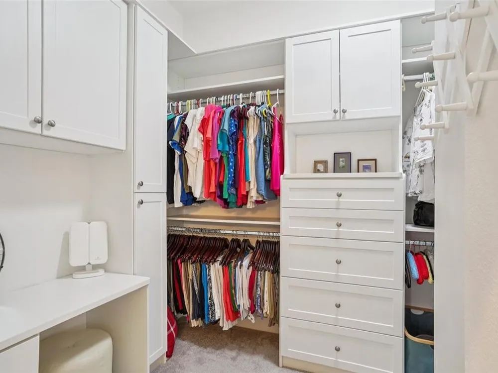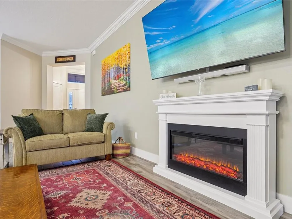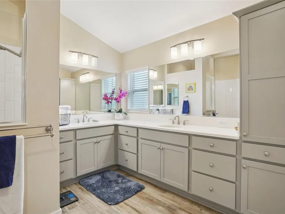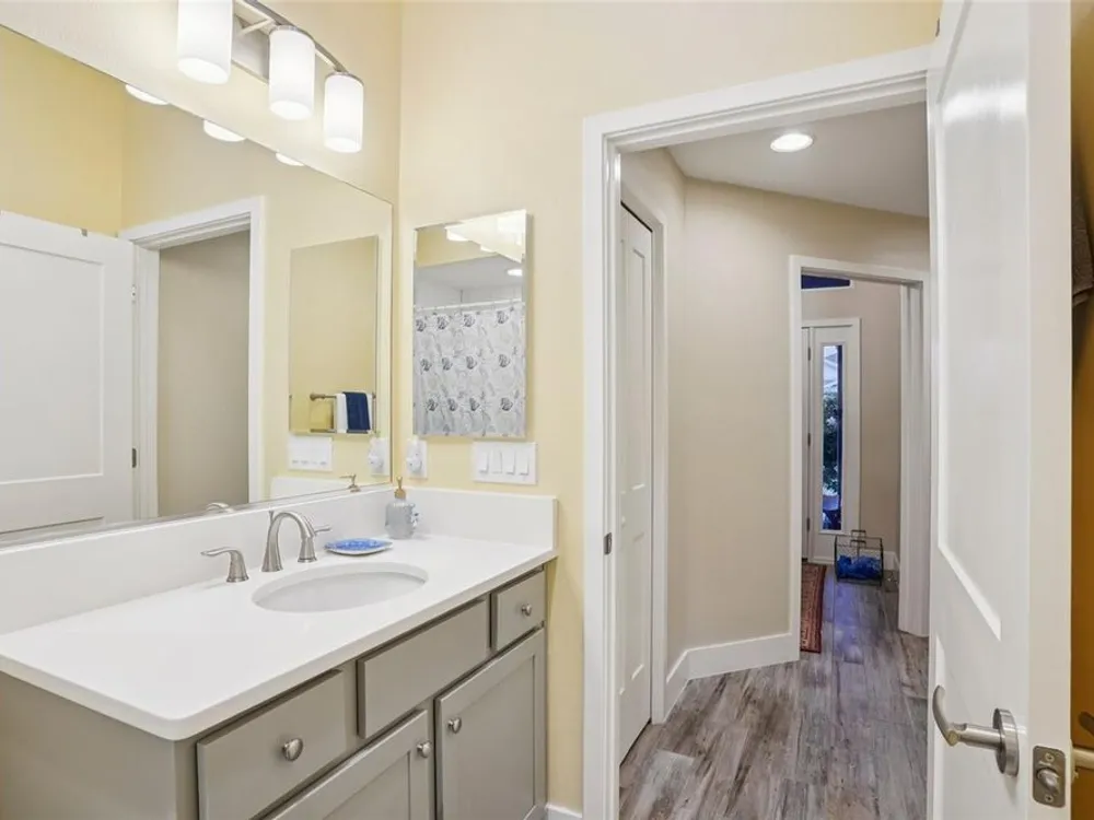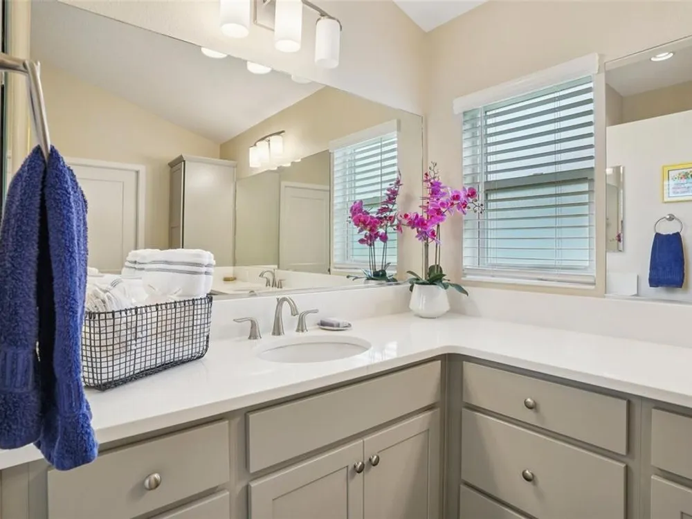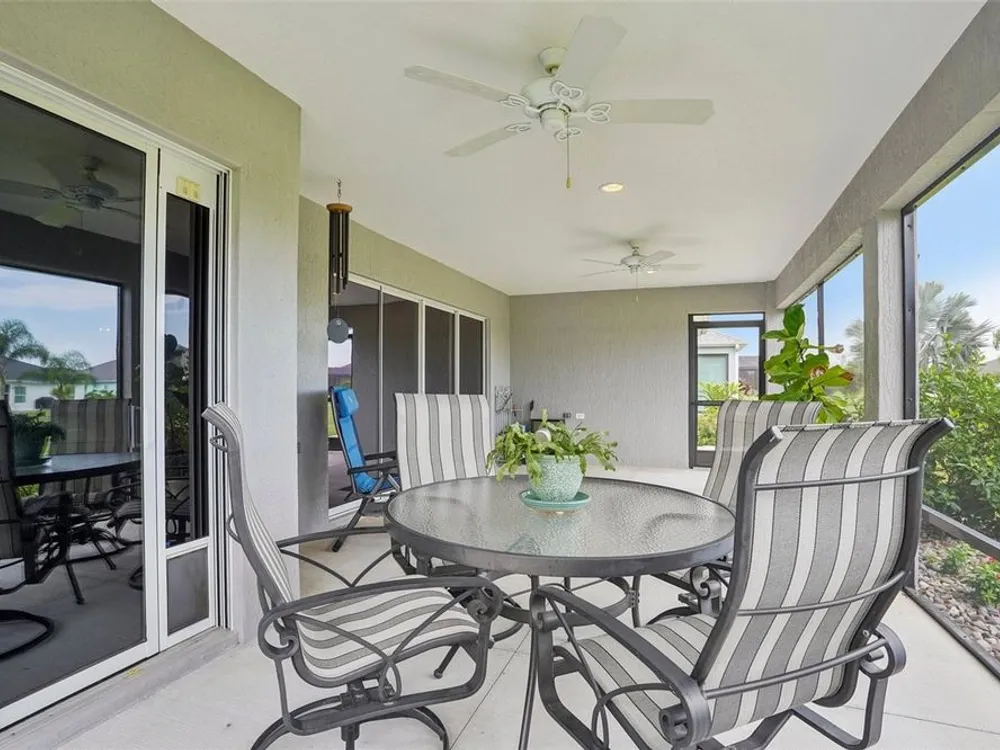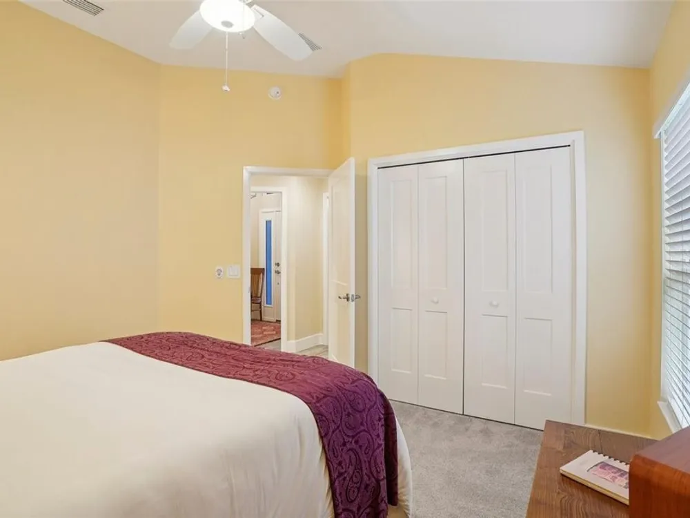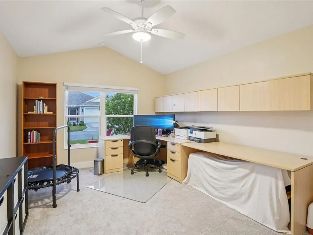 Located in Bradford Village of The Villages, this luxury designer Iris model offers three bedrooms and two baths with a thoughtful design that blends comfort and elegance. From the moment you step inside, you’re welcomed by a convenient coat closet and beautiful crown molding that carries throughout the home. Tile flooring graces the main living areas and baths in a warm, neutral wood-look finish, while the bedrooms feature carpeting for added comfort. The kitchen is a chef’s delight, featuring cabinetry with pull-out drawers, under-cabinet and indirect lighting, and a large island with sink. The open design flows seamlessly into the living area, where a Bose surround sound system enhances your entertainment experience. Each bedroom is equipped with a custom closet system—one room thoughtfully configured into a private office with desk and hutch. The third bedroom serves as a comfortable guest retreat. The primary suite is a true sanctuary with a tray ceiling and windows overlooking the serene green space. Its bath offers a tiled walk-in shower and a remarkable converted closet, designed as a luxury dressing room with vanity, shoe storage, cabinetry, and lined drawers for jewelry. This home is enriched with smart and practical upgrades including a lighted flagpole, gutters, invisible pet fence with dog door, Kinetico water softener, whole-house surge protector, lightning rods, and tinted windows throughout. Natural light pours in through three solar tubes, brightening the kitchen, guest bath, and primary closet. The garage is as functional as it is refined, featuring custom cabinetry, a utility sink, insulated doors, pull-down ladder access to an insulated attic with solar powered fan, and a gleaming epoxy-coated floor. Outdoors, the professionally landscaped lot showcases St. Augustine lawn with concrete edgeing and river rock, complemented by a variety of fruit trees—peach, ponderosa lemon, orange, mulberry, avocado, and fig—as well as vibrant flowering plants including gardenia, camellia, lantana, plumeria, hibiscus, bottle brush, and Bird of paradise. A mandevilla vine greets you at the entry with a cascade of blooms. The home backs to tranquil green space with a bike and walking path that leads to shaded trails and peaceful ponds, perfect for quiet strolls and relaxation. Its location is ideal—just steps from the Aviary Recreation Center with a family pool and minutes from the Ezell Recreation Center, offering a gym, sports pool, bocce, and pickleball. Nearby you’ll also find the Sawgrass Entertainment Market with its dining and live entertainment, plus convenient access to Brownwood Square and the up-and-coming Eastport Square, which will feature even more shopping, dining, and entertainment options.