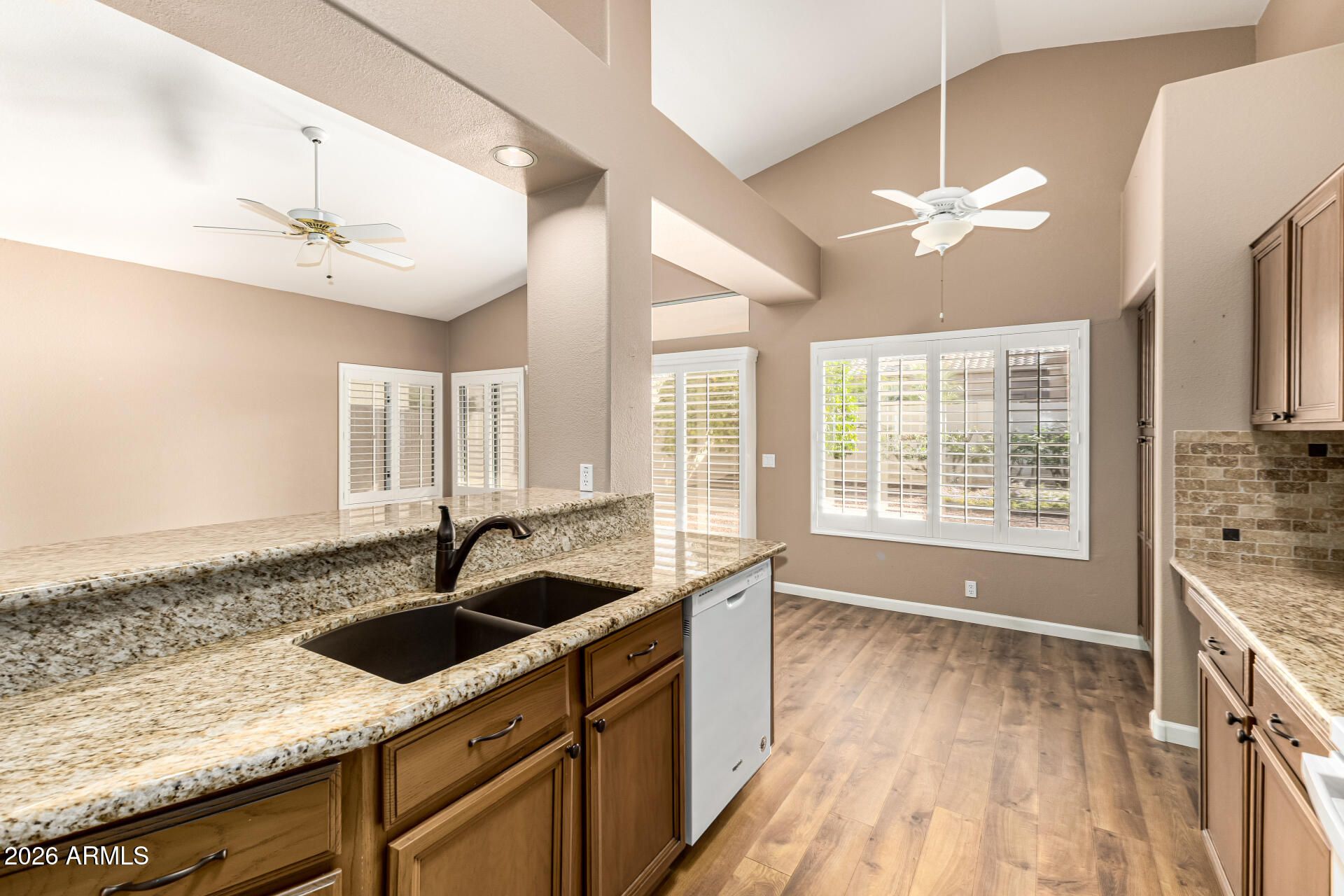 Welcome to this beautifully upgraded and meticulously maintained home in the highly desirable Westbrook Village, offering the perfect setting for relaxed retirement living. Features include laminate wood flooring, plantation shutters, vaulted ceilings, granite countertops, and a decorative stone backsplash. The open-concept floor plan is ideal for entertaining, while the spacious primary suite offers direct access to the covered patio and a luxurious ensuite bath with dual sinks, a custom-tiled walk-in shower with seamless glass surround, and a large walk-in closet. Expansive covered patio with drop-down shade screens. Westbrook Village amenities include two golf courses, pickleball and tennis courts, a community pool and spa, and two on-site restaurants for a true resort-style lifestyle.