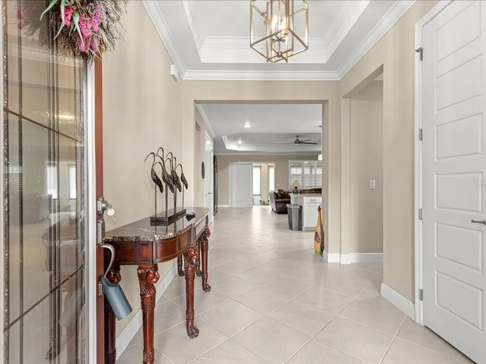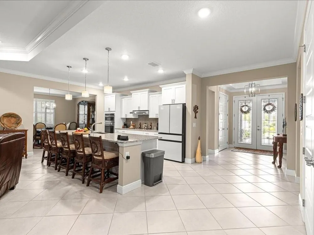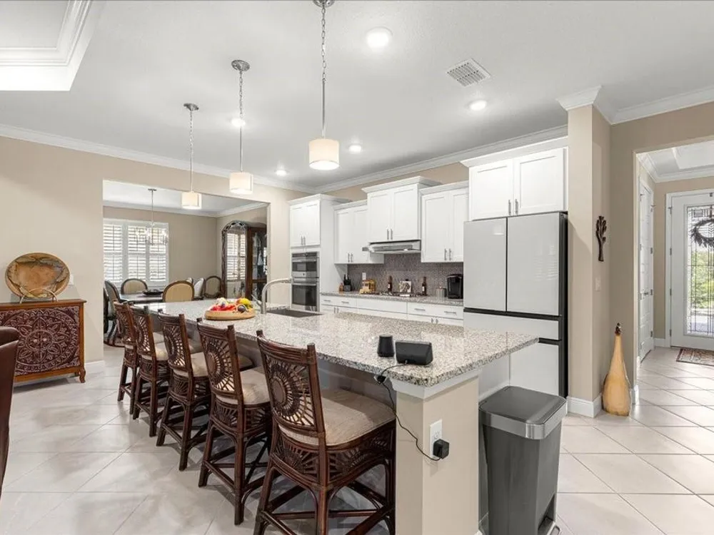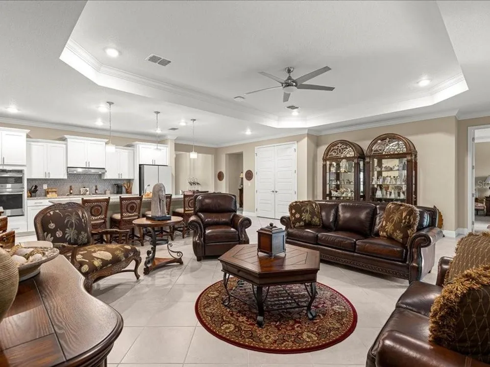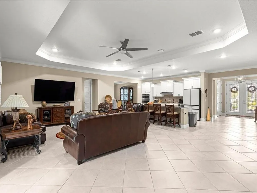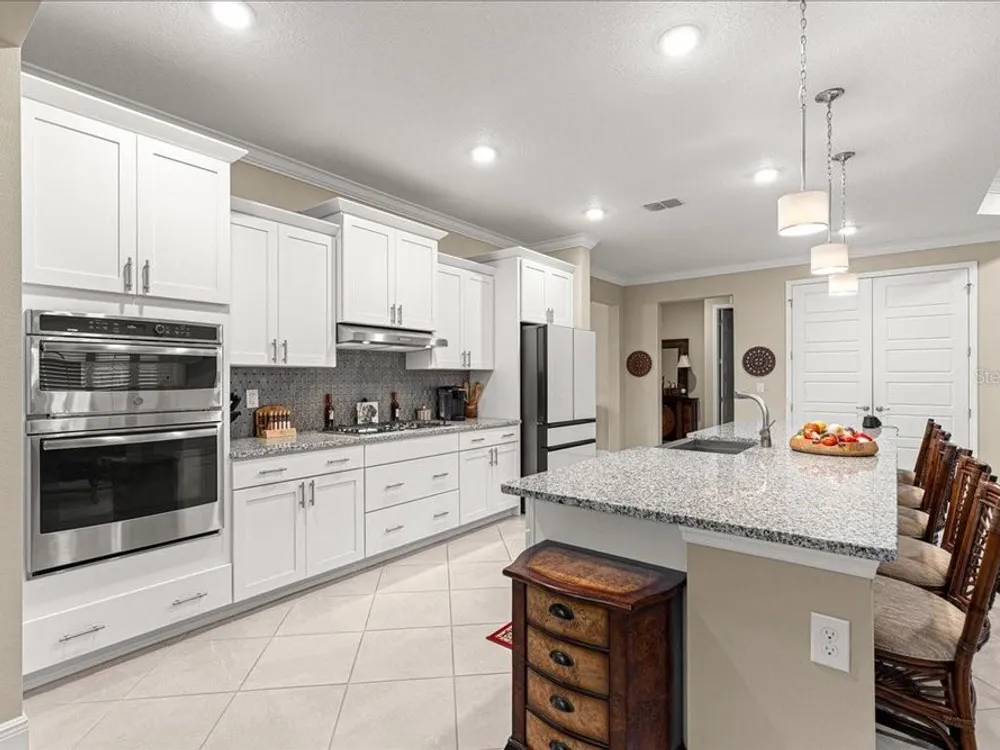 Welcome to this stunning Wellington model home located in the 55+ community of Candler Hills in On Top of the World. This 2018 home is in the Sanctuary section and better than new! Are you looking for a home that is move in ready with ALL of the bells and whistles? Well this one will check all those boxes and more! When you pull up you will immediately notice the paver drive, and beautiful landscaping with stacked stone beds. Walk to the front paver porch with an extension to the oversized double door entrance. Inside is diagonal tile flooring throughout the main living areas, bathrooms, laundry and halls. Crown molding throughout the entire home! It also features a gourmet kitchen with wall oven and microwave, gas top range, staggered white cabinetry with pull outs and a farm sink. New dishwasher so quiet you will not know it's running. Pretty pendant lighting over the huge island/bar area. Recessed lighting and upgraded fans throughout the home. Granite counters in the kitchen and laundry area. Kitchen is wide open to your spacious living room. Tray ceilings at the entrance, living room and master. Which has sliders to your Florida room. Featuring tile flooring, ceiling fans, solar blinds, custom entertainment center and split HVAC unit. This room has views to your paver patio, perfect for grilling and relaxing. And PVC fencing for privacy and the furbabies. There is a formal dining room, making this the perfect home for entertaining family and friends. The den/flex space features laminate flooring. Interior paint with custom colors. The bedrooms have upgraded, custom carpeting. The large primary has a tray ceiling, primary bath with double sink, quartz vanity, a walk-in shower with glass surround and a bench. The walk-in closet is to-die-for and leads directly to the laundry room. The laundry room has plenty of cabinet and storage space, a laundry sink and newer washer and dryer. The second primary has a built in entertainment center, it's own personal bathroom with walk in shower and quartz counter vanity. The third bedroom is also nicely appointed with an accent wall and carpet flooring. The third bathroom has a tub/shower combo and quartz top vanity. The 4 foot extended 2 car garage plus a golf cart garage has epoxied floors, two garage door openers, 20 amp golf cart charger outlet, central vacuum for cars and golf cart, ceiling storage racks & wall shelving. There is so much more! Please be sure to look at the photos for a more complete list of features and upgrades. Don't miss your opportunity to purchase this home! Call for your appointment today!