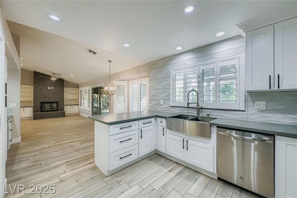 **MOTIVATED SELLER!** BEAUTIFULLY REMODELED SILVERTON MODEL IN 55+ SUN CITY SUMMERLIN SITS ON CUL DE SAC & OFFERS OVER ¼ ACRE LOT TO ENJOY! The open floor plan showcases a stunning kitchen with Quartzite counters, stainless farm sink, custom backsplash, soft-close Shaker cabinets & sunny dining nook. Relax in the spacious family room with a raised hearth tile accent gas fireplace & built-in bookcase. Updated flooring, stylish bathrooms, plantation shutters & a large laundry room add to the appeal. A 200 sq ft sunroom expands your living space. Outdoors, enjoy a peaceful front courtyard, a rear courtyard —perfect for entertaining or unwinding. Additional features include new Lennox HVAC units (2016), a 2-car garage plus golf cart space & room to expand with HOA approval. Enjoy resort-style living with 4 community centers, 3 golf courses, 5 pools, fitness centers, tennis, pickleball, softball, theatre & more! *VA Assumable Loan @ 2.75%*