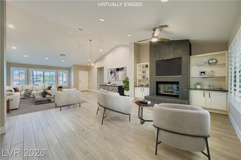 **MOTIVATED SELLER!** BEAUTIFULLY REMODELED SILVERTON MODEL IN 55+ SUN CITY SUMMERLIN SITS ON CUL DE SAC & OFFERS OVER ¼ ACRE LOT TO ENJOY! The open floor plan showcases a stunning kitchen with Quartzite counters, stainless farm sink, custom backsplash, soft-close Shaker cabinets & sunny dining nook. Relax in the spacious family room with a raised hearth tile accent gas fireplace & built-in bookcase. Updated flooring, stylish bathrooms, plantation shutters & a large laundry room add to the appeal. A 200 sq ft sunroom expands your living space. Outdoors, enjoy a peaceful front courtyard, a rear courtyard —perfect for entertaining or unwinding. Additional features include new Lennox HVAC units (2016), a 2-car garage plus golf cart space & room to expand with HOA approval. Enjoy resort-style living with 4 community centers, 3 golf courses, 5 pools, fitness centers, tennis, pickleball, softball, theatre & more! *VA Assumable Loan @ 2.75%- Can Be Assumed by Non-VA Buyer As Well*