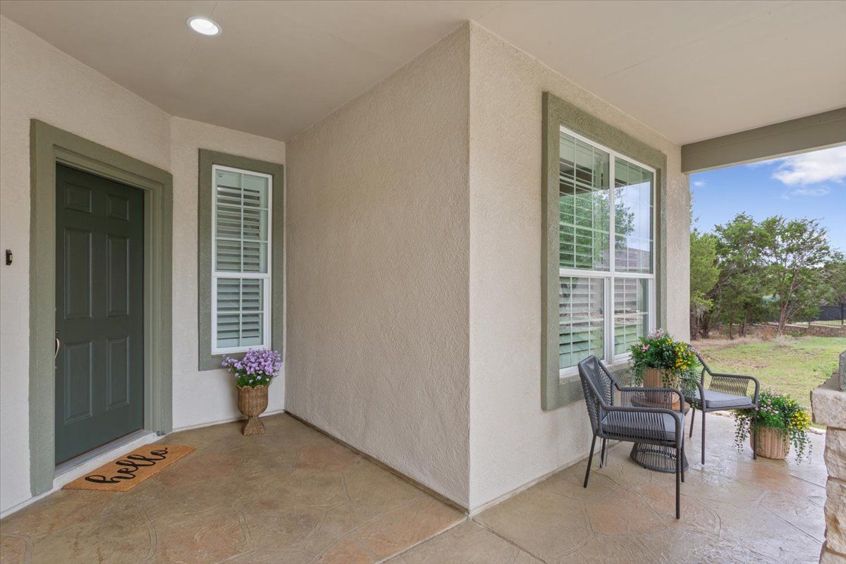 Perfectly positioned on a quiet cul-de-sac with greenbelt views on two sides, this thoughtfully designed Surrey Crest home offers a relaxed and refined take on Sun City living. Featuring 2 bedrooms, 2 baths, and a versatile flex space, the open layout is designed for both comfort and effortless living. Wood flooring flows throughout the main areas with no carpet, complemented by 5-inch baseboards, crown molding, and plantation shutters that add timeless elegance. The kitchen blends style and function with granite countertops and convenient pull-out shelving. The primary suite provides a spa-like feel with a tiled walk-in shower and rain head. Thoughtful details continue with a laundry room sink and cabinetry, as well as abundant storage including garage cabinets and an epoxy-coated garage floor. Outdoor living is a standout, featuring a large flagstone patio with pergola and integrated lighting—perfect for relaxing evenings or entertaining—while peaceful greenbelt views behind and greenspace to one side enhance privacy and tranquility. Additional highlights include a freshly painted interior, roof replaced in 2020, HVAC in 2019, and smart thermostat, whole-house surge protector, insulated garage door, and SimpliSafe security system. Washer, dryer, and refrigerator all convey. A truly exceptional home offering comfort, quality, and an elevated Sun City lifestyle.