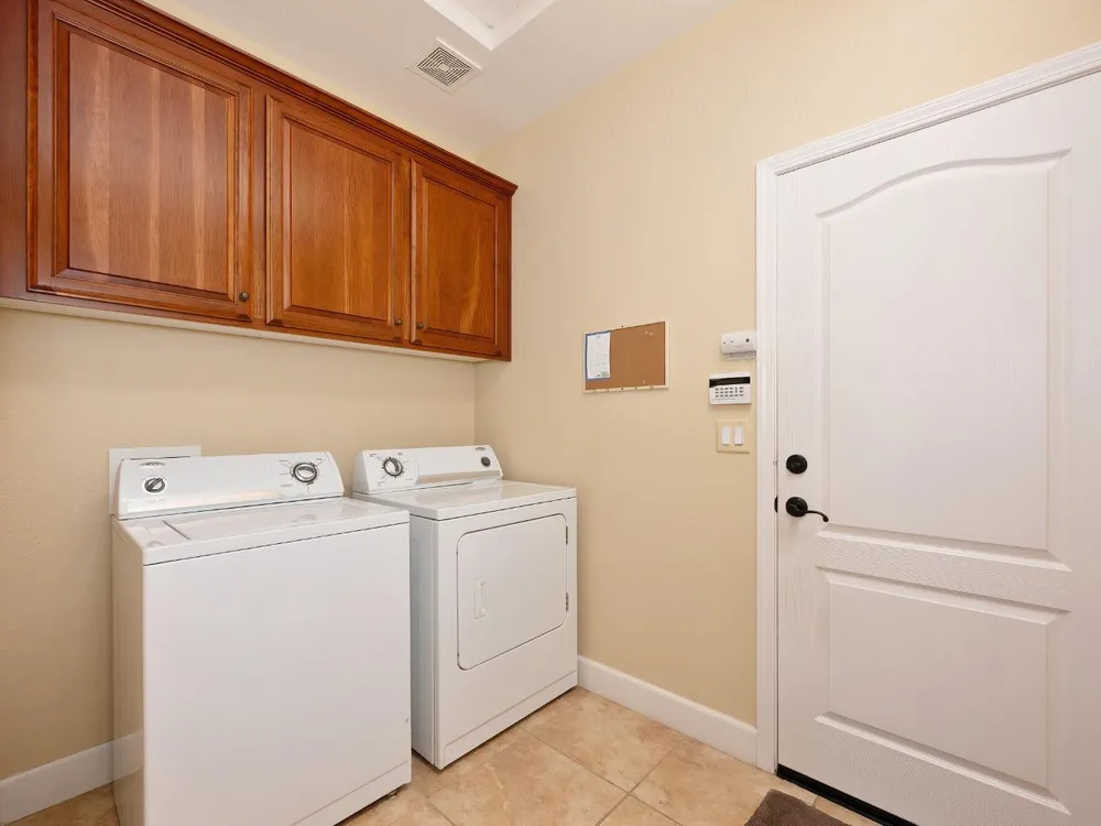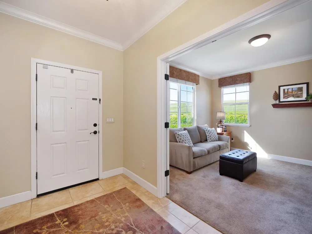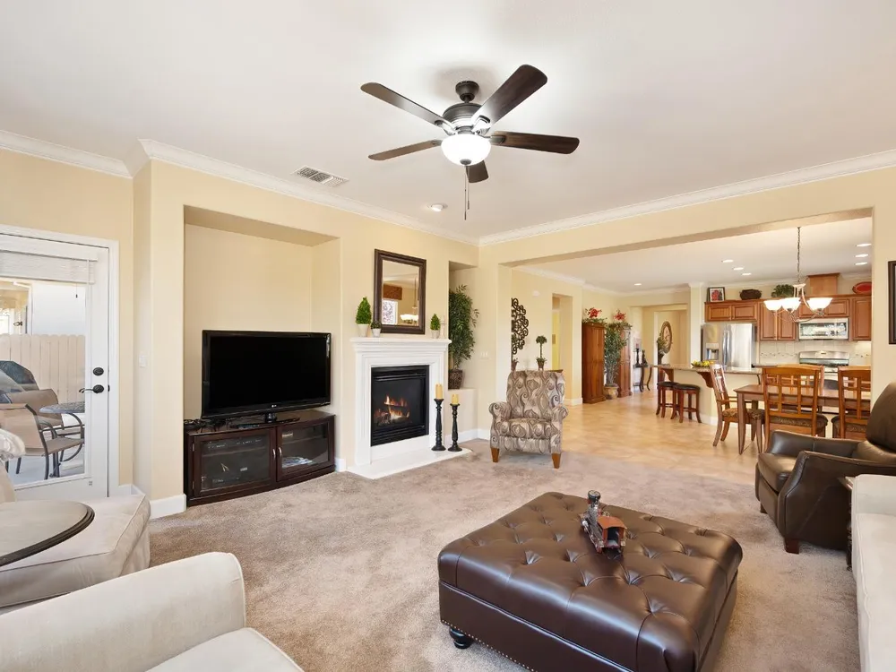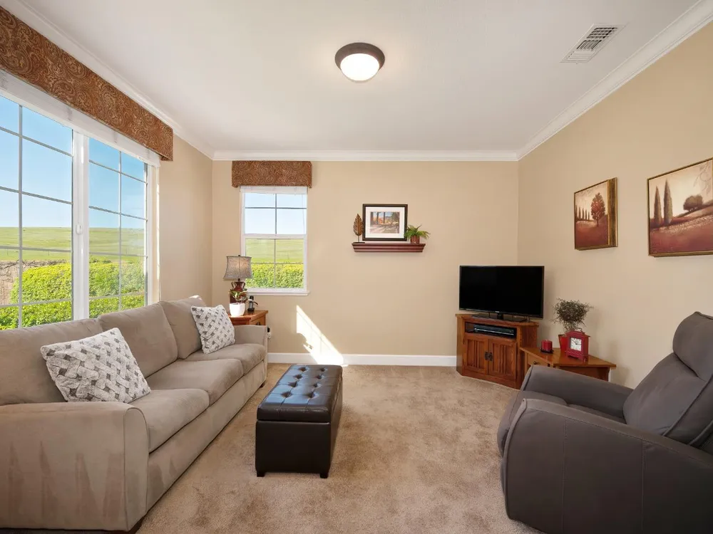 Price Improvement! Welcome to the Four Season's community.Original owners, having been used as their second home. Open concept living with large kitchen, large island and ample space in great room and primary bedroom with large walk in closet. This home has an OWNED photovoltaic solar system, custom garage cabinets with workbench, slab granite in kitchen & bathroom counters, granite in primary shower. Upgraded cabinets throughout, large format tile floors, newly painted exterior of home; new fans, toilets, microwave installed in 2025. Super clean, lightly used home. Crowns. Newer hot water heater. Lovely views! Covered back patio with ample space. Included washer/dryer/newer refrigerator. Second bedroom currently used as a den. No mello roos taxes! Lower energy bills courtesy of solar system. Four Seasons maintains front yard. Non smoking and non pet home. End of road privacy. Clear pest report.