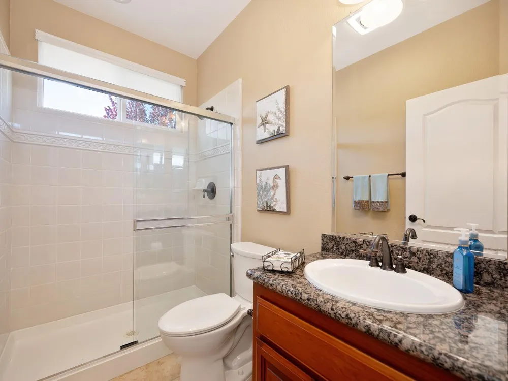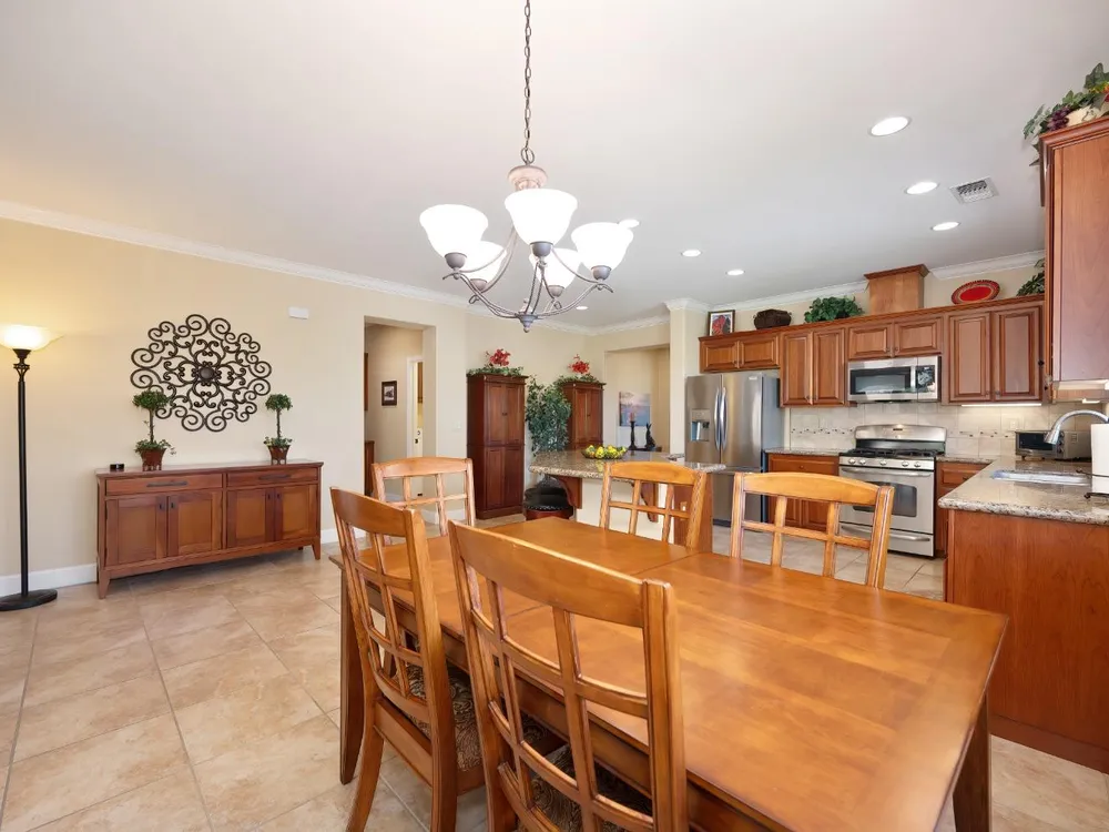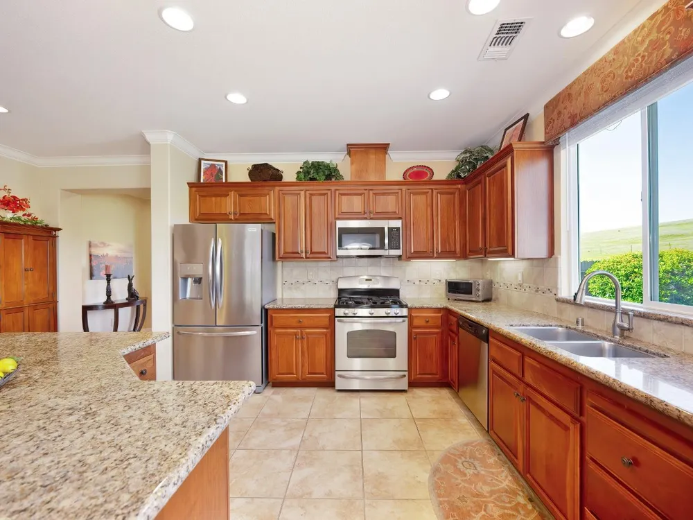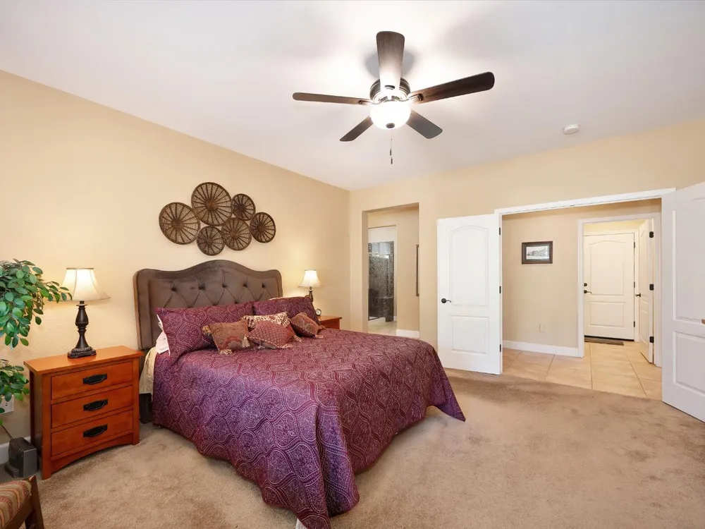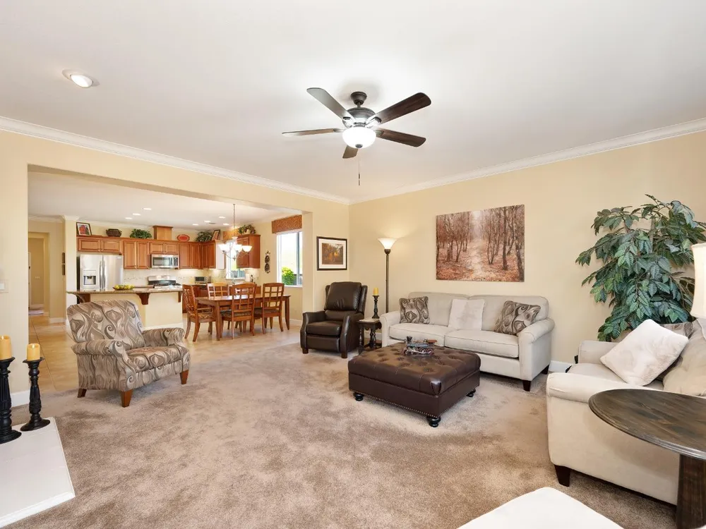 Price Improvement! Welcome to the Four Season's community.Original owners, having been used as their second home. Open concept living with large kitchen, large island and ample space in great room and primary bedroom with large walk in closet. This home has an OWNED photovoltaic solar system, custom garage cabinets with workbench, slab granite in kitchen & bathroom counters, granite in primary shower. Upgraded cabinets throughout, large format tile floors, newly painted exterior of home; new fans, toilets, microwave installed in 2025. Super clean, lightly used home. Crowns. Newer hot water heater. Lovely views! Covered back patio with ample space. Included washer/dryer/newer refrigerator. Second bedroom currently used as a den. No mello roos taxes! Lower energy bills courtesy of solar system. Four Seasons maintains front yard. Non smoking and non pet home. End of road privacy. Clear pest report.