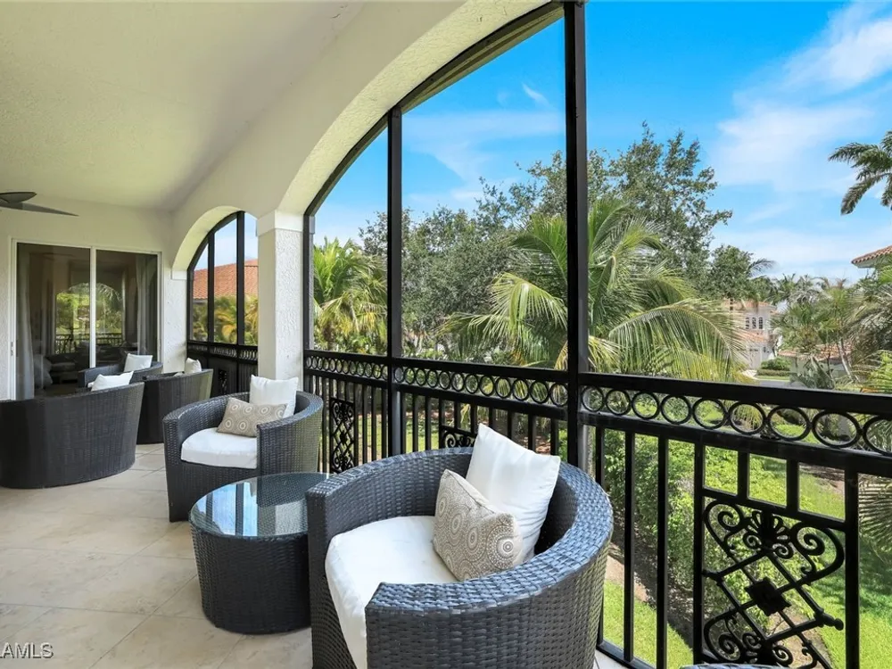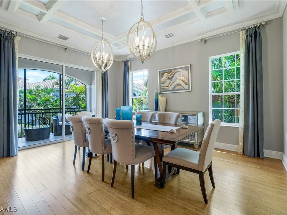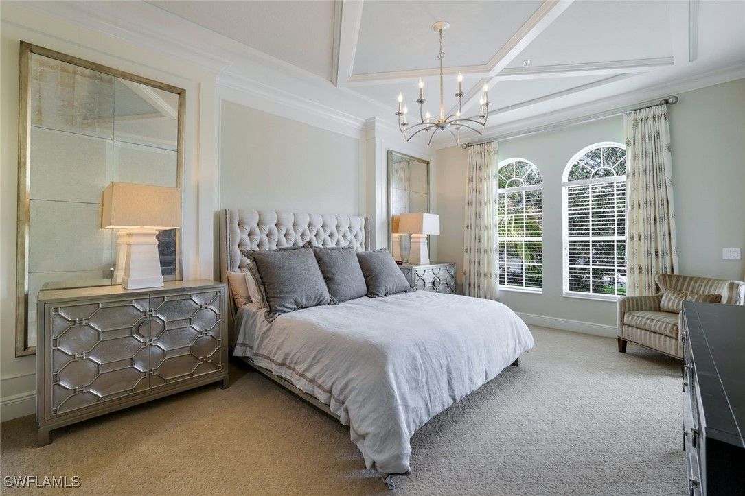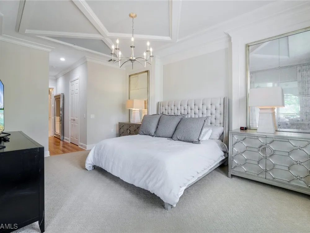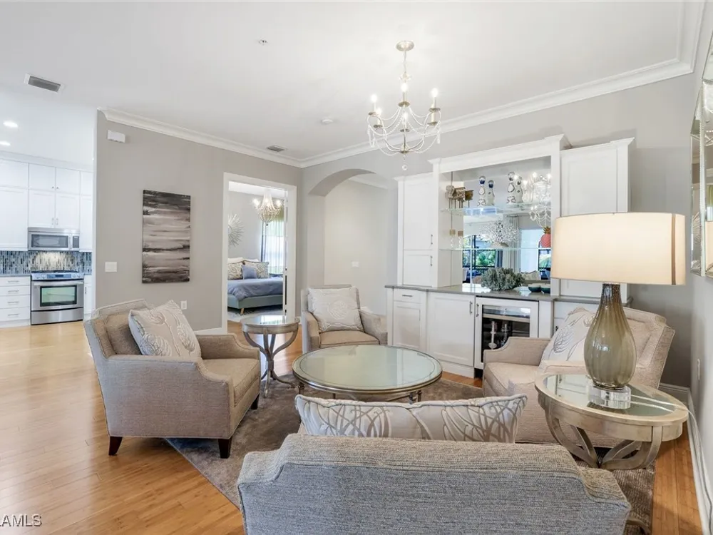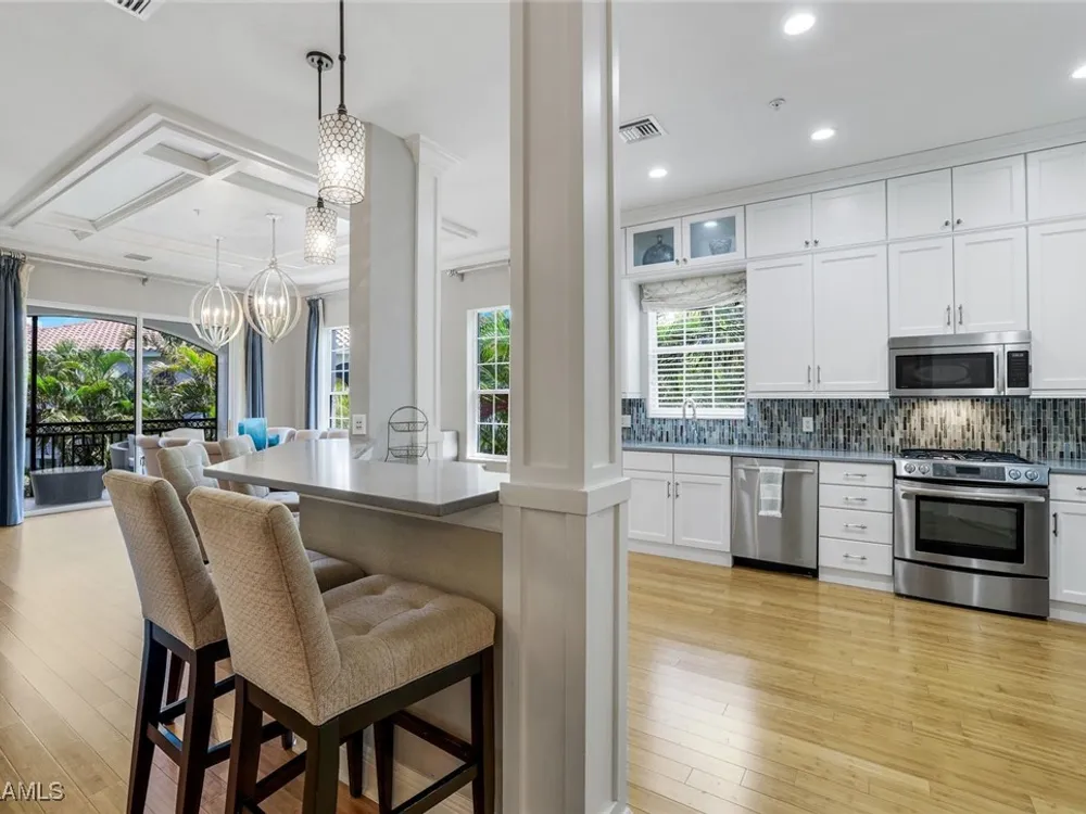 One of the finest second floor end-unit coach homes in Cascada at Fiddler's Creek, offered turnkey with 3 bedrooms, den and 3 full bathrooms. This stunning residence boasts 12-foot custom coffered ceilings, crown molding, hardwood flooring, upgraded carpet in bedrooms & tile flooring throughout. The gourmet kitchen features floor-to-ceiling custom cabinetry, quartz countertops, glass backsplash, Jenn-Air stainless steel appliances with natural gas oven, quartz island for extra seating, and custom bar with built-in wine cooler. The spacious master suite includes coffered ceilings, crown molding, chandelier, and a luxurious ensuite bathroom with dual vanities, upgraded tile flooring, large glass shower, and a soaking tub. Guest bedrooms offer ensuite bathrooms, custom wainscoting, large closets, bunk beds for young guests, and custom draperies. Landscape views from the expansive 12x24 screened lanai that is perfect for entertaining. This elevator-ready home is nestled within the gated Cascada community, offering added privacy. Fiddler's Creek's Club & Spa elevates your lifestyle with a resort-style pool featuring waterfalls, slides, spa, lap lanes, and poolside service, a recently upgraded fitness center, spa, Har-Tru tennis courts, pickleball courts, and dining at Caxambas or the casual Gator Grille. Optional memberships provide access to The Creek Course for golf, The Tarpon Club for Marco Island beach access, and The Tarpon Club Marina for yacht and boat storage. Perfectly located just 7 miles from Marco Island, 10 miles from Naples' 5th Avenue South, and 11 miles from I-75, this home offers unparalleled convenience. Don’t miss this exceptional opportunity to own a luxurious retreat in Fiddler's Creek!