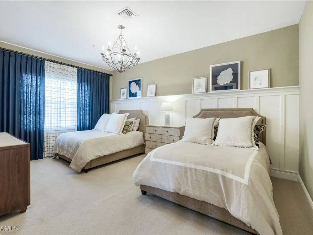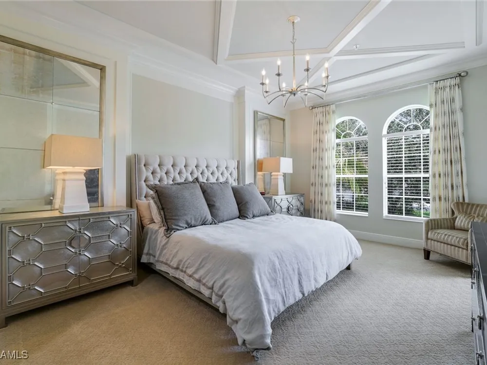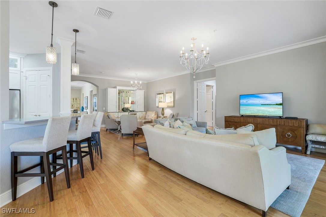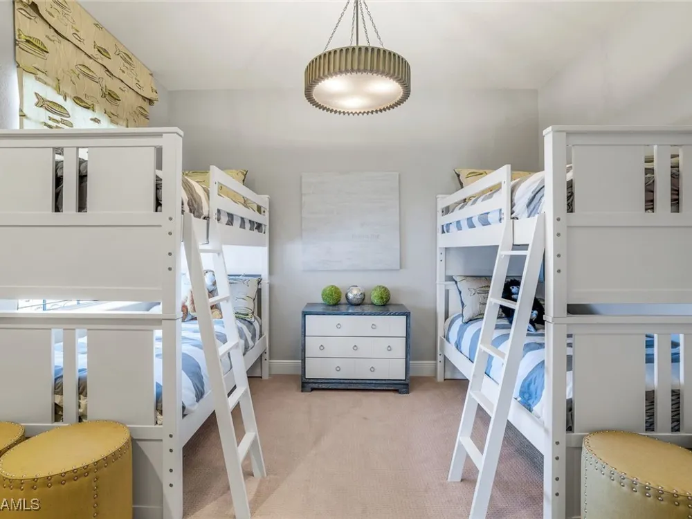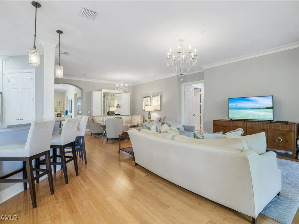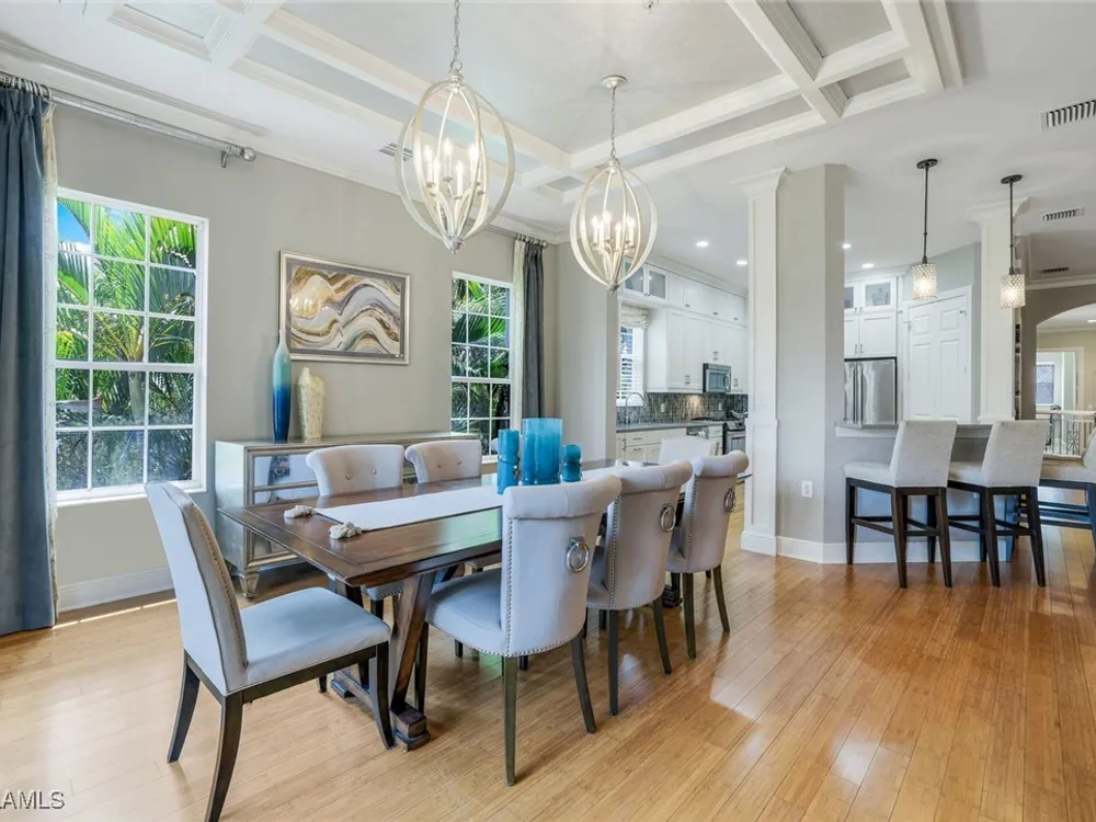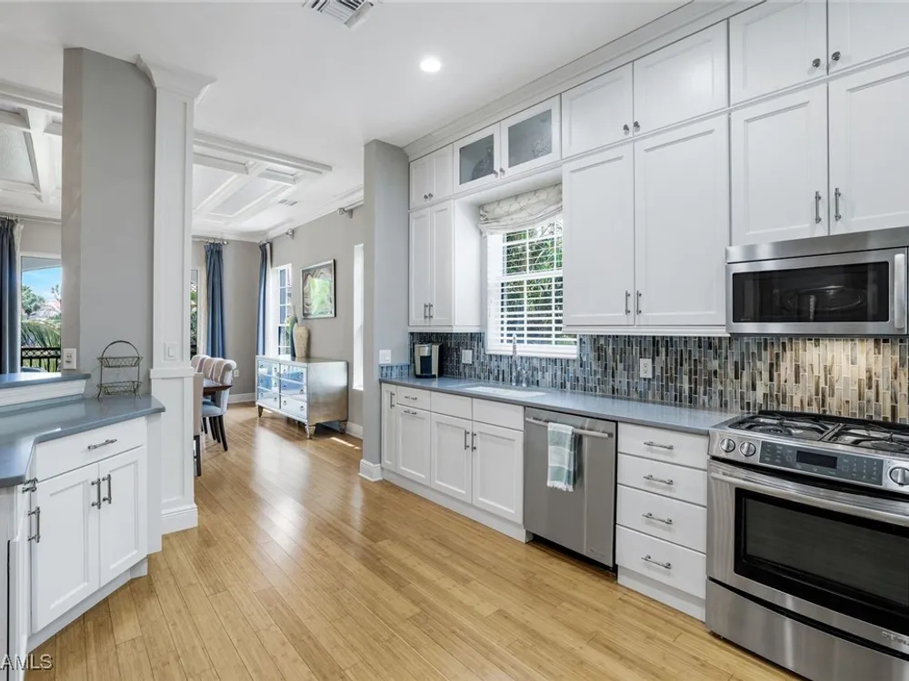 One of the finest second floor end-unit coach homes in Cascada at Fiddler's Creek, offered turnkey with 3 bedrooms, den and 3 full bathrooms. This stunning residence boasts 12-foot custom coffered ceilings, crown molding, hardwood flooring, upgraded carpet in bedrooms & tile flooring throughout. The gourmet kitchen features floor-to-ceiling custom cabinetry, quartz countertops, glass backsplash, Jenn-Air stainless steel appliances with natural gas oven, quartz island for extra seating, and custom bar with built-in wine cooler. The spacious master suite includes coffered ceilings, crown molding, chandelier, and a luxurious ensuite bathroom with dual vanities, upgraded tile flooring, large glass shower, and a soaking tub. Guest bedrooms offer ensuite bathrooms, custom wainscoting, large closets, bunk beds for young guests, and custom draperies. Landscape views from the expansive 12x24 screened lanai that is perfect for entertaining. This elevator-ready home is nestled within the gated Cascada community, offering added privacy. Fiddler's Creek's Club & Spa elevates your lifestyle with a resort-style pool featuring waterfalls, slides, spa, lap lanes, and poolside service, a recently upgraded fitness center, spa, Har-Tru tennis courts, pickleball courts, and dining at Caxambas or the casual Gator Grille. Optional memberships provide access to The Creek Course for golf, The Tarpon Club for Marco Island beach access, and The Tarpon Club Marina for yacht and boat storage. Perfectly located just 7 miles from Marco Island, 10 miles from Naples' 5th Avenue South, and 11 miles from I-75, this home offers unparalleled convenience. Don’t miss this exceptional opportunity to own a luxurious retreat in Fiddler's Creek!