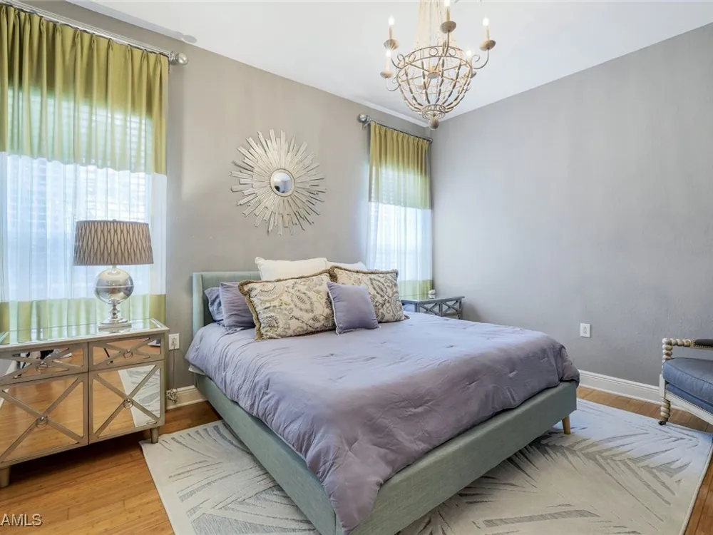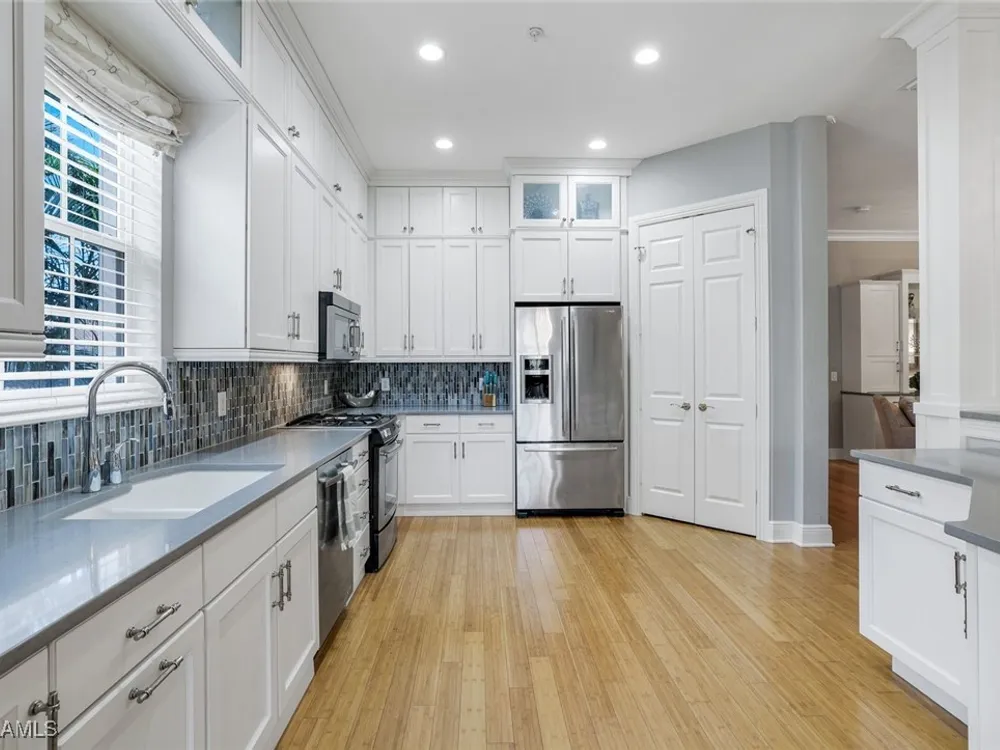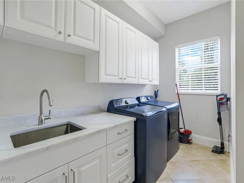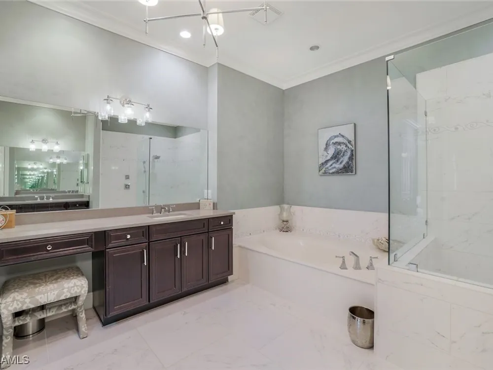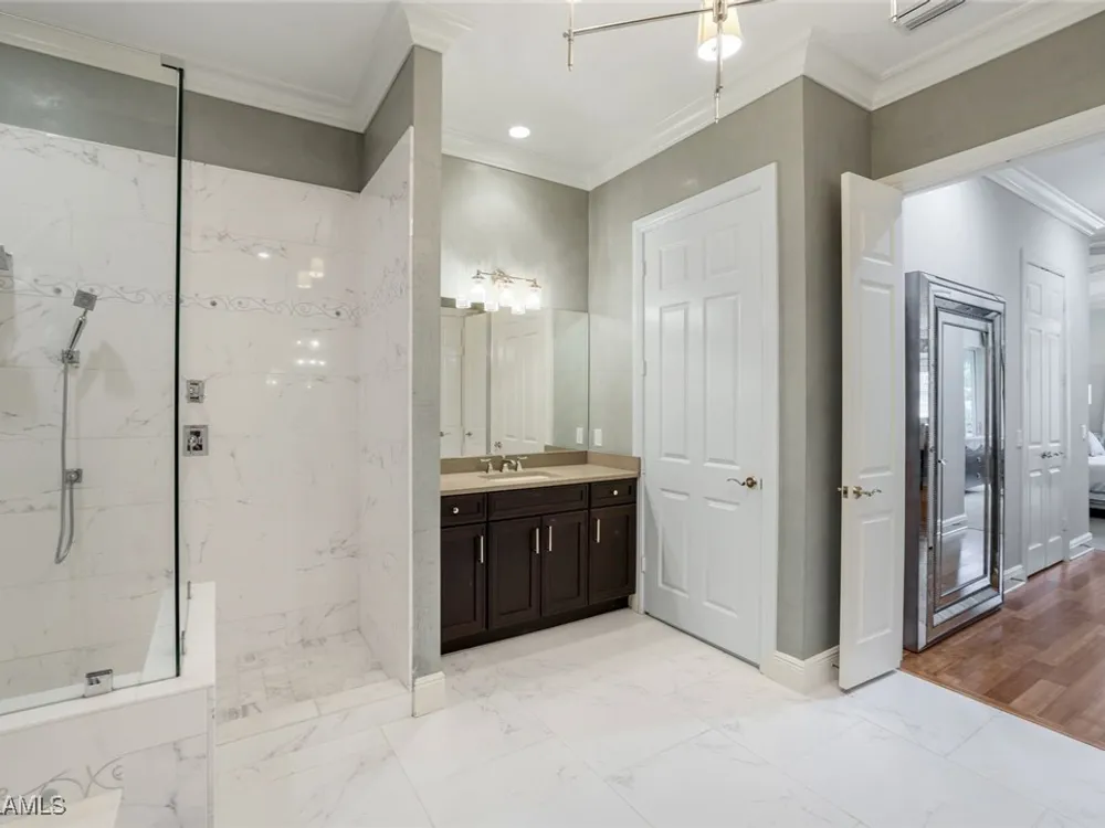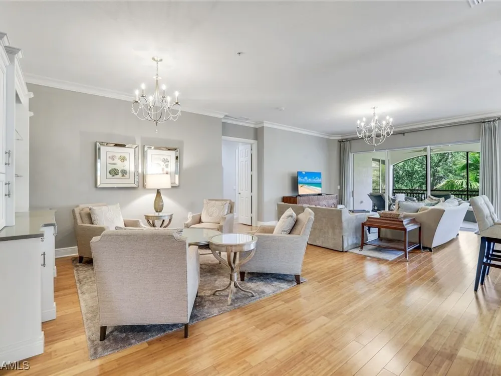 One of the finest second floor end-unit coach homes in Cascada at Fiddler's Creek, offered turnkey with 3 bedrooms, den and 3 full bathrooms. This stunning residence boasts 12-foot custom coffered ceilings, crown molding, hardwood flooring, upgraded carpet in bedrooms & tile flooring throughout. The gourmet kitchen features floor-to-ceiling custom cabinetry, quartz countertops, glass backsplash, Jenn-Air stainless steel appliances with natural gas oven, quartz island for extra seating, and custom bar with built-in wine cooler. The spacious master suite includes coffered ceilings, crown molding, chandelier, and a luxurious ensuite bathroom with dual vanities, upgraded tile flooring, large glass shower, and a soaking tub. Guest bedrooms offer ensuite bathrooms, custom wainscoting, large closets, bunk beds for young guests, and custom draperies. Landscape views from the expansive 12x24 screened lanai that is perfect for entertaining. This elevator-ready home is nestled within the gated Cascada community, offering added privacy. Fiddler's Creek's Club & Spa elevates your lifestyle with a resort-style pool featuring waterfalls, slides, spa, lap lanes, and poolside service, a recently upgraded fitness center, spa, Har-Tru tennis courts, pickleball courts, and dining at Caxambas or the casual Gator Grille. Optional memberships provide access to The Creek Course for golf, The Tarpon Club for Marco Island beach access, and The Tarpon Club Marina for yacht and boat storage. Perfectly located just 7 miles from Marco Island, 10 miles from Naples' 5th Avenue South, and 11 miles from I-75, this home offers unparalleled convenience. Don’t miss this exceptional opportunity to own a luxurious retreat in Fiddler's Creek!
