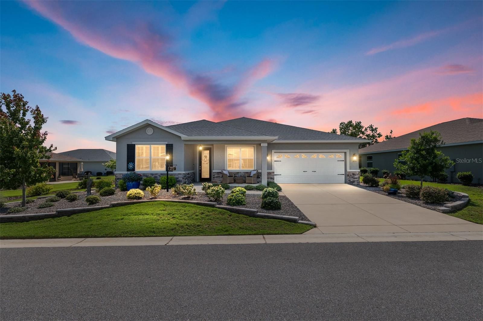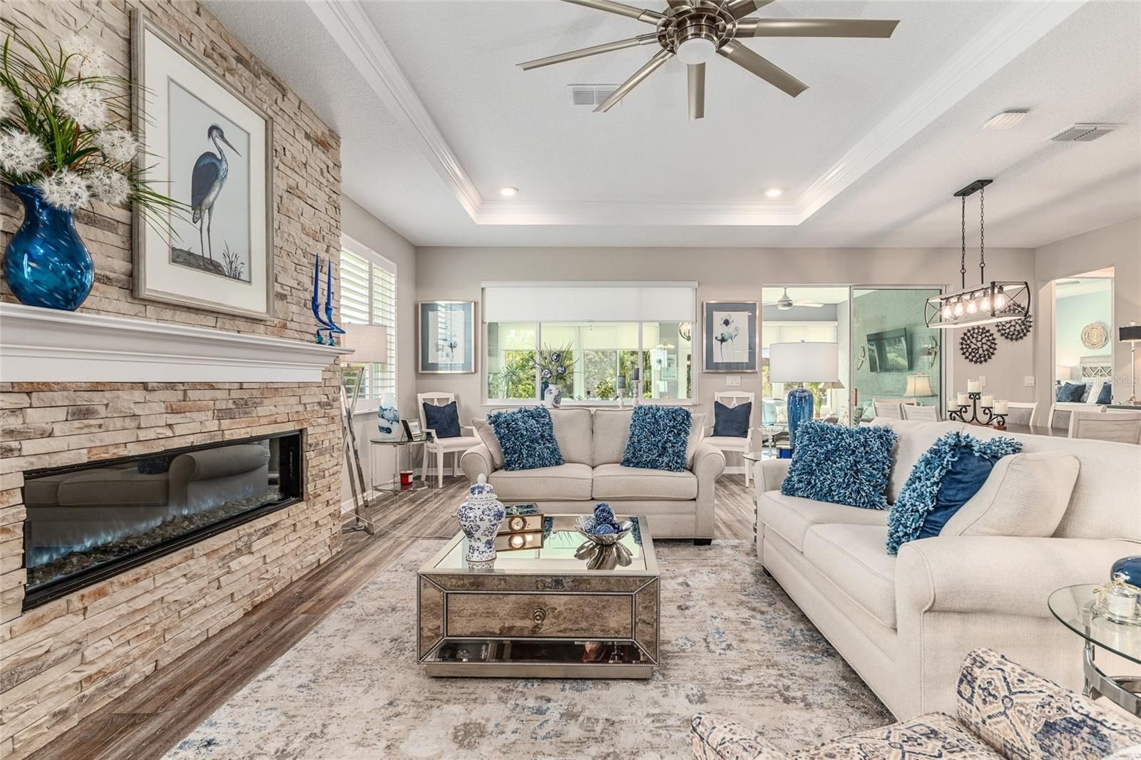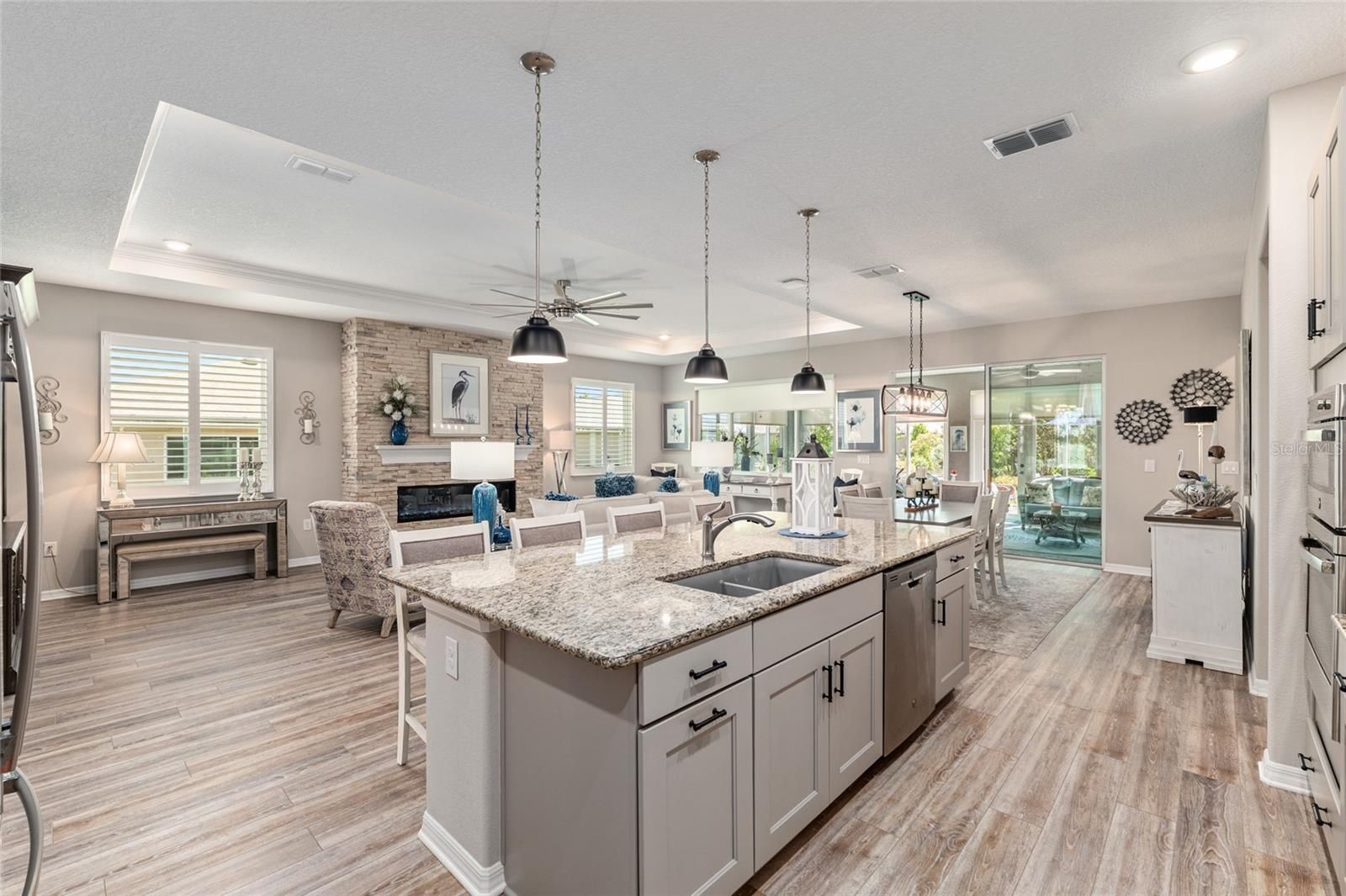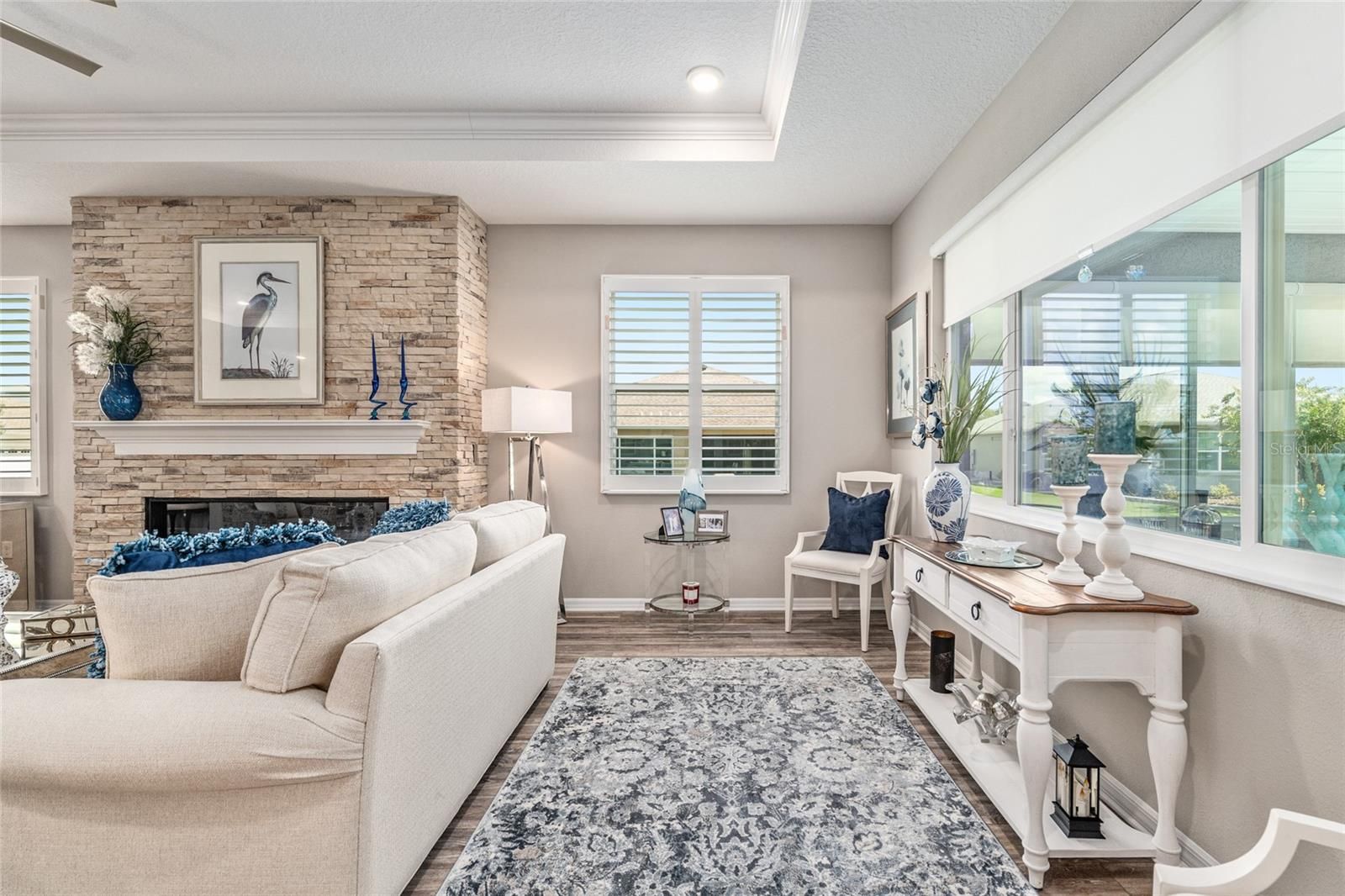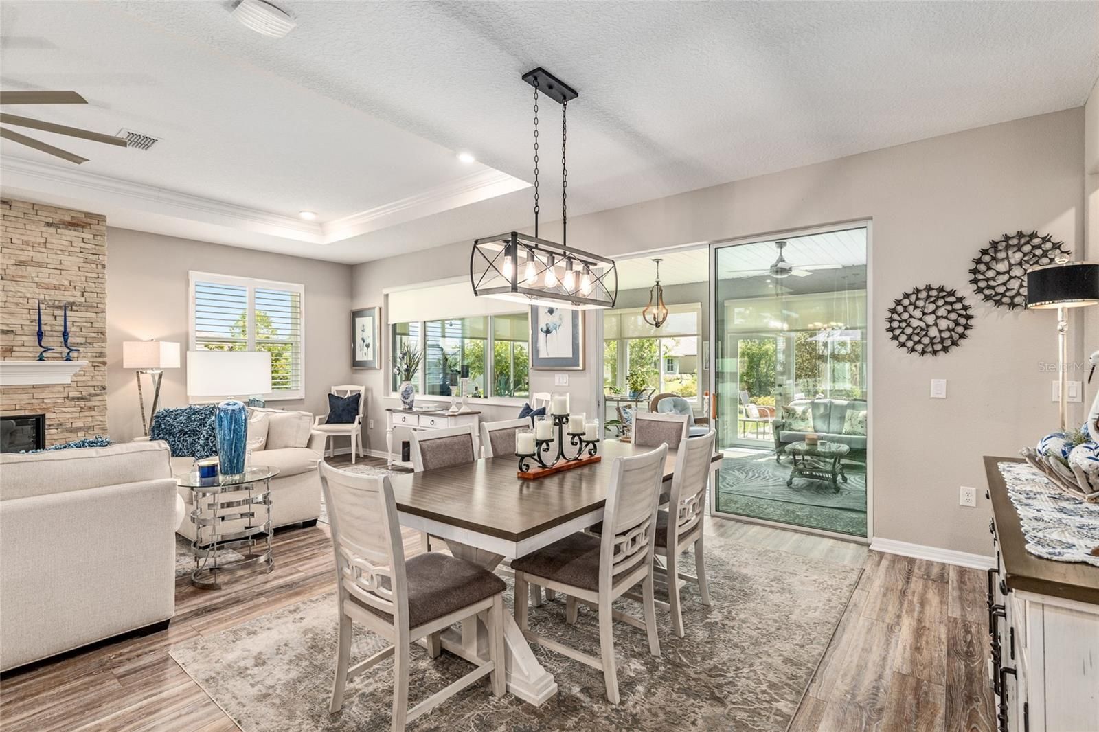 Offering a complimentary 1YR home warranty to the new buyer! If you are looking for an impeccably maintained, styled, and upgraded newer construction home in the Avalon subdivision of On Top of the World - this is it! Nestled on a premium lot with a privately wooded backyard, this 2 bedroom + den, 2 bathroom Ariana model, built in 2021, showcases over 2,000+ sqft of beautifully designed living space. The Florida-inspired interior features high ceilings with various tray detailing, custom Plantation Shutters and shades, brand-new LVP flooring, and fresh paint throughout. The great room greets you with a centerpiece natural stone electric fireplace, perfect for entertaining. Enjoy hosting from your chef’s kitchen, boasting granite countertops, custom wooden cabinetry, GE stainless appliances with gas cooktop, and a large eat-in island. Your private owner’s suite leads to an accessible ensuite bathroom, offering a walk-in shower with bench, dual vanities, and spacious walk-in closet. To the front of the home, you’ll find a separate guest wing with a nearby full bathroom, and a cozy den, ideal for quiet relaxation. Enjoy the sunrise from the comfort of your newly enclosed and insulated extended lanai, or BBQ with friends on the new paver patio surrounded by fresh landscaping. The oversized 2.5-car garage includes golf cart parking, offering plenty of space for your toys and additional storage. Just a short cart ride to OTOW amenities, including The Arbors—this home is the perfect blend of style, comfort, and convenience. Your new lifestyle begins here!
