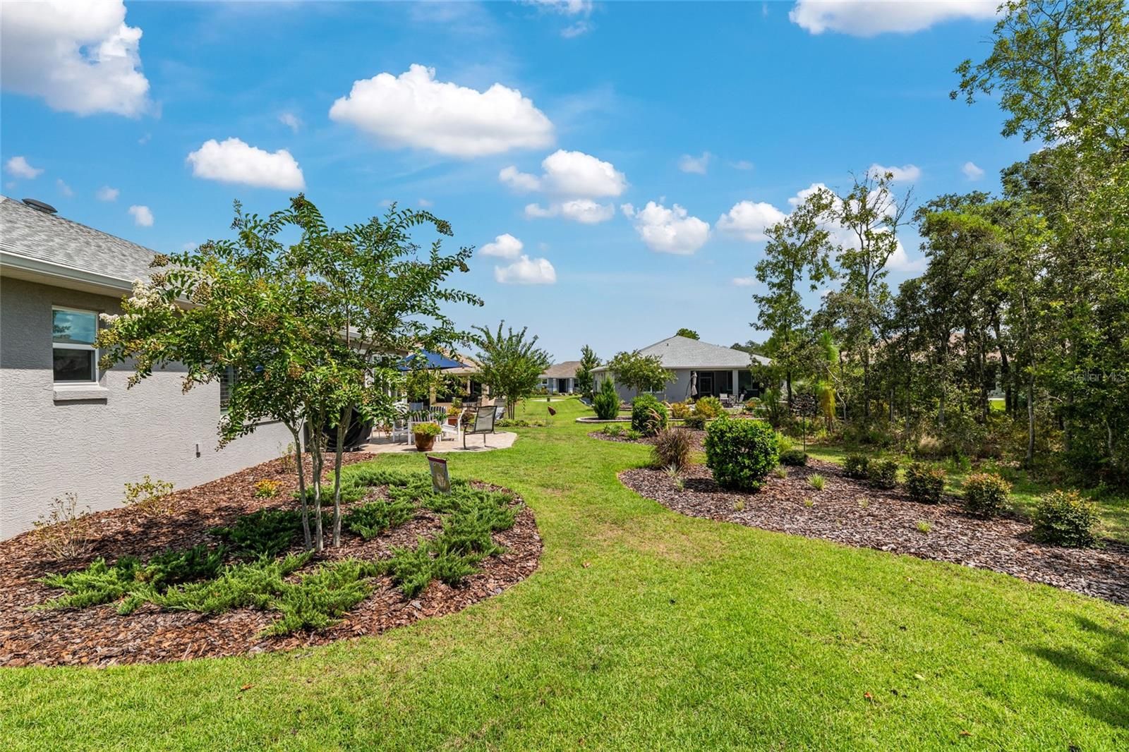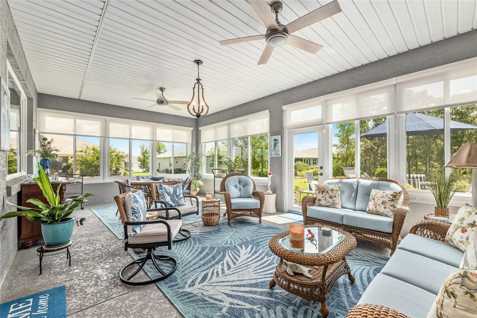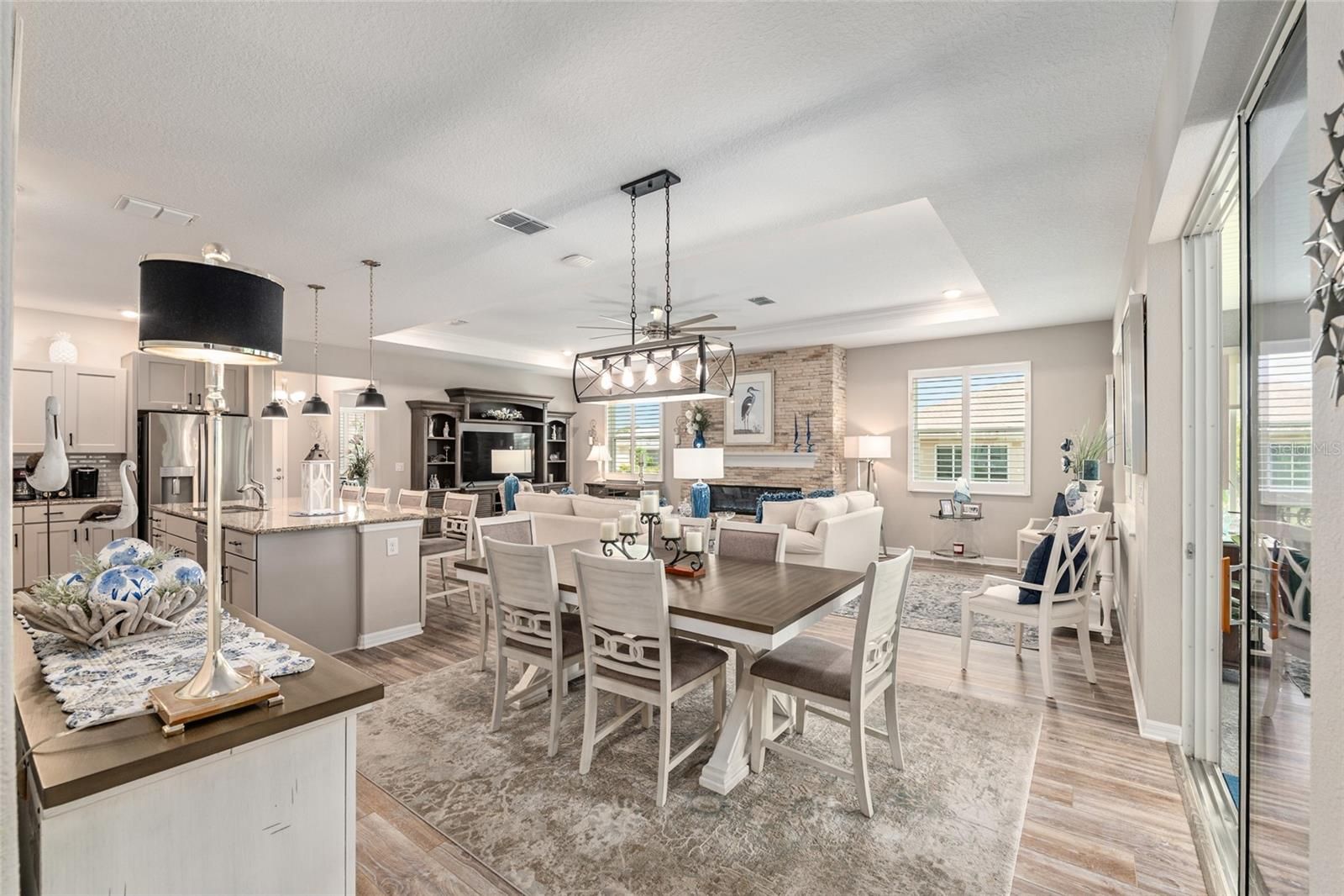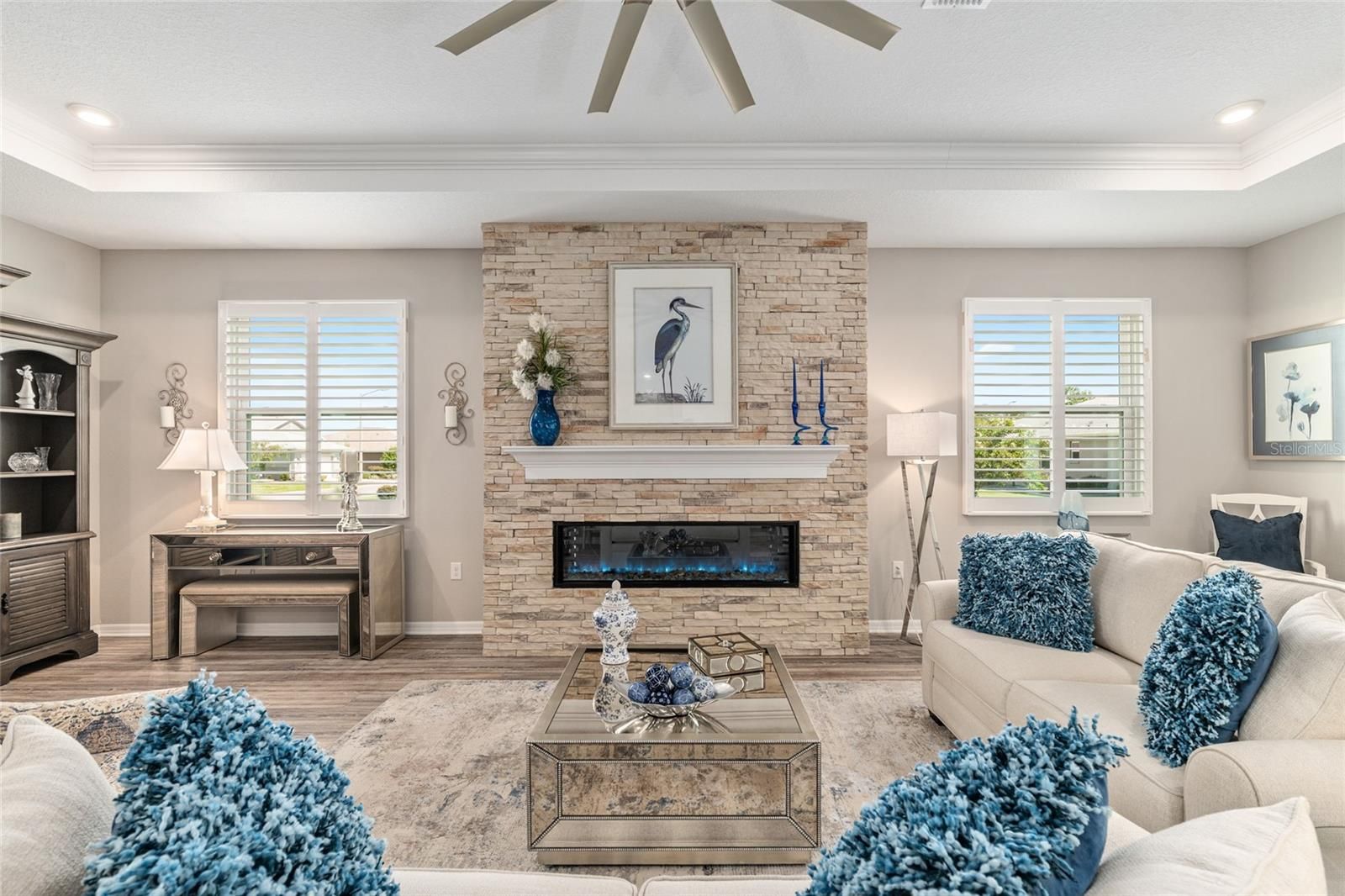 Offering a complimentary 1YR home warranty to the new buyer! If you are looking for an impeccably maintained, styled, and upgraded newer construction home in the Avalon subdivision of On Top of the World - this is it! Nestled on a premium lot with a privately wooded backyard, this 2 bedroom + den, 2 bathroom Ariana model, built in 2021, showcases over 2,000+ sqft of beautifully designed living space. The Florida-inspired interior features high ceilings with various tray detailing, custom Plantation Shutters and shades, brand-new LVP flooring, and fresh paint throughout. The great room greets you with a centerpiece natural stone electric fireplace, perfect for entertaining. Enjoy hosting from your chef’s kitchen, boasting granite countertops, custom wooden cabinetry, GE stainless appliances with gas cooktop, and a large eat-in island. Your private owner’s suite leads to an accessible ensuite bathroom, offering a walk-in shower with bench, dual vanities, and spacious walk-in closet. To the front of the home, you’ll find a separate guest wing with a nearby full bathroom, and a cozy den, ideal for quiet relaxation. Enjoy the sunrise from the comfort of your newly enclosed and insulated extended lanai, or BBQ with friends on the new paver patio surrounded by fresh landscaping. The oversized 2.5-car garage includes golf cart parking, offering plenty of space for your toys and additional storage. Just a short cart ride to OTOW amenities, including The Arbors—this home is the perfect blend of style, comfort, and convenience. Your new lifestyle begins here!