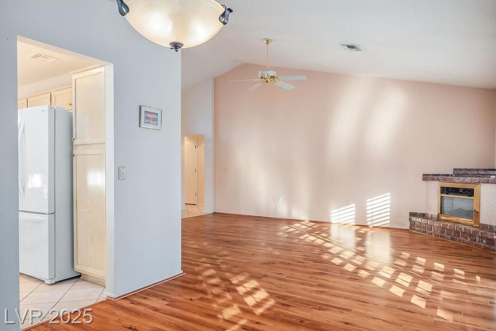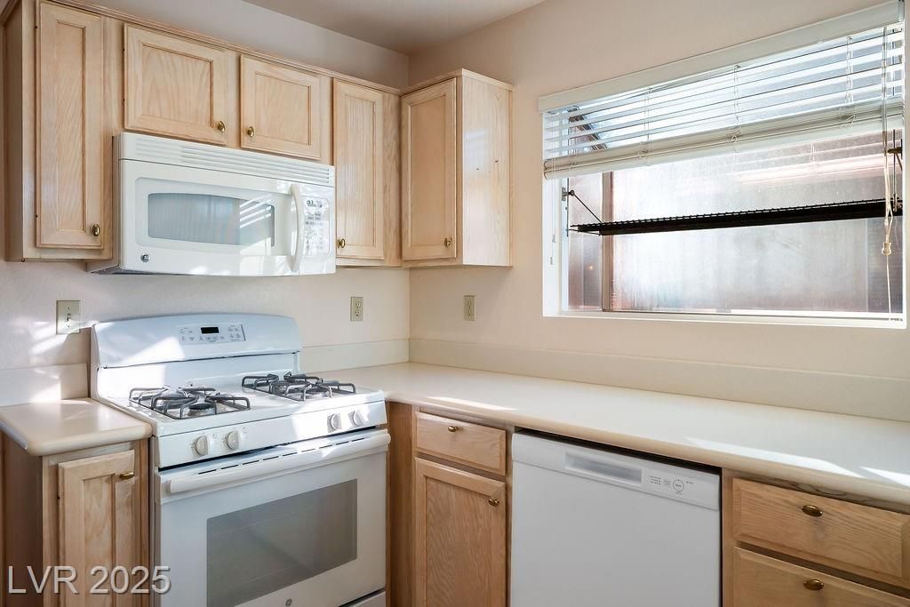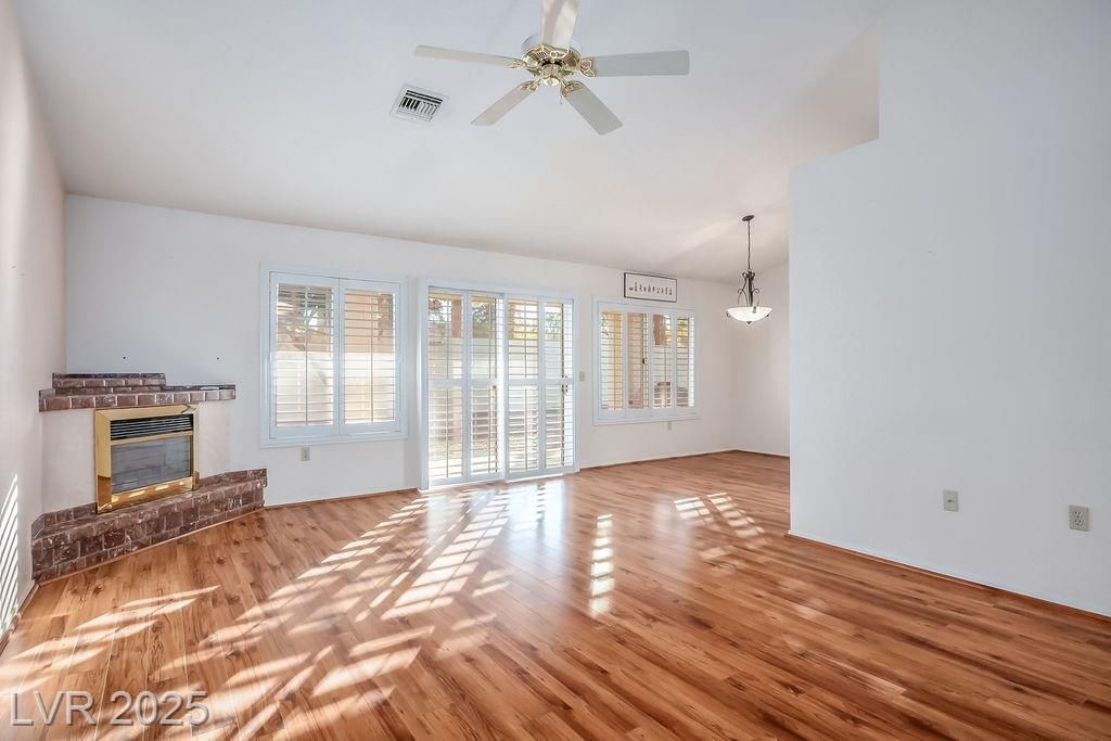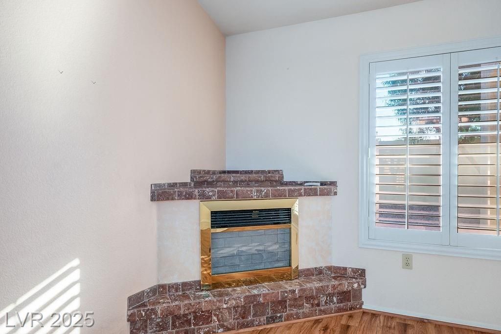 Popular 1,220 sq. ft. Kenwood model town home featuring 2 bedrooms and 2 baths. Enter through a gated courtyard into a well-designed floor plan that flows easily between the living and dining areas. A charming brick-faced fireplace and laminate flooring highlight the main living space, with plantation shutters throughout and tile in the entry and wet areas. The open kitchen features a breakfast bar, an eat-in nook, and a greenhouse window. The roomy primary ensuite offers a bay window, walk-in closet, and shower. The second bedroom includes a custom built-in wall unit with a matching Murphy bed, creating a versatile, multi-functional space. Additional features include ceiling fans throughout for added comfort. Sun City Summerlin is premier 55+ community with 3 golf courses, 4 clubhouses, sports courts, gyms, showroom, restaurants and is located nearby upscale Down Town Summerlin's dining, shopping and entertainment mecca.
