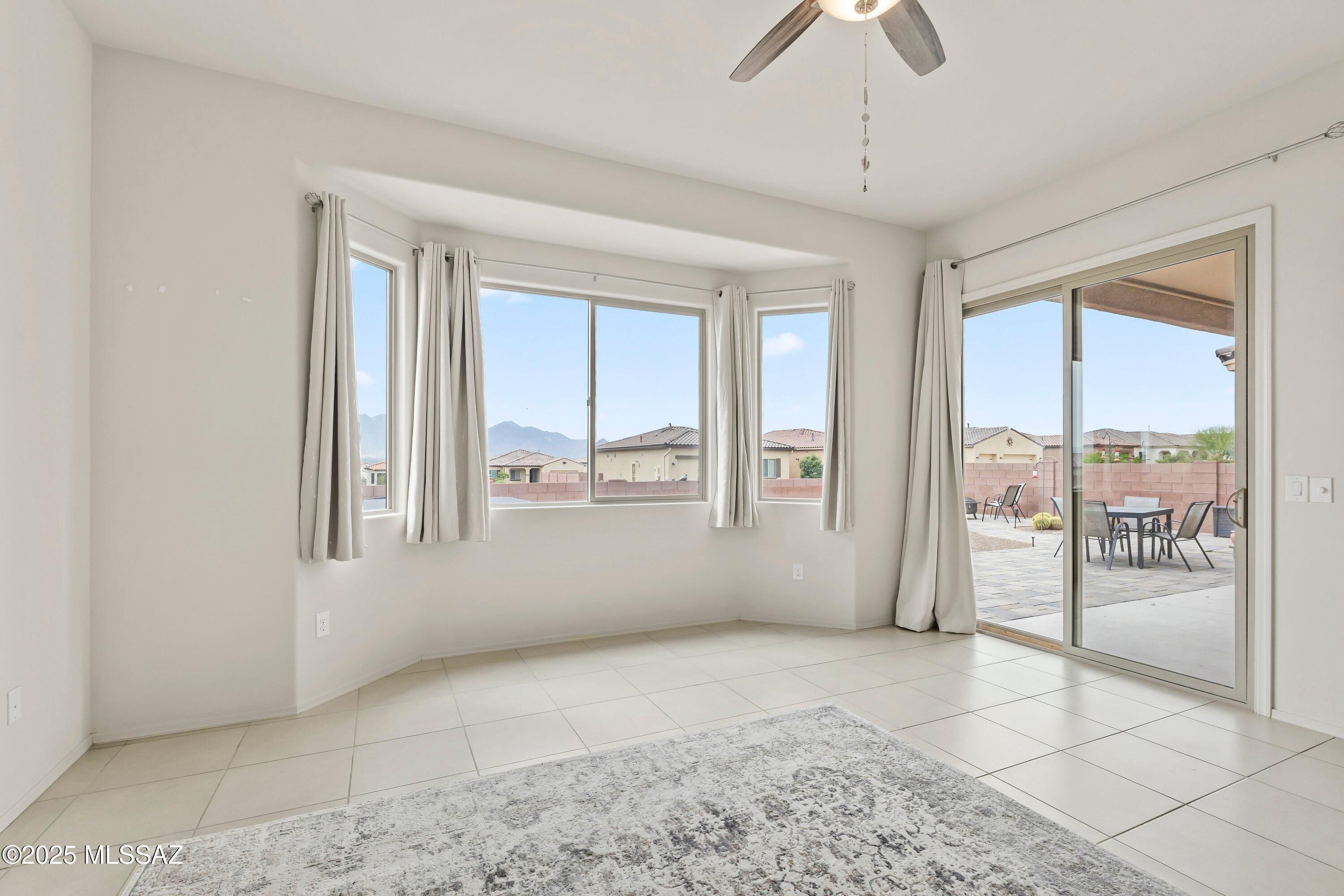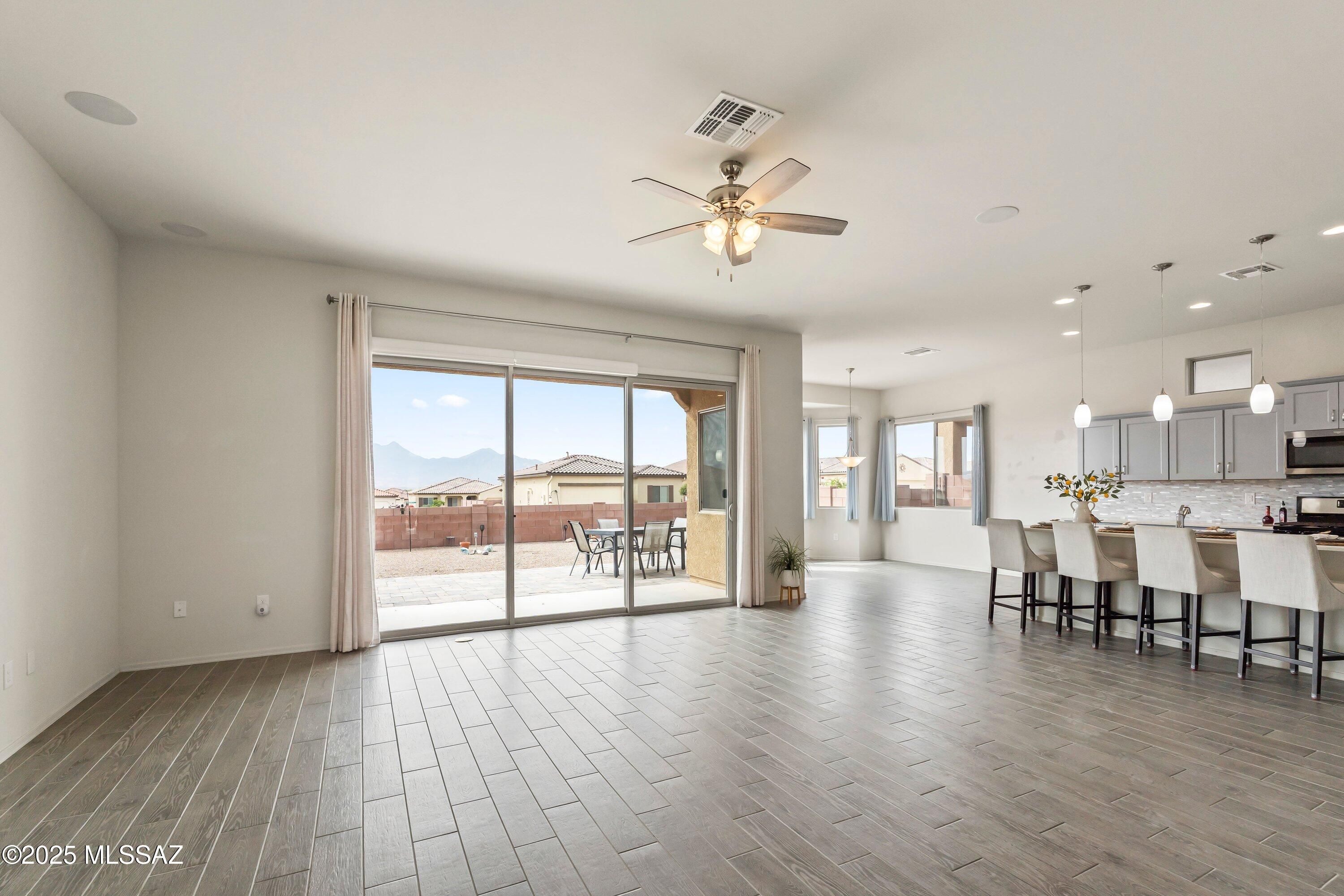 Panoramic Views of the Santa Rita Mountains! Enjoy the views from the Great rooms triple glass patio doors. This expansive Cimarron Model is the perfect plan! The 2025 SQFT home has a large island kitchen with Quartz countertops, Beautiful tiled floors and a carriage garage that is perfect for the golf cart or a hobby room. Better than buying new as the current owners have added $40,135. Worth of additional features to the home, Garage floor epoxy coating, Hanging storage in the garage, Landscaping ($19,332.) Security door at front & security gate in the back. Extension to the block wall, Hot-tub installed! Custom bath large walk-in closet! Covered patio to enjoy the sunrises every morning! HAS GVR