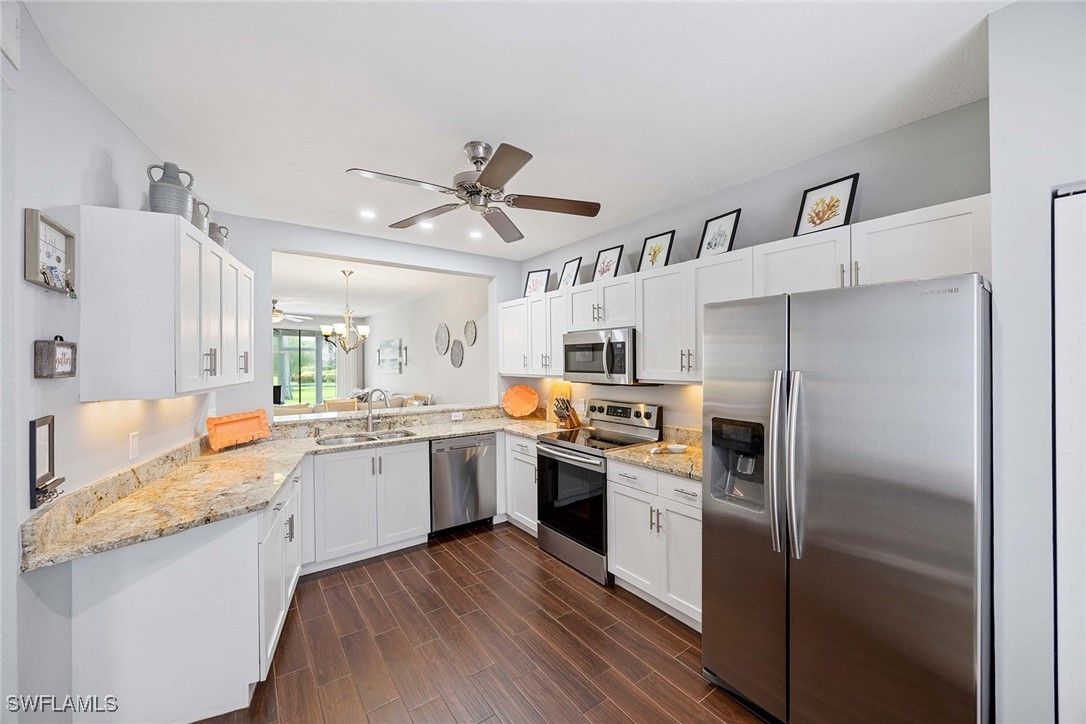 Experience resort-style living in this beautifully updated two-bedroom plus den, two-bath condominium in desirable Sunstone at Lely Resort. This immaculate home features a fully remodeled kitchen with sleek granite countertops, white cabinetry, and stainless steel appliances, ideal for entertaining. Both baths have been thoughtfully renovated, including a luxurious main bath with a modern walk-in shower. The home also had a complete re-pipe done in 2020. Freshly painted in stylish, contemporary tones, the home also boasts an updated HVAC system for added comfort and efficiency. Enjoy serene, landscaped views from the spacious, screened-in lanai, complete with rolldown storm shutters for peace of mind. A one-car garage adds convenience and additional storage. Just a short distance to the large community pool, this condominium is ideal for relaxation and recreation. Ownership includes the option to join the prestigious Players Club & Spa, featuring three resort-style pools, 13 tennis courts, a full-service spa and fitness center, indoor and outdoor dining, a tiki bar and a full calendar of social events. Lely Resort is also home to three championship golf courses. Just minutes from Naples’ world-class beaches, shopping and dining, this is a must-see property for anyone seeking a move-in ready, low-maintenance home in one of Southwest Florida’s vibrant communities.