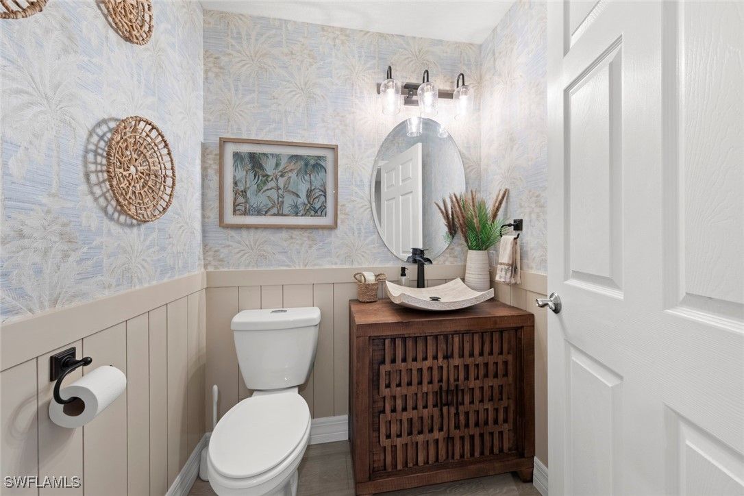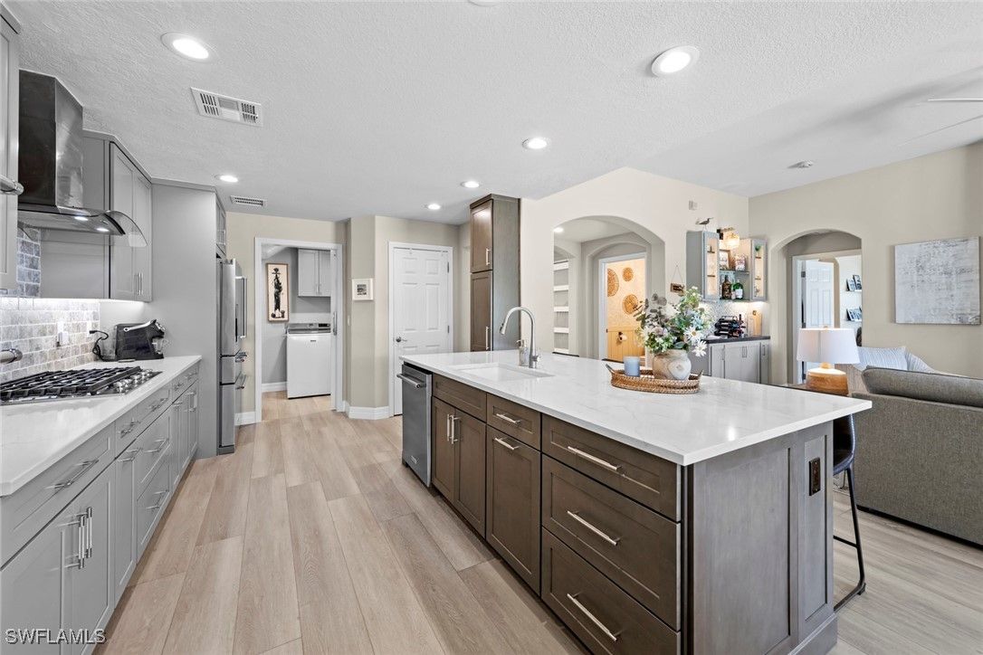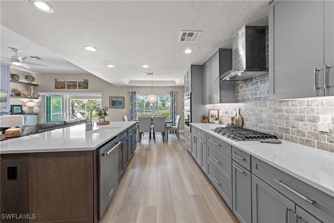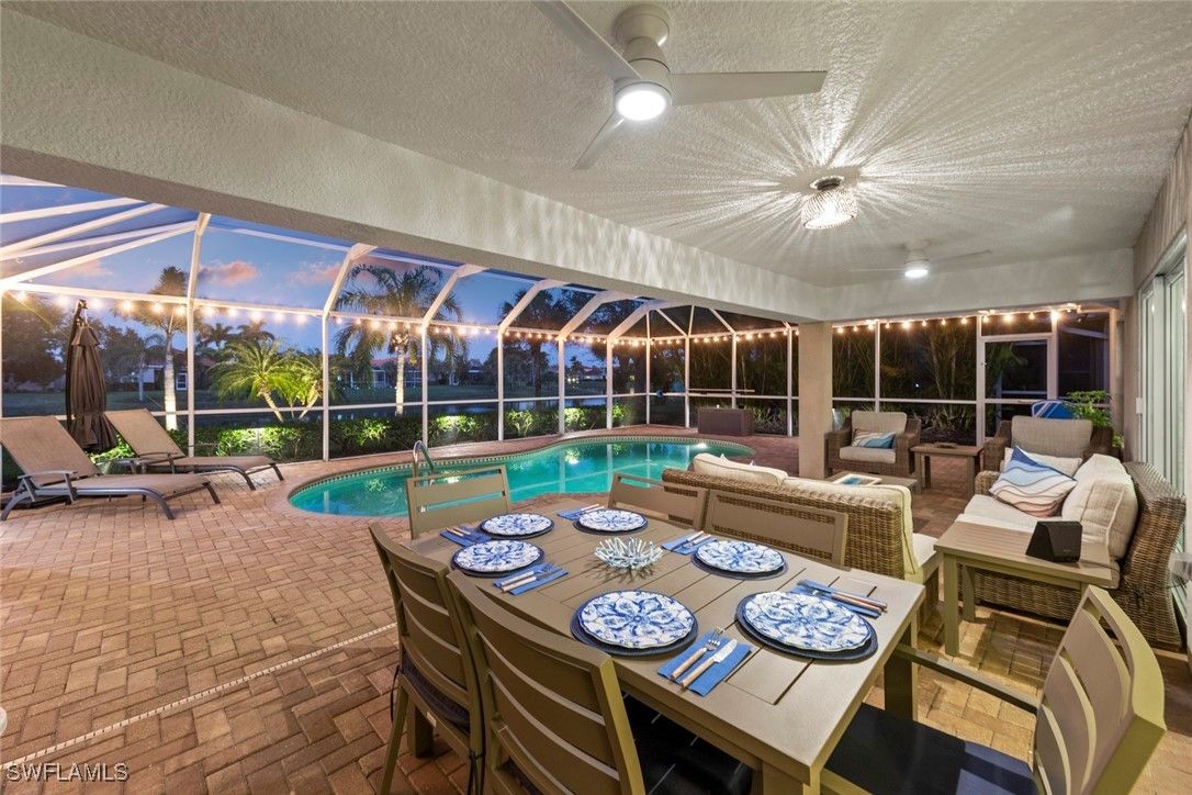 Welcome to 9063 Astonia Way in The Reserve at Estero—a newly renovated, meticulously maintained residence that lives like a model home, unlike any other in the community. This 4-bedroom, 2.5-bath home offers a thoughtful layout with a first-floor master suite, a dedicated office/hobby space, and a versatile loft, combining custom luxury with everyday functionality. Inside, you'll find a completely reimagined interior featuring IMPACT-RESISTANT WINDOWS, fresh paint, and new flooring throughout. The heart of the home is a professionally designed custom kitchen, beautifully outfitted with all-new KitchenAid appliances, sleek cabinetry, and stylish finishes, while the renovated laundry room adds function and ease with built-in storage and a second refrigerator for convenience. The custom office/hobby space provides the ideal setting for productivity or creativity, and the living area is anchored by a fireplace with a handcrafted mantle and built-in shelving, adjacent to a dry bar with custom cabinetry and backsplash—perfect for entertaining. The FIRST-FLOOR master suite is a true retreat with private access to the lanai, dual vanities, spacious closets, and a large walk-in shower. Upstairs, three generously sized bedrooms and a flexible loft area offer endless possibilities for relaxation, recreation, or additional workspace. Step outside to your private outdoor oasis featuring a covered lanai, custom outdoor kitchen with grill and refrigerator, and a sparkling saltwater pool overlooking the serene water view. The pool is heated by a BRAND-NEW natural gas Pentair Bluetooth heater, a premium system that ensures year-round enjoyment. The tranquil setting is enhanced by lush, mature landscaping and upgraded landscape lighting, creating an inviting ambiance both day and night. Additional upgrades include a WHOLE-HOUSE NATURAL GAS GENERATOR and two newer A/C units (2019), all situated in Flood Zone X. Located in The Reserve at Estero, a guarded, gated community WEST of 75 with resort-style amenities including an updated clubhouse, fitness center, tennis courts, pool, and playground. Prime location between Naples and Fort Myers, close to Coconut Point Mall, RSW Airport, FGCU, top-rated golf courses, and the beautiful Gulf beaches.