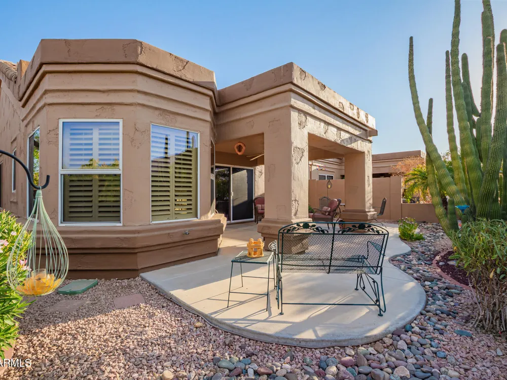 Experience easy living in this lovely townhome in Westbrook Village! Inside, a nice foyer invites you to the spacious living areas featuring travertine tile, vaulted ceilings, plantation shutters, and neutral paint. The impeccable kitchen showcases a custom backsplash, cabinetry with crown molding, granite countertops, and stainless steel appliances. Double doors lead to the main retreat, offering carpeting underfoot for comfort, a walk-in closet, and a bathroom with an oversized dual-sink vanity. Sip your morning brew under the covered patio and enjoy weekend grills complemented with a soothing desert landscape. Take advantage of the resort style community amenities, including a pool, spa, pickle ball courts, golf course, dining and so much more! Don't miss it!