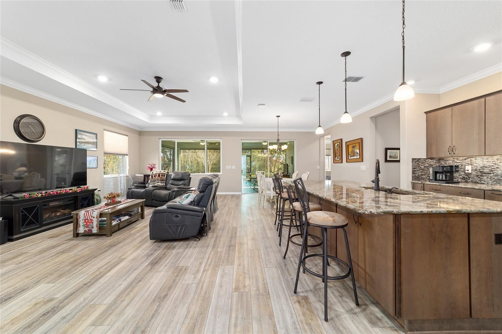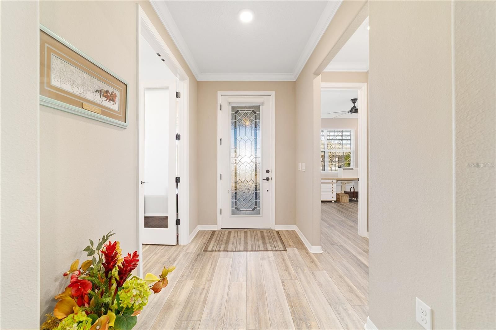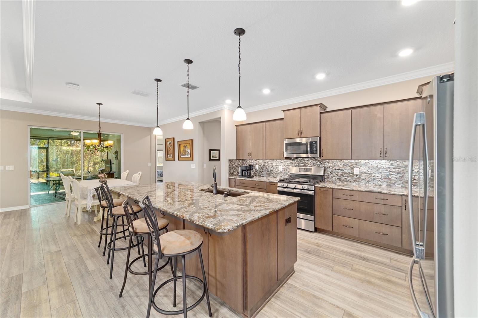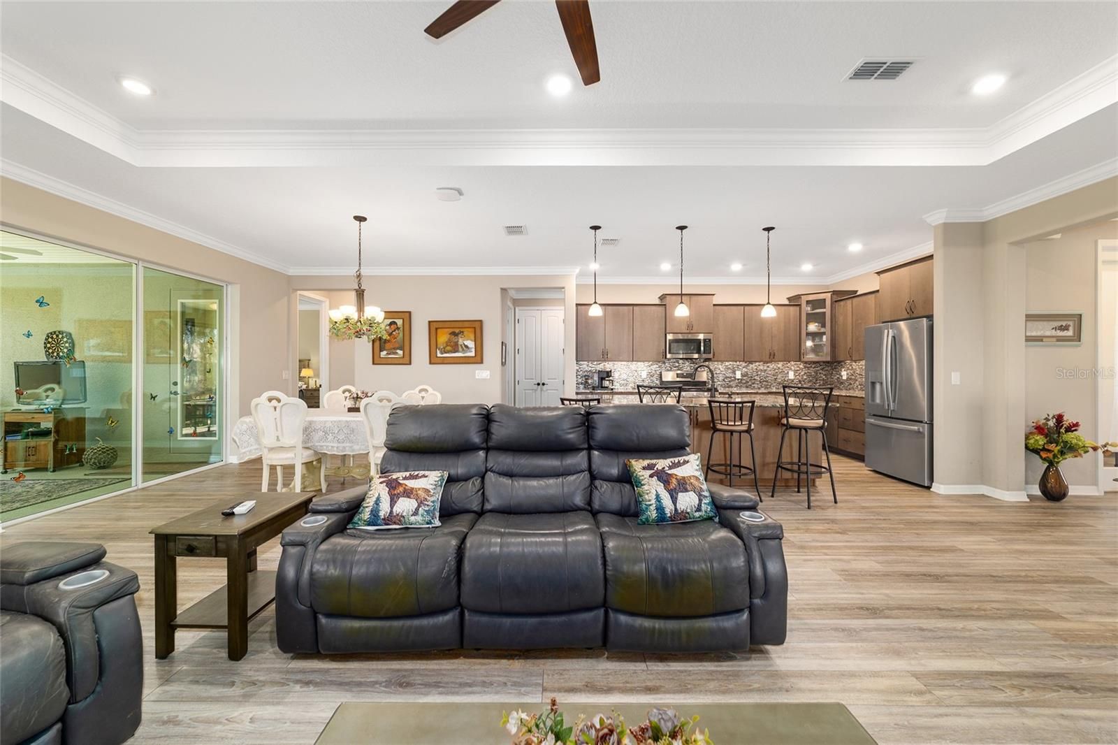 Rare find in the sought-after On Top of the World community! This private, wooded homesite showcases a beautifully maintained 2021-built Ariana floor plan offering 2 bedrooms, 2 bathrooms, a versatile flex room, and an extended 2-car garage with epoxy flooring. Charming curb appeal welcomes you into a bright foyer accented with crown molding and luxury vinyl plank flooring that flows throughout the home. To the right, French doors with CUSTOM blinds and built in cabinets,open to a flexible space ideal for a home office, den, or hobby room. To the left, a spacious guest bedroom is conveniently located near a full guest bathroom, creating a comfortable retreat for visitors. The open-concept kitchen and living area is perfect for everyday living and entertaining. The kitchen features quartz countertops, a large island with double-sided cabinetry, staggered cabinets, soft-close drawers and doors, under-cabinet lighting, a pantry, pendant lighting, and a gas range. The living area is highlighted by a tray ceiling with double crown molding and expansive panoramic windows that flood the space with natural light and offer serene wooded views. Tucked away at the rear of the home for privacy, the owner’s suite offers a tray ceiling with crown molding, a lighted ceiling fan, panoramic windows, and direct access to the lanai. The spa-inspired owner’s bath includes dual sinks with upgraded quartz countertops, a roll-in shower, and a custom walk-in closet with built-in shelving. A convenient door connects the closet directly to the laundry room. This thoughtfully designed home combines style, comfort, and functionality in a tranquil setting—perfect for enjoying the best of Florida living.