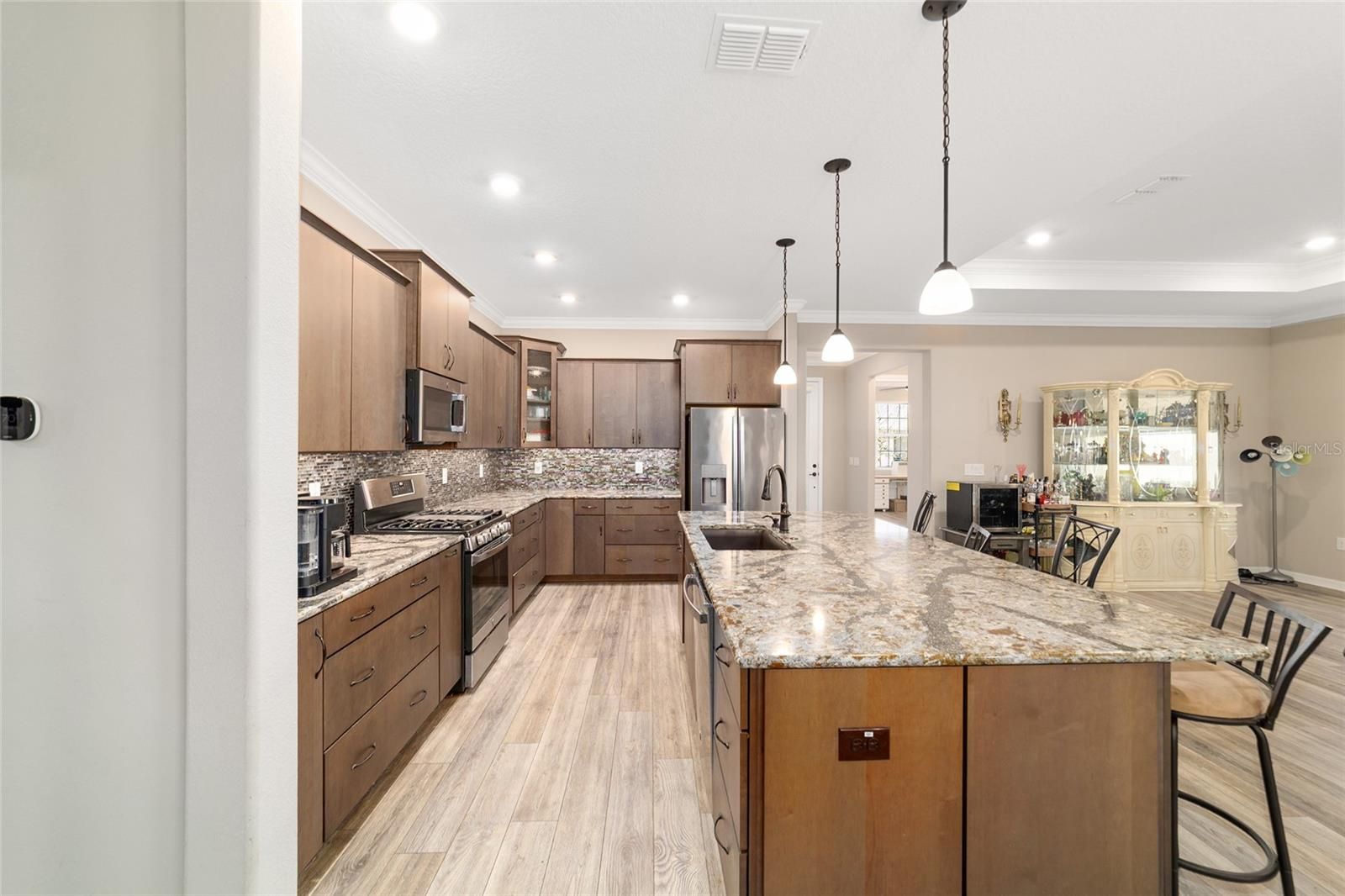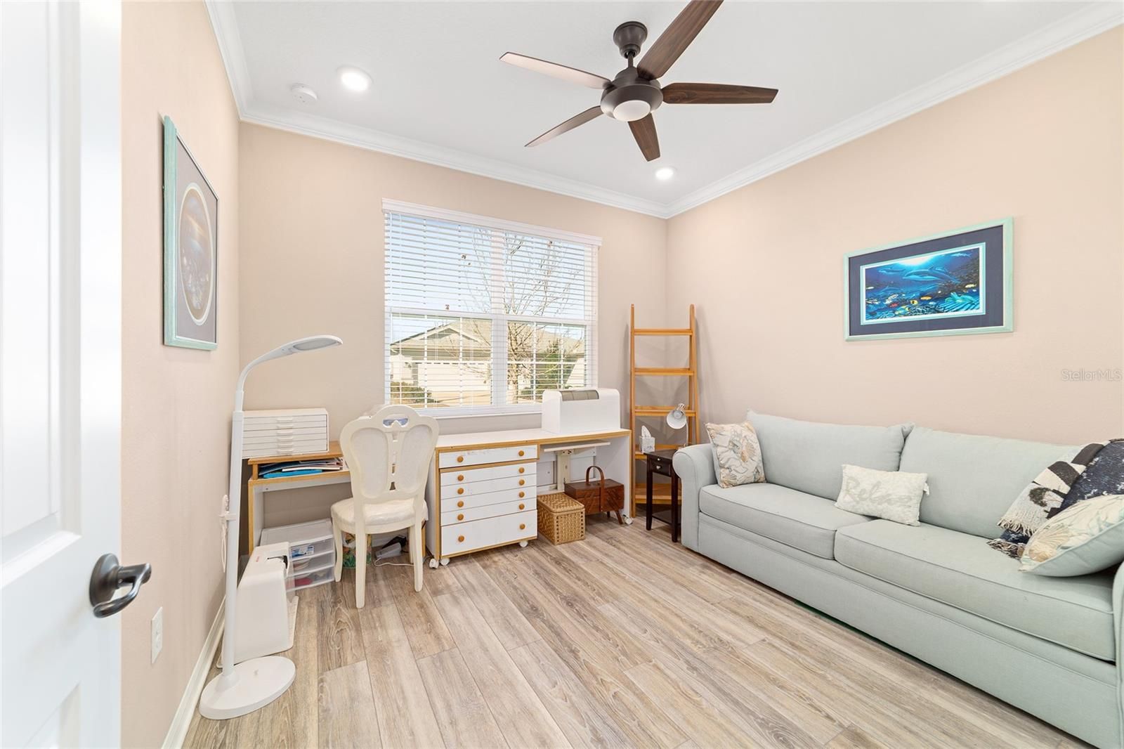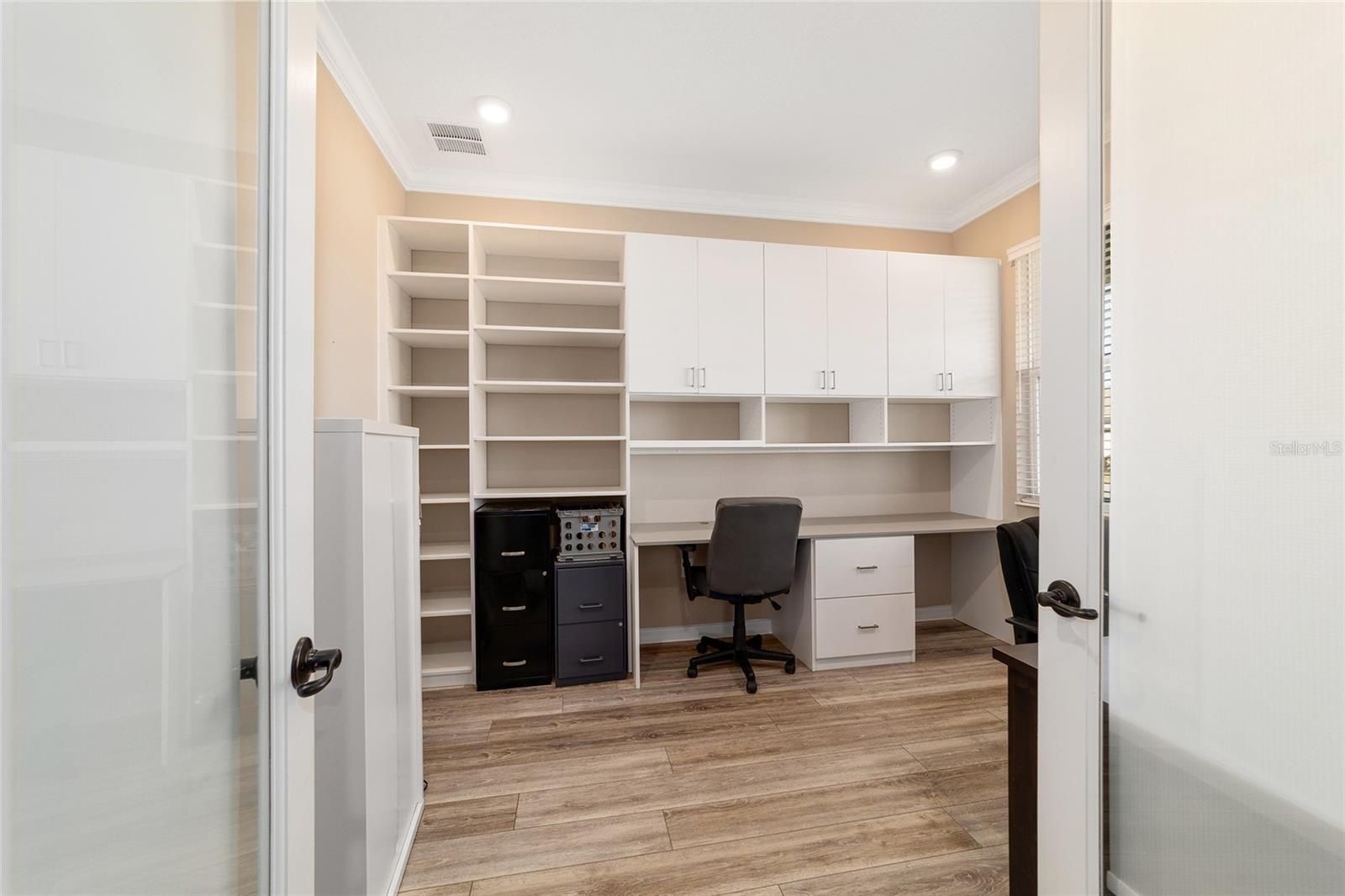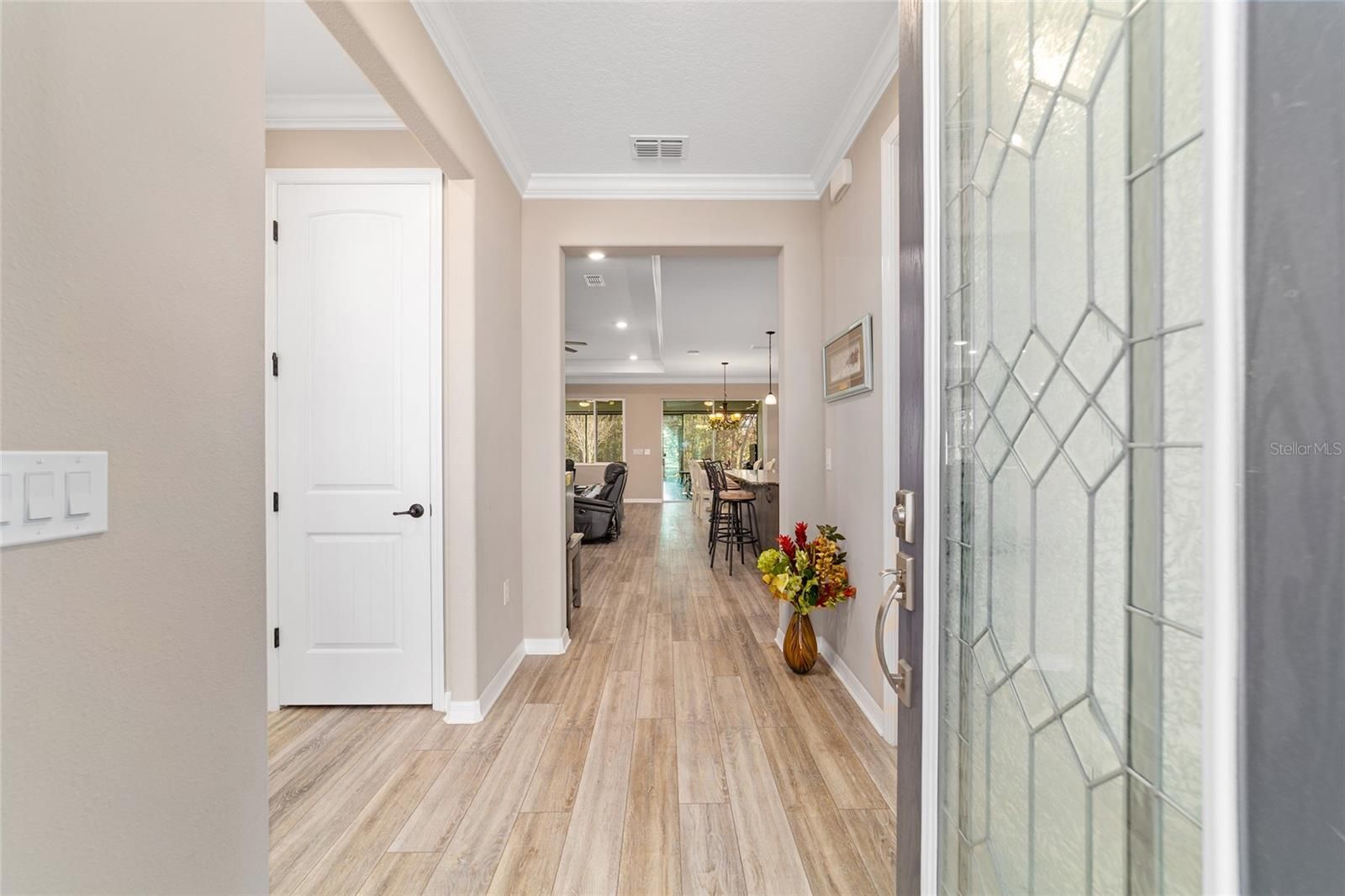 Rare find in the sought-after On Top of the World community! This private, wooded homesite showcases a beautifully maintained 2021-built Ariana floor plan offering 2 bedrooms, 2 bathrooms, a versatile flex room, and an extended 2-car garage with epoxy flooring. Charming curb appeal welcomes you into a bright foyer accented with crown molding and luxury vinyl plank flooring that flows throughout the home. To the right, French doors with CUSTOM blinds and built in cabinets,open to a flexible space ideal for a home office, den, or hobby room. To the left, a spacious guest bedroom is conveniently located near a full guest bathroom, creating a comfortable retreat for visitors. The open-concept kitchen and living area is perfect for everyday living and entertaining. The kitchen features quartz countertops, a large island with double-sided cabinetry, staggered cabinets, soft-close drawers and doors, under-cabinet lighting, a pantry, pendant lighting, and a gas range. The living area is highlighted by a tray ceiling with double crown molding and expansive panoramic windows that flood the space with natural light and offer serene wooded views. Tucked away at the rear of the home for privacy, the owner’s suite offers a tray ceiling with crown molding, a lighted ceiling fan, panoramic windows, and direct access to the lanai. The spa-inspired owner’s bath includes dual sinks with upgraded quartz countertops, a roll-in shower, and a custom walk-in closet with built-in shelving. A convenient door connects the closet directly to the laundry room. This thoughtfully designed home combines style, comfort, and functionality in a tranquil setting—perfect for enjoying the best of Florida living.